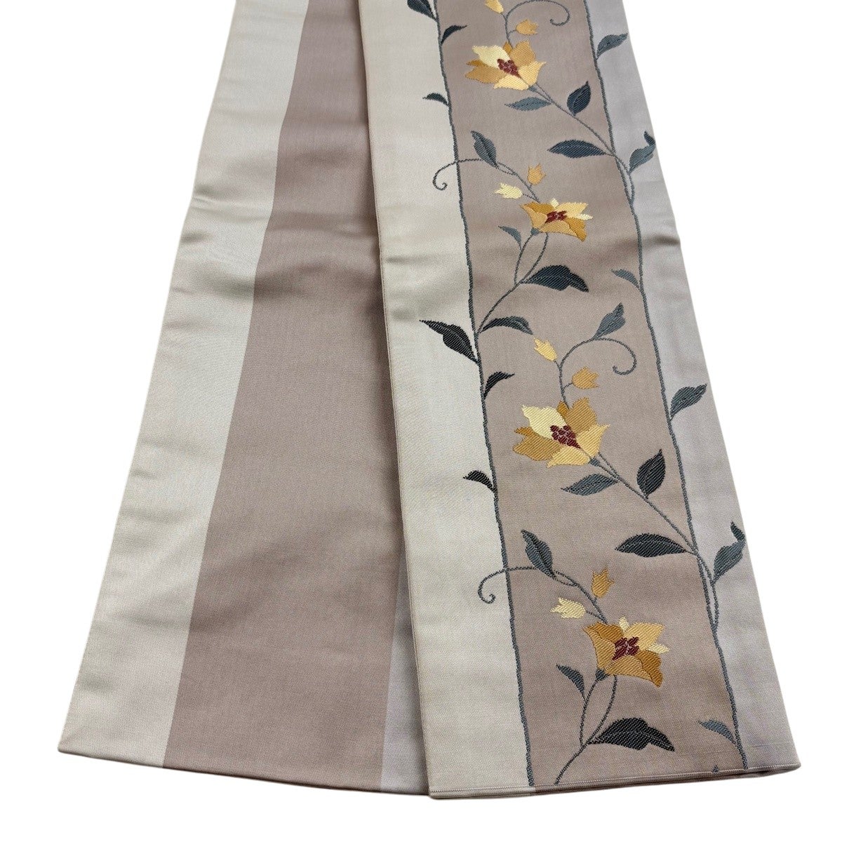 名古屋帯 秀品 草花 刺繍 金糸 灰茶 正絹