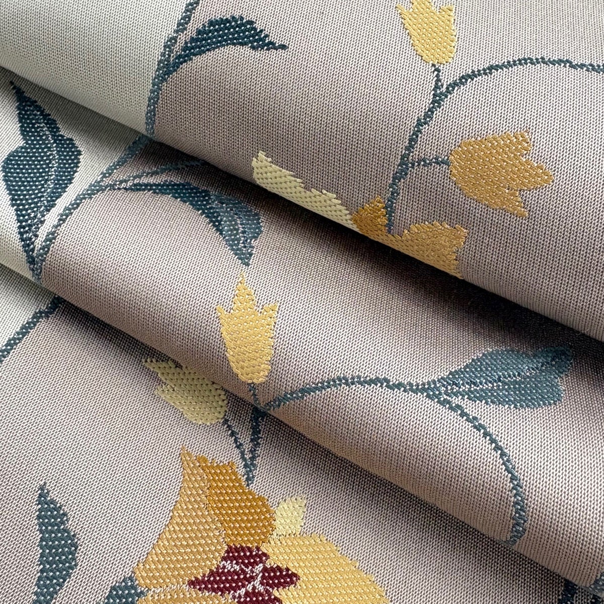 名古屋帯 秀品 草花 幾何学 縮緬 灰茶 正絹