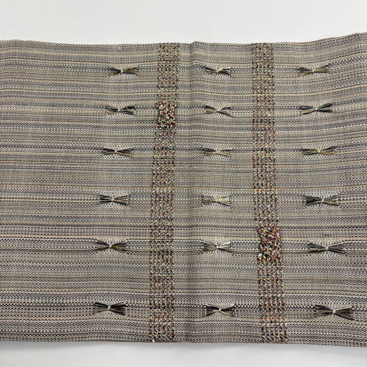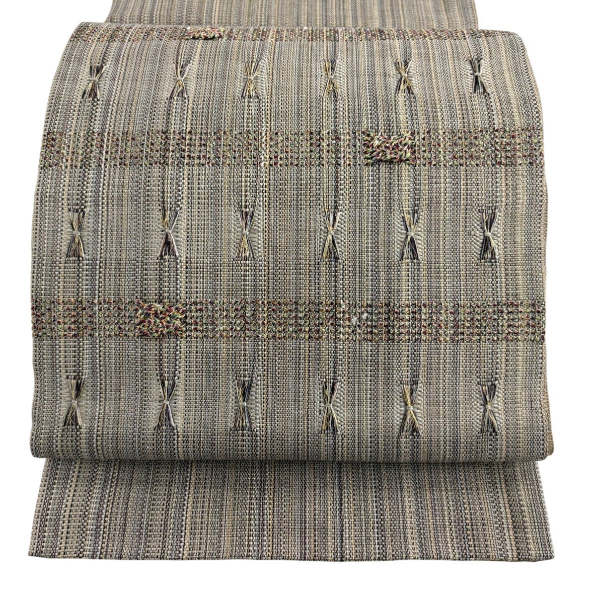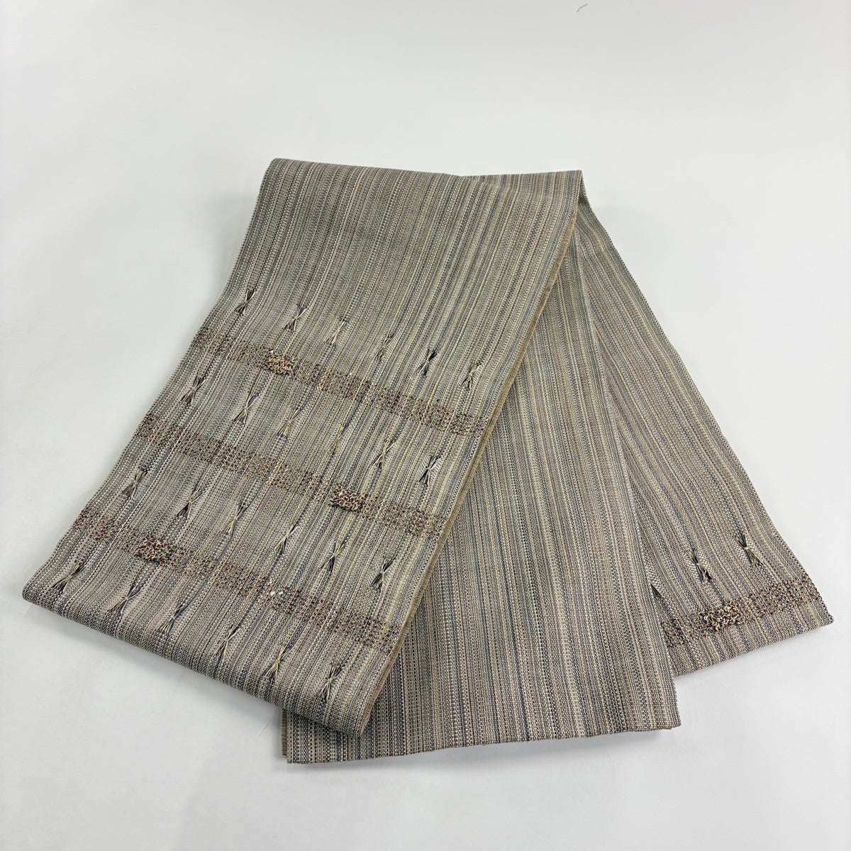 袋帯 秀品 紬地 扇 草花 刺繍 灰茶 お太鼓柄 正絹