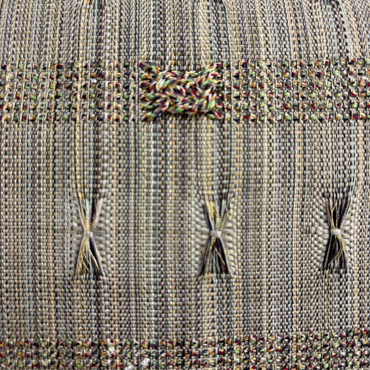 袋帯 秀品 縞 幾何学 金糸 刺繍 灰茶 お太鼓柄 正絹