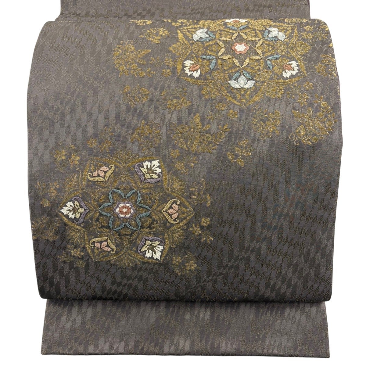 30%OFF 袋帯 秀品 丸文 幾何学模様 金銀糸 箔 灰茶 六通 正絹 K30