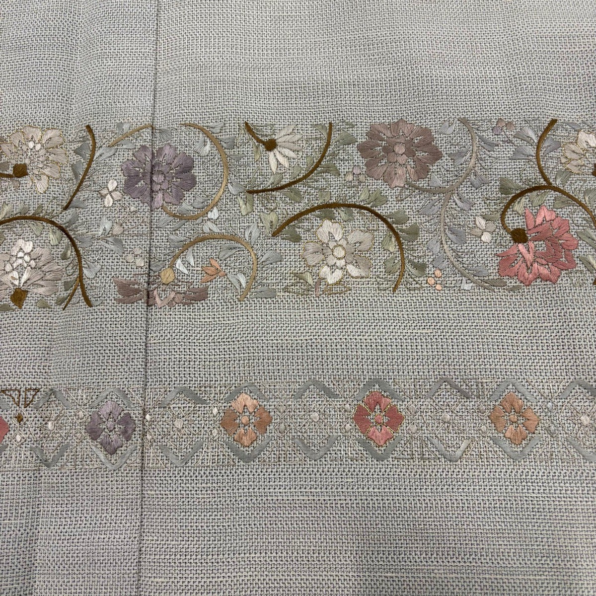 50%OFF 小紋 身丈156.5cm 裄丈65.5cm M 単衣 紬地 麻の葉 刺し子刺繍 灰茶 正絹 名品 K50