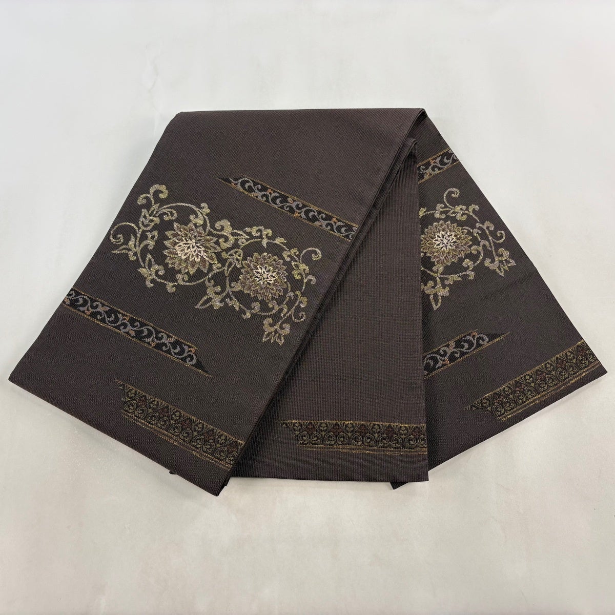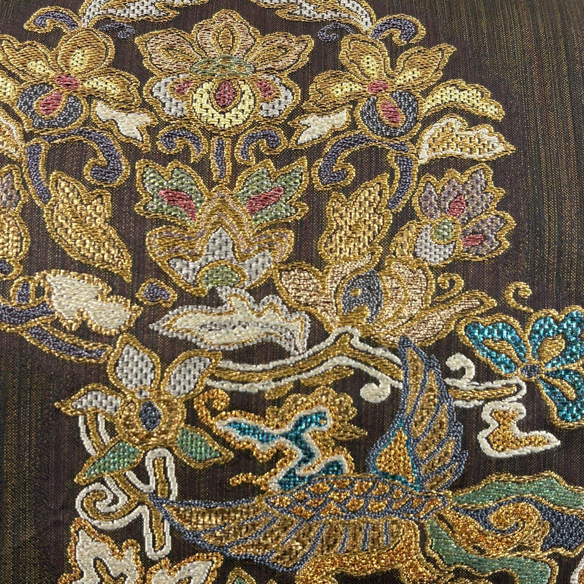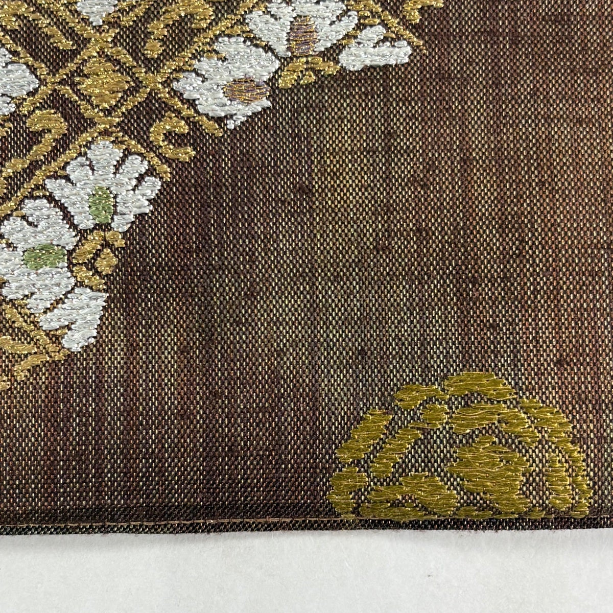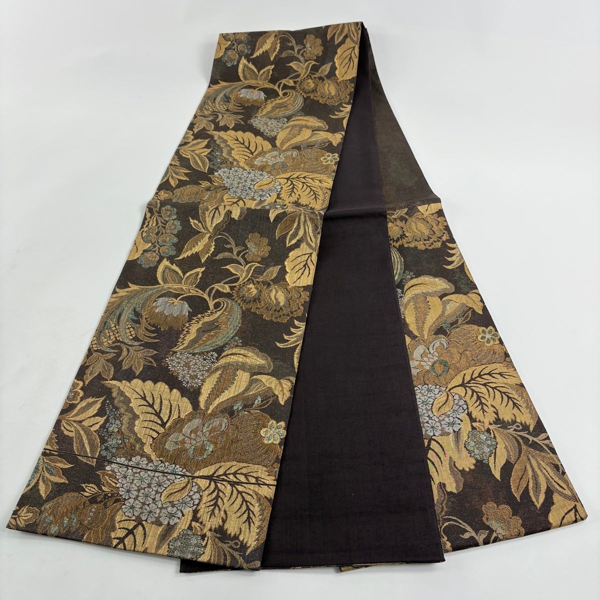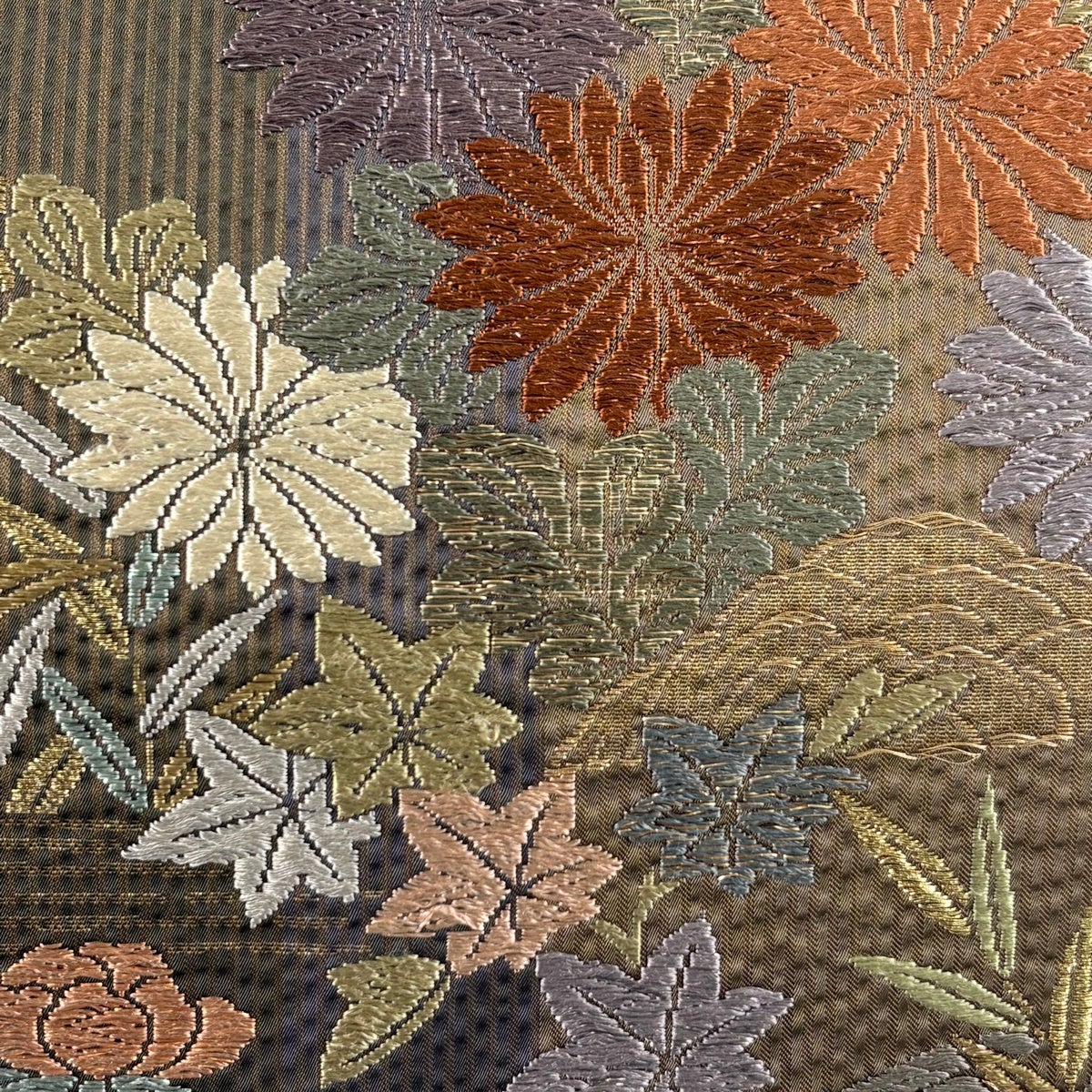 【美品】 袋帯 秀品 華文 草花 金糸 箔 焦茶色 六通 正絹