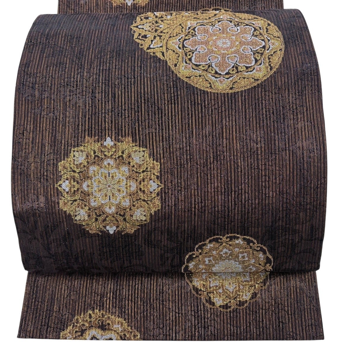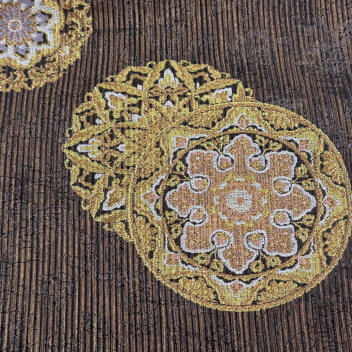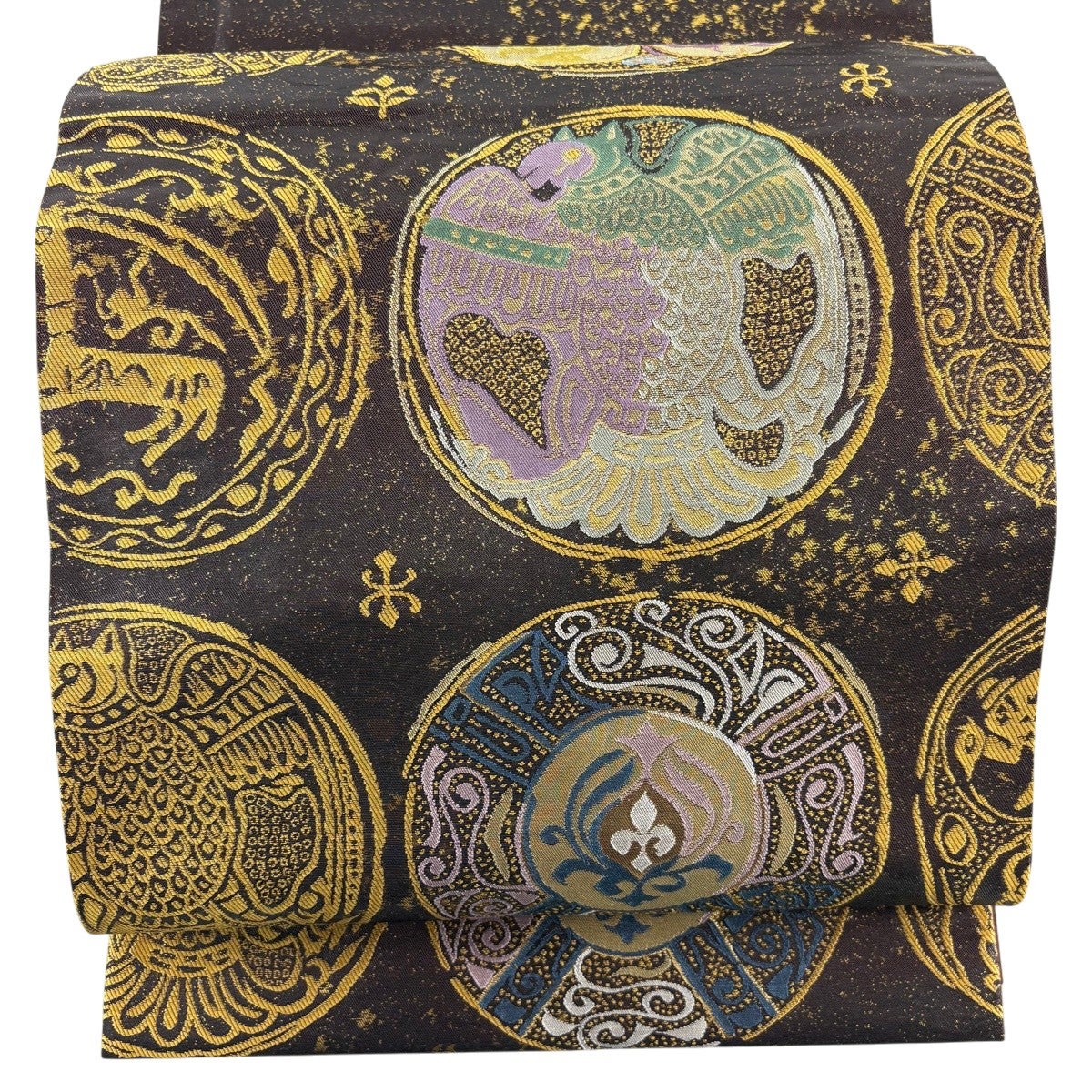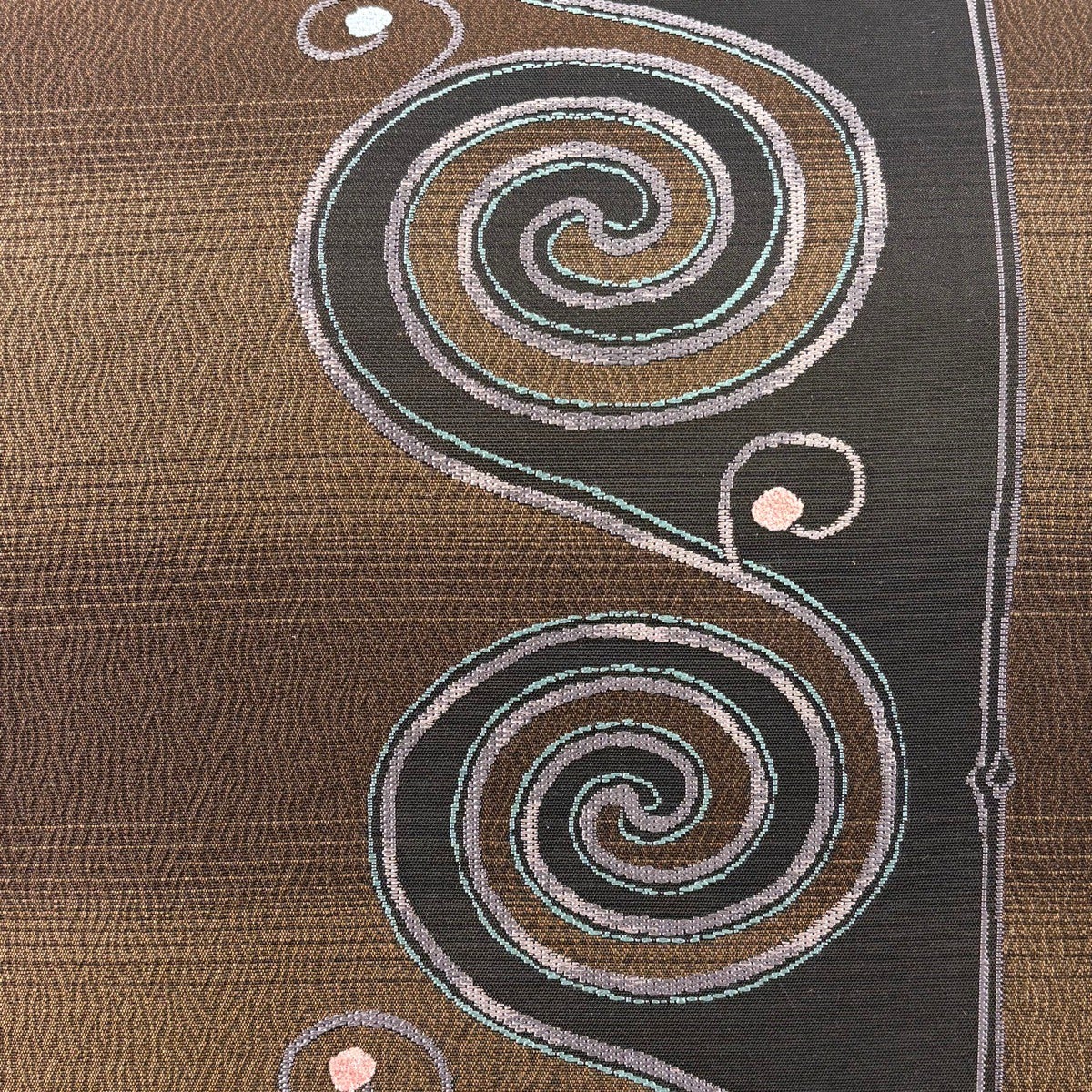 袋帯 名品 丸文 幾何学模様 箔 ラメ糸 焦茶色 六通 正絹