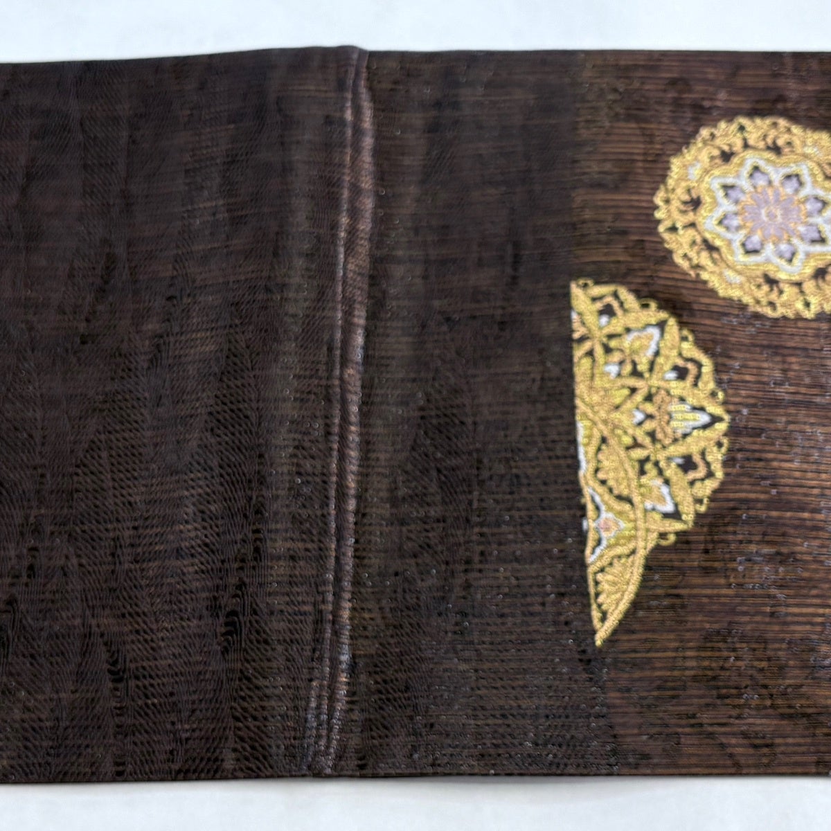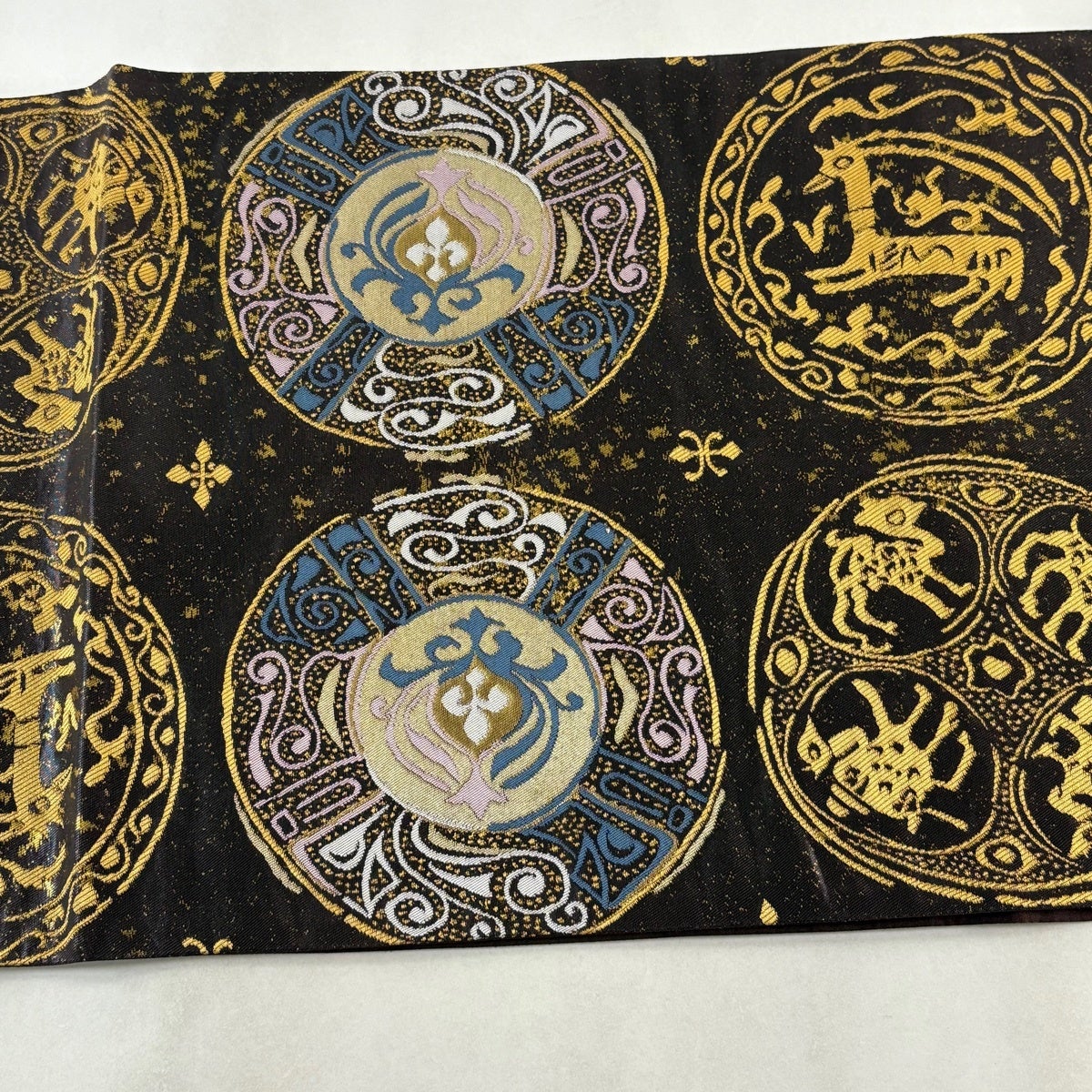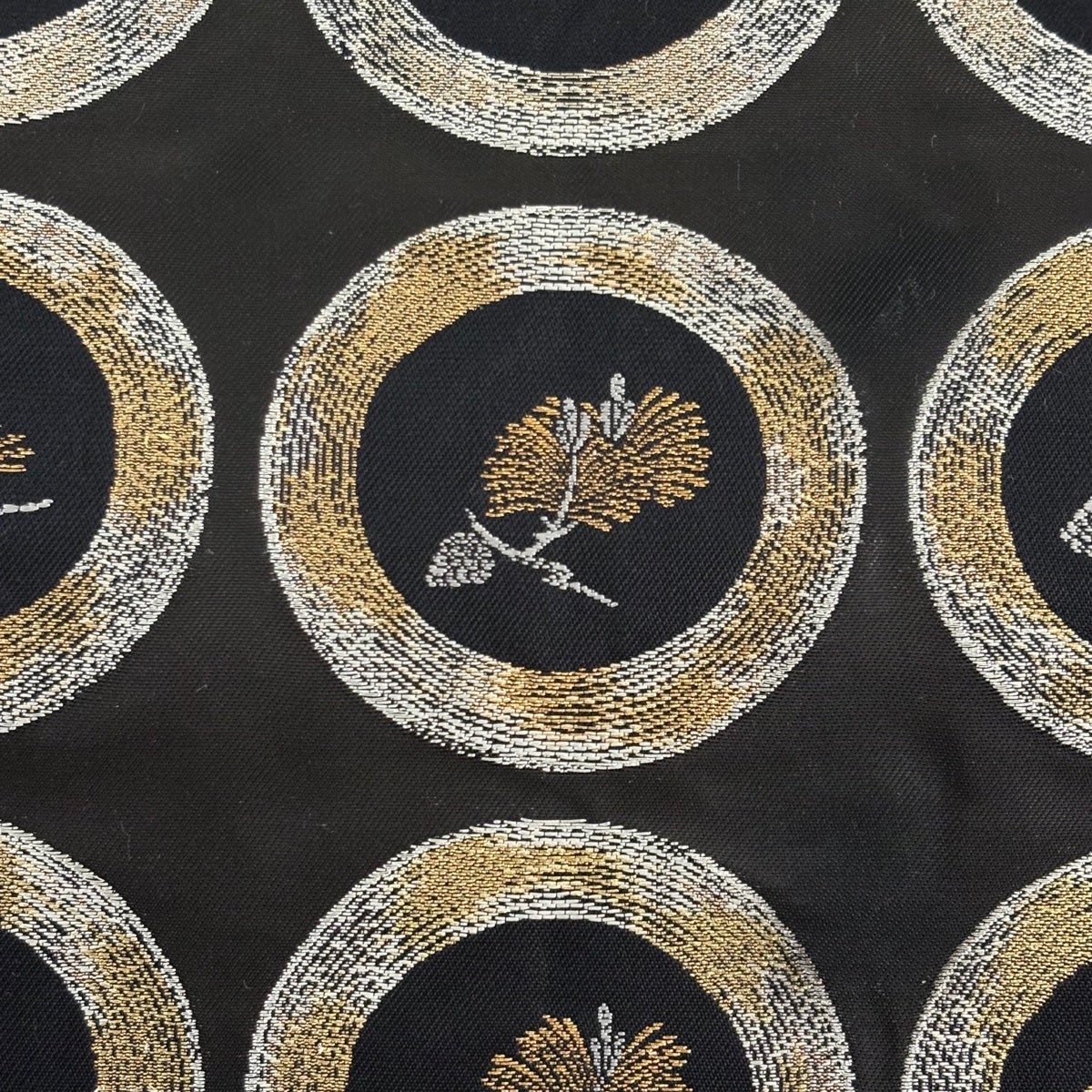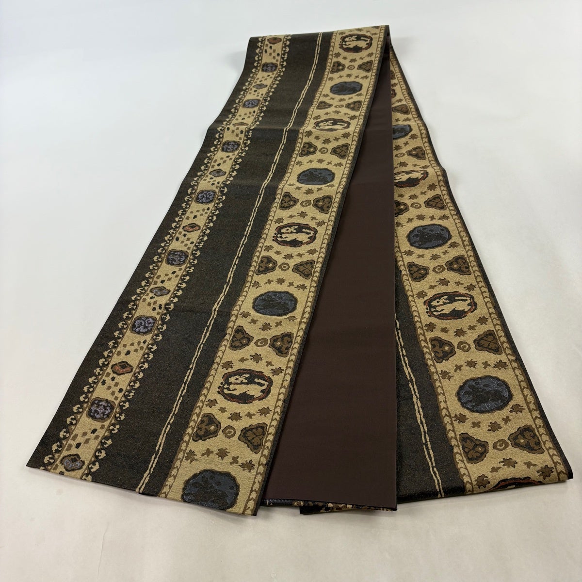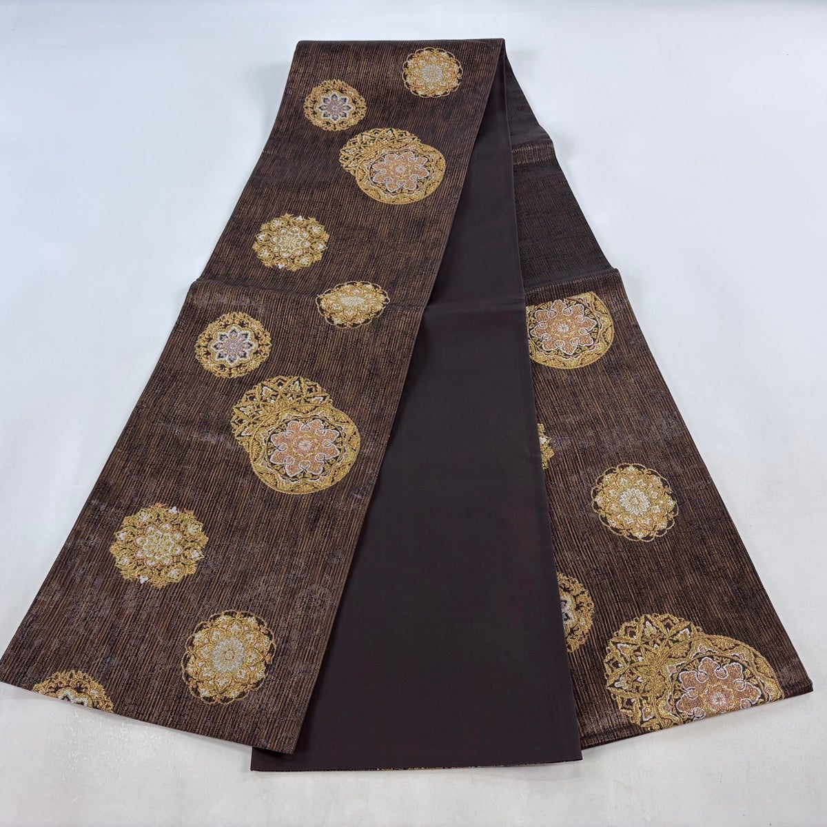 袋帯 名品 丸文 幾何学模様 箔 ラメ糸 焦茶色 六通 正絹