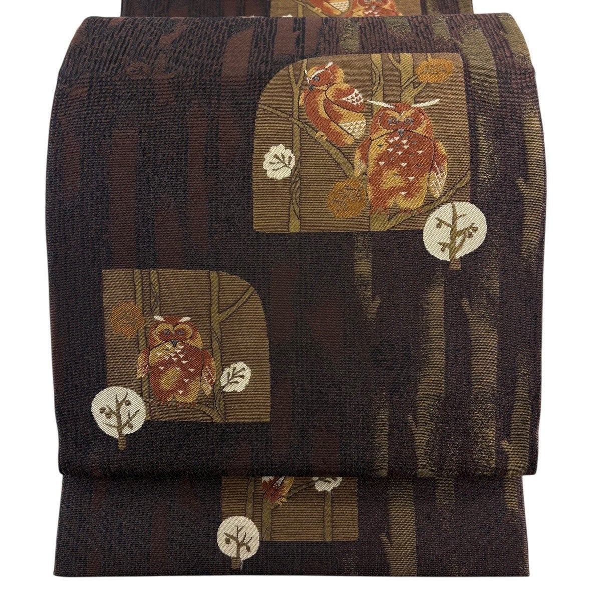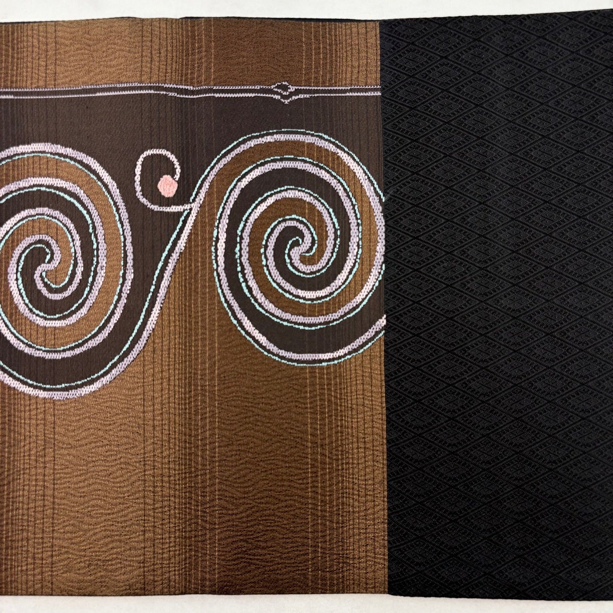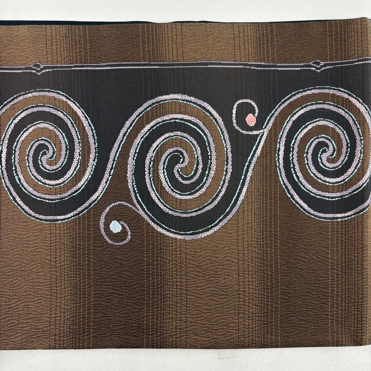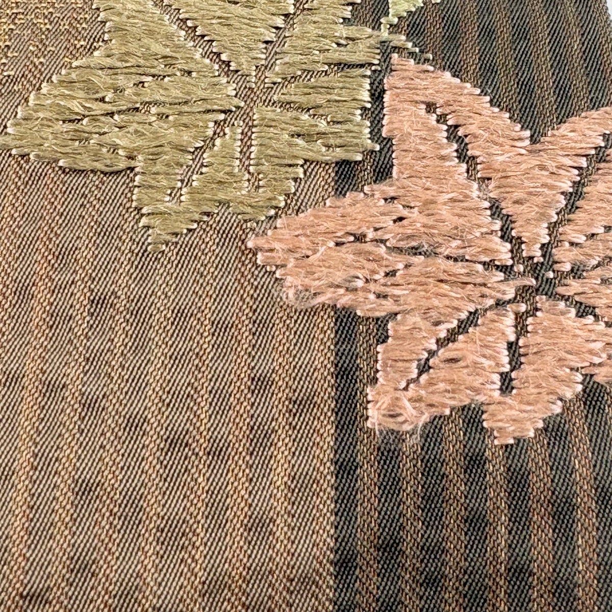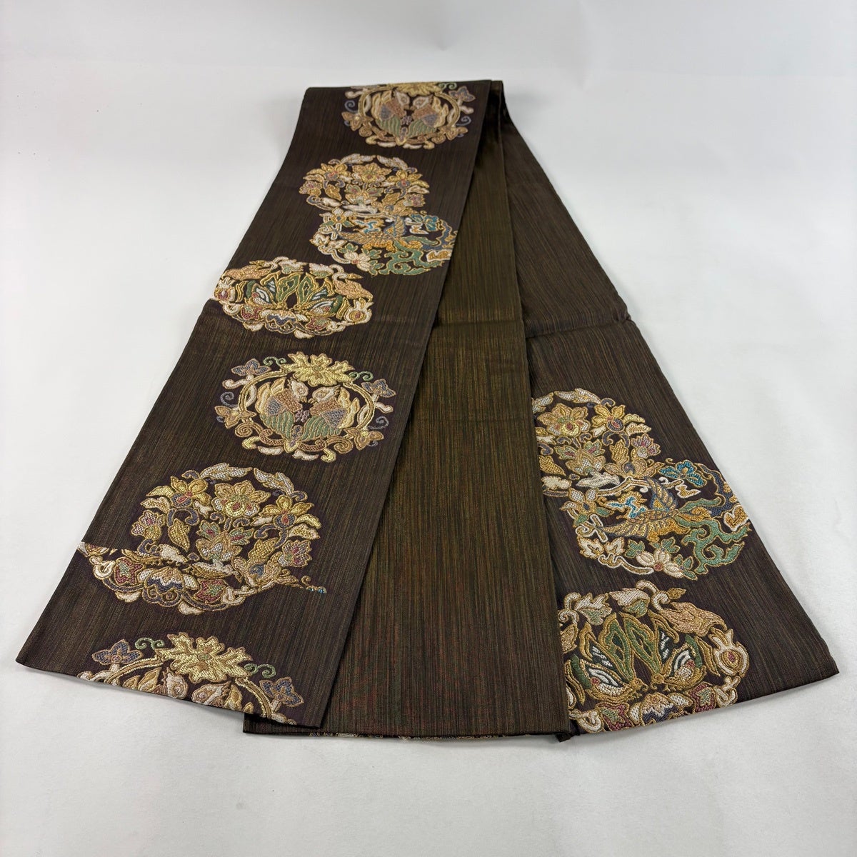 名古屋帯 秀品 紬地 雪輪 華文 刺繍 絞り 焦茶色 正絹
