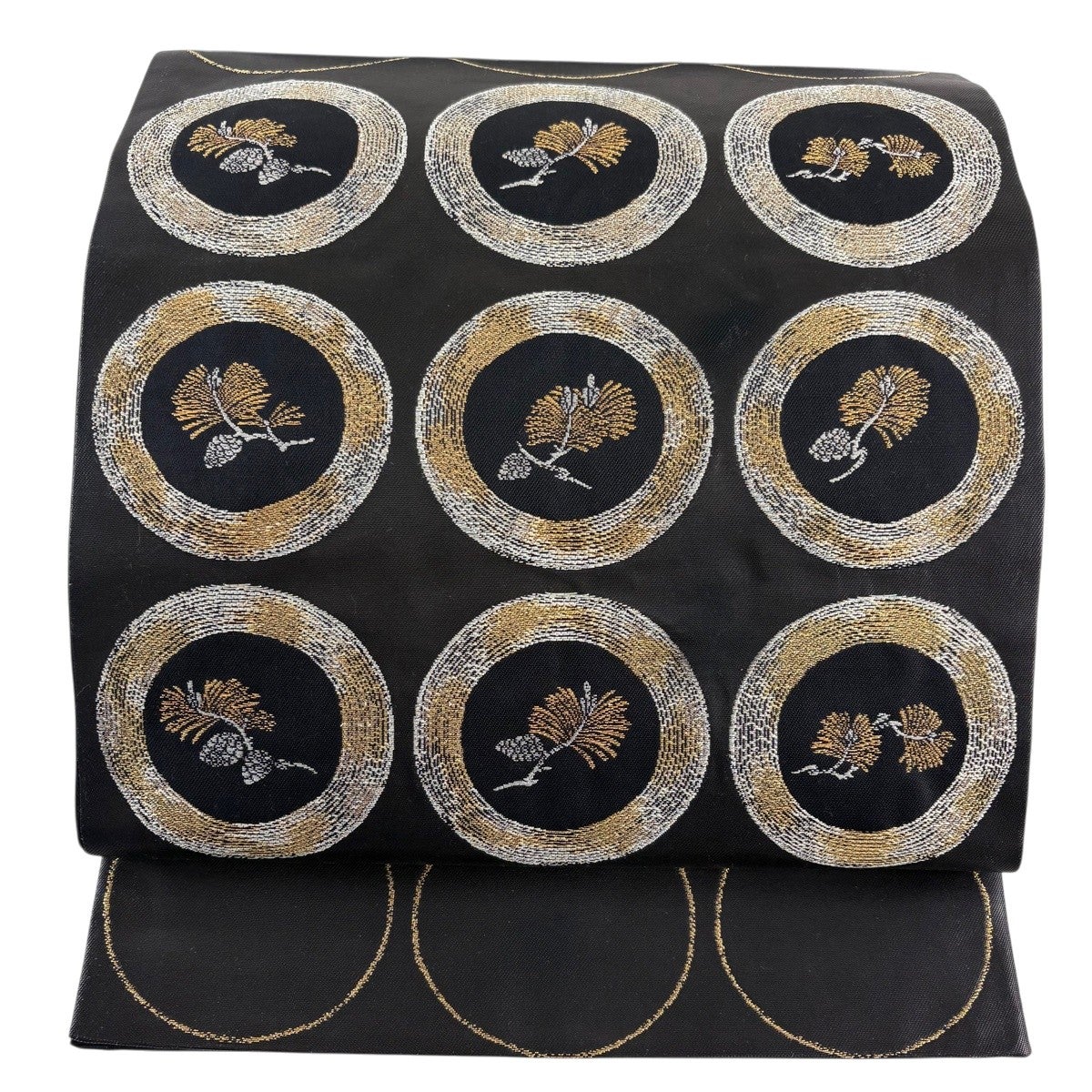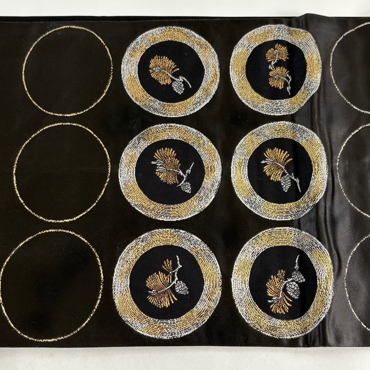 袋帯 名品 落款あり 松 丸紋 金銀糸 箔 焦茶色 六通 正絹