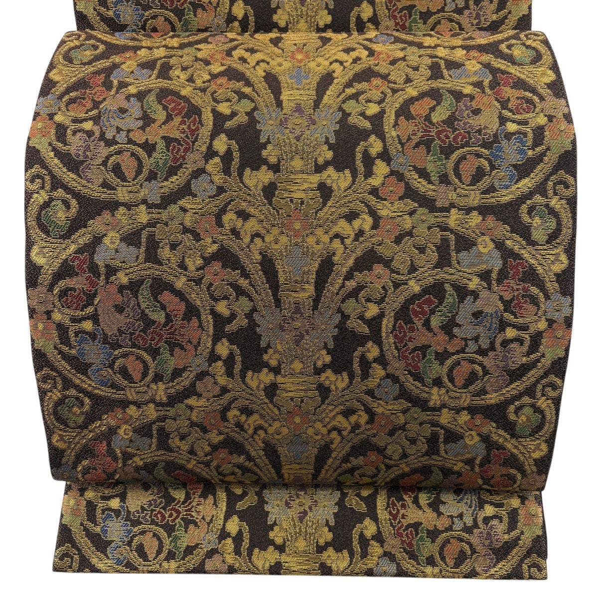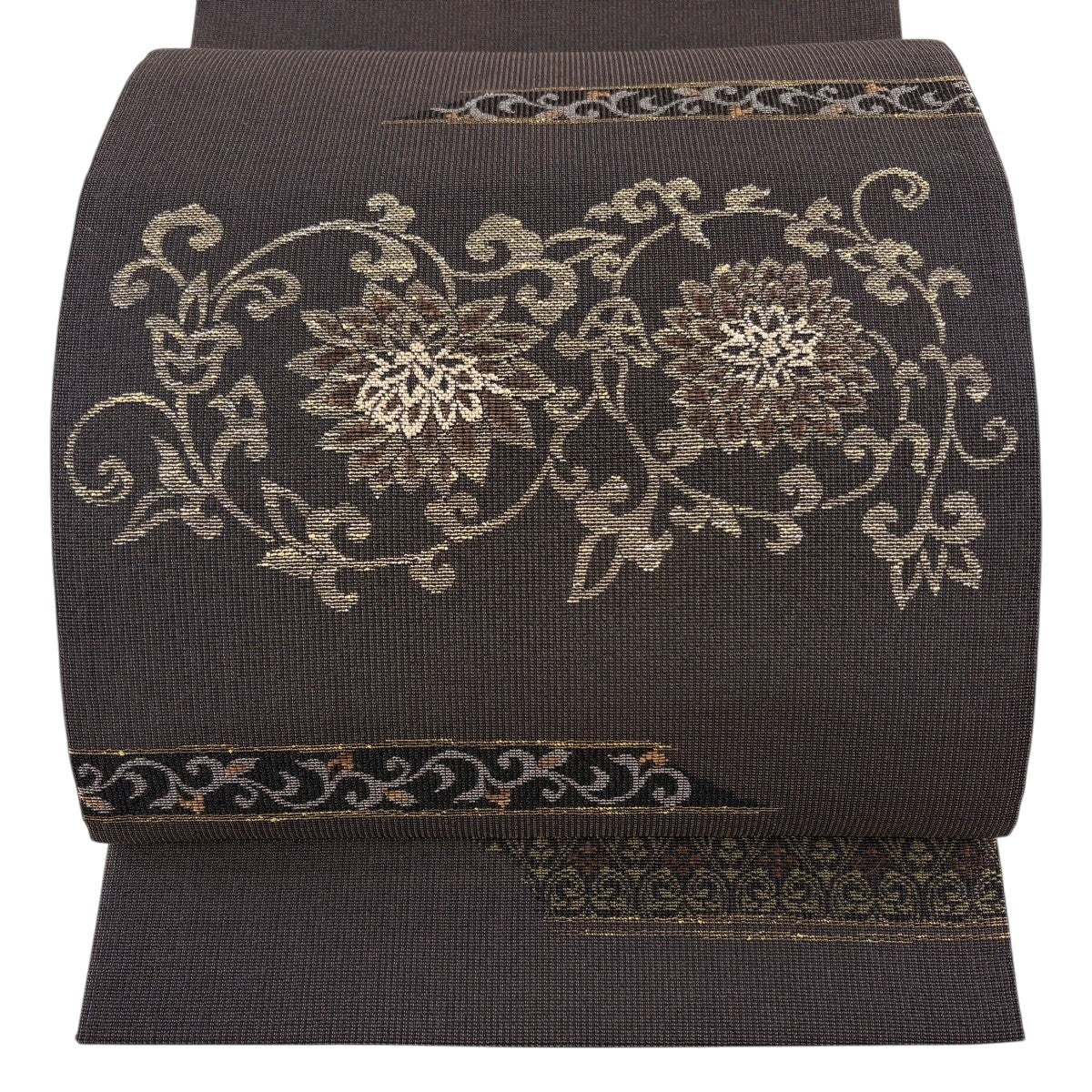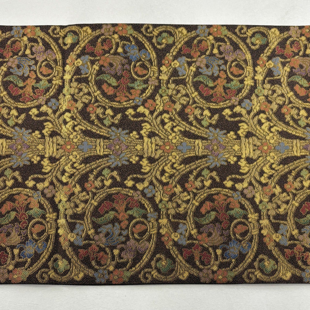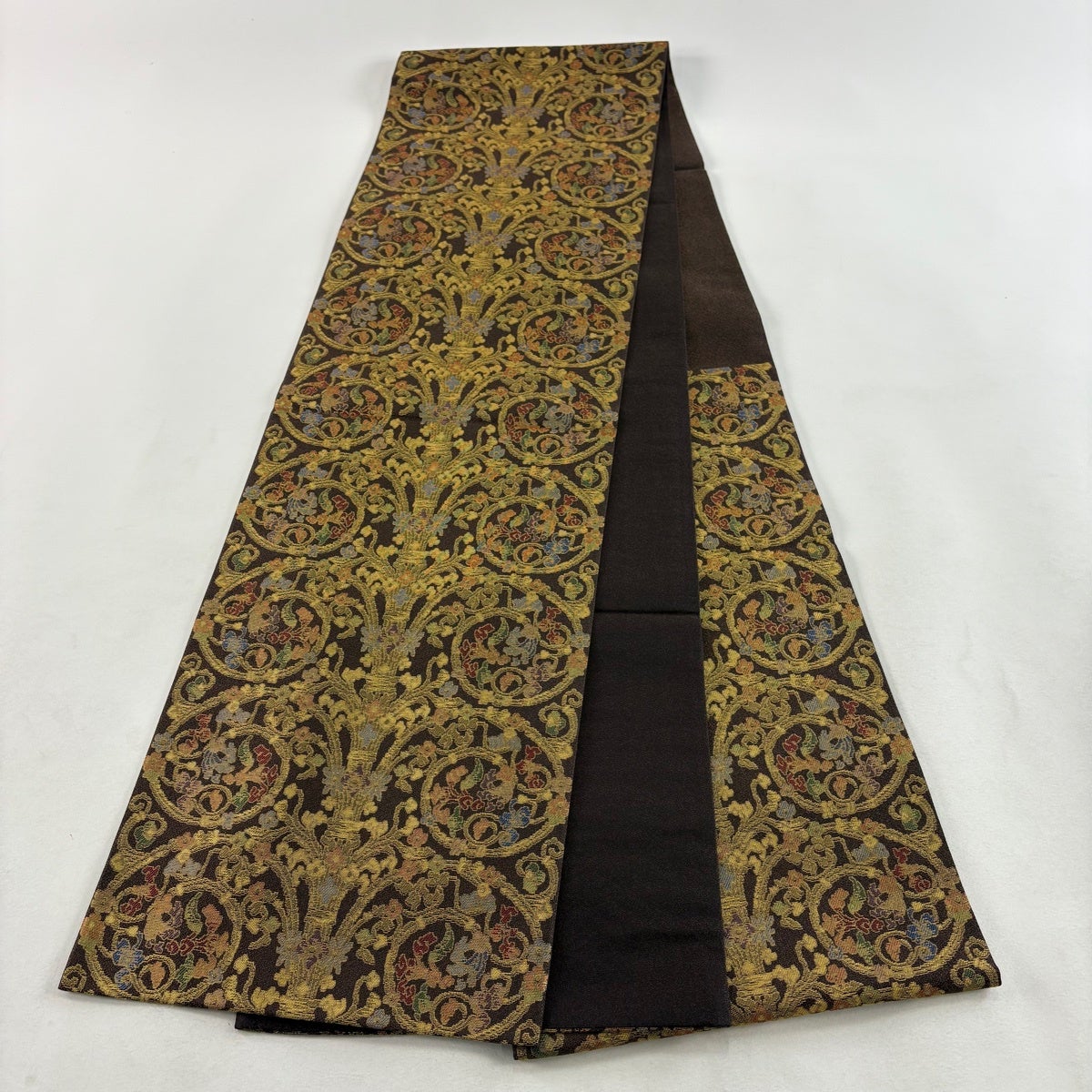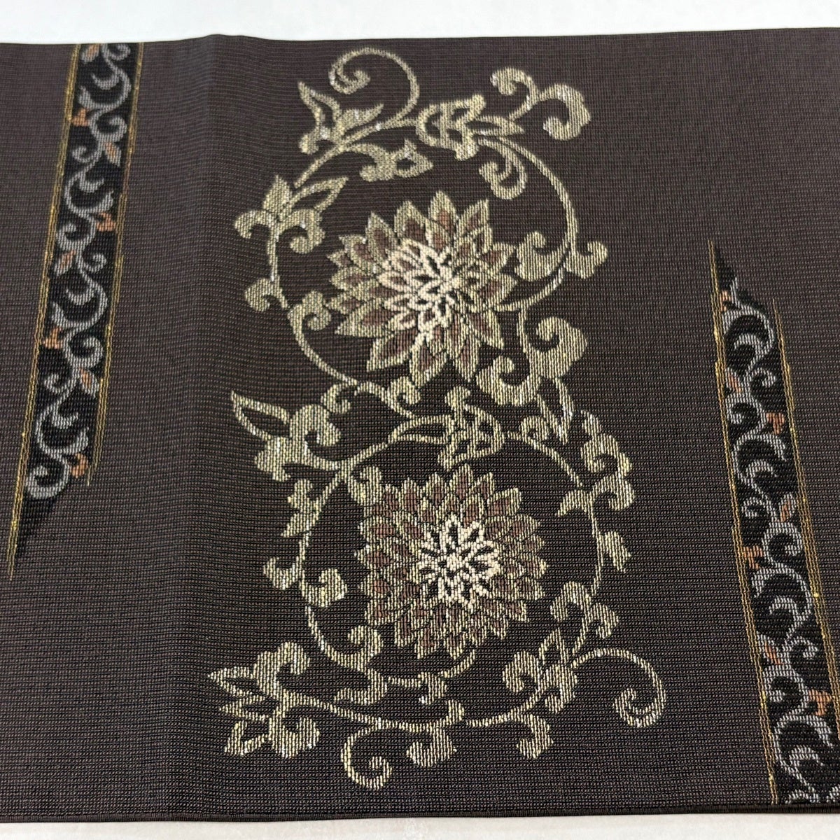 【美品】 袋帯 名品 華文 花唐草 金糸 焦茶色 全通 正絹