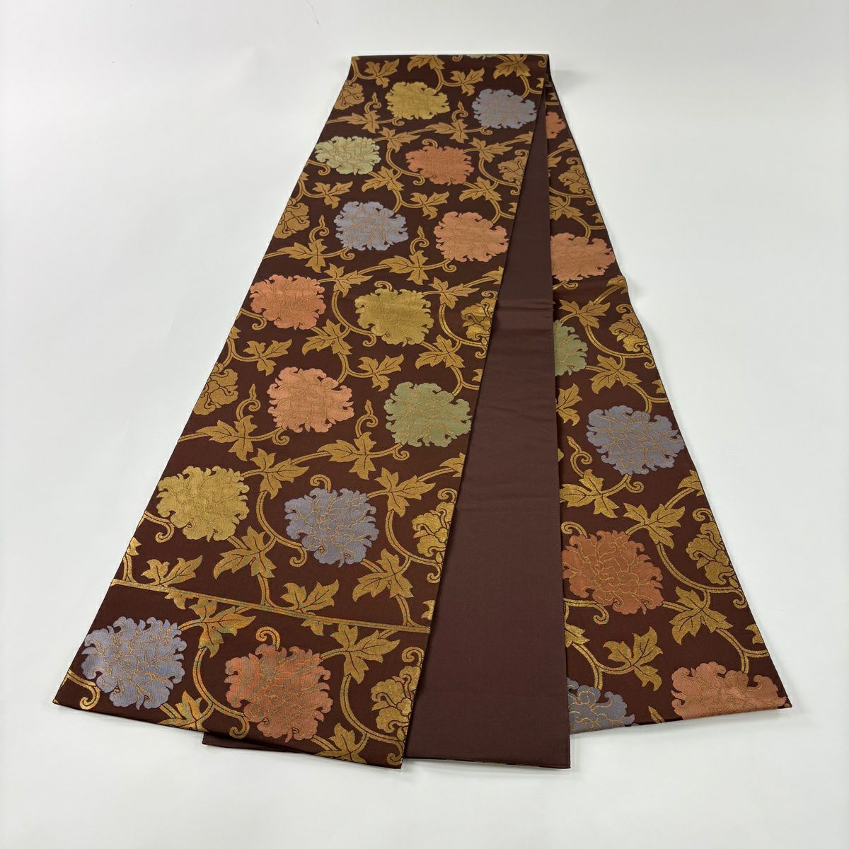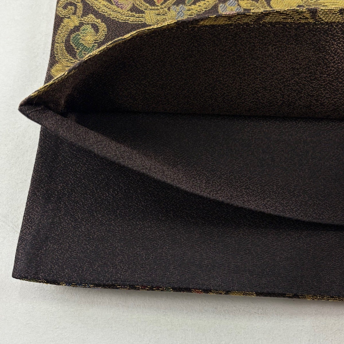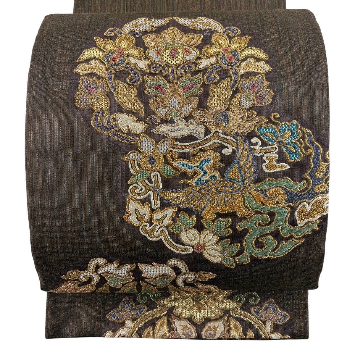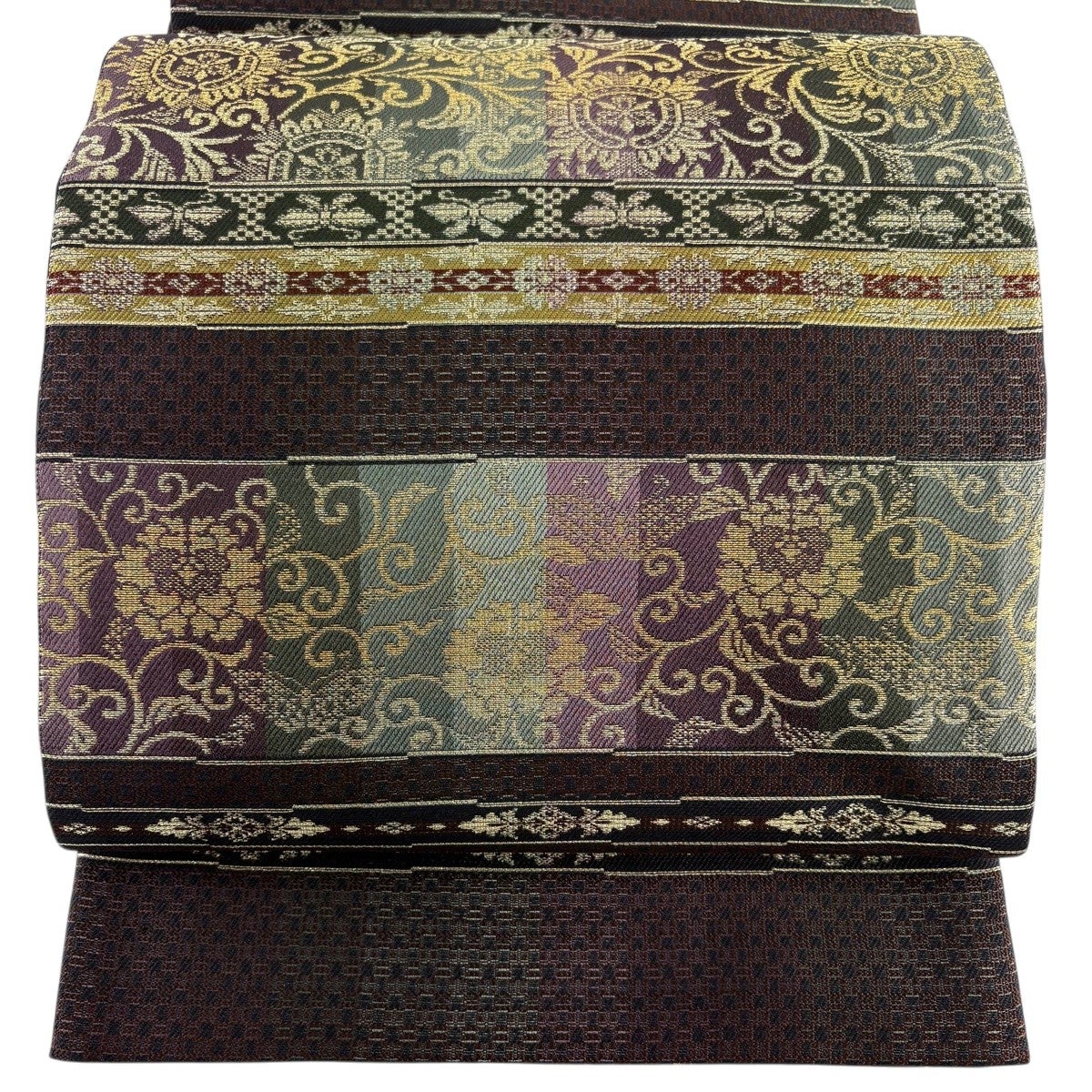 【美品】 袋帯 名品 華文 花唐草 金糸 焦茶色 全通 正絹