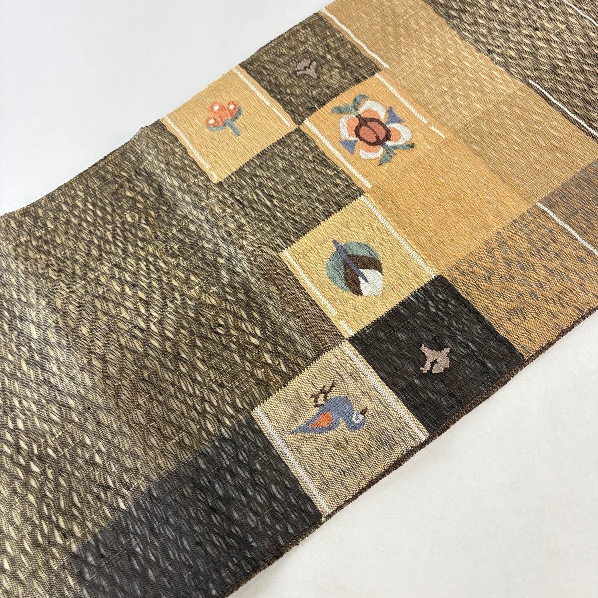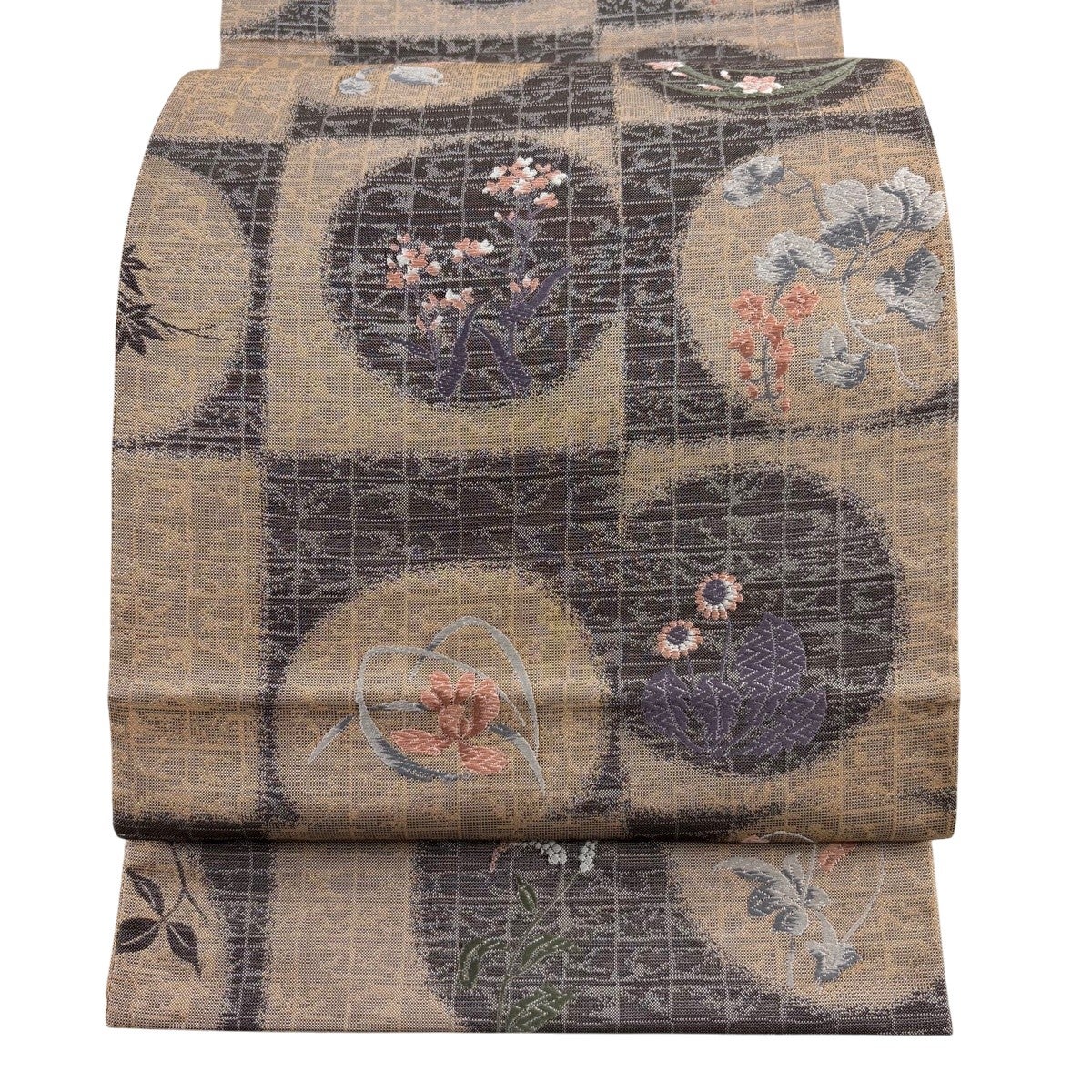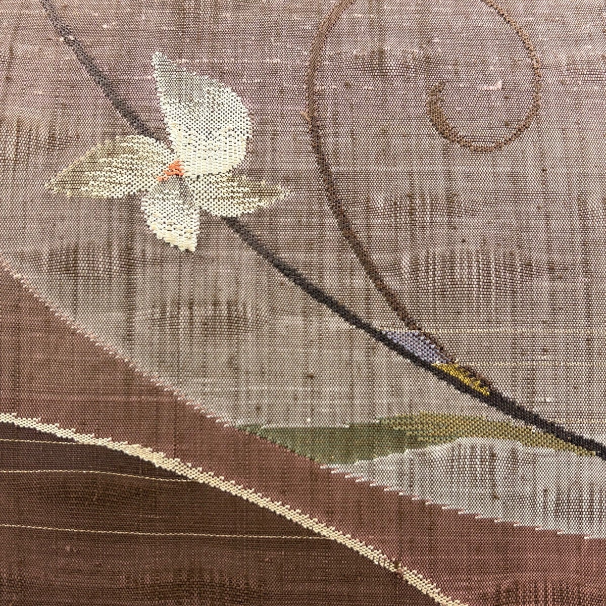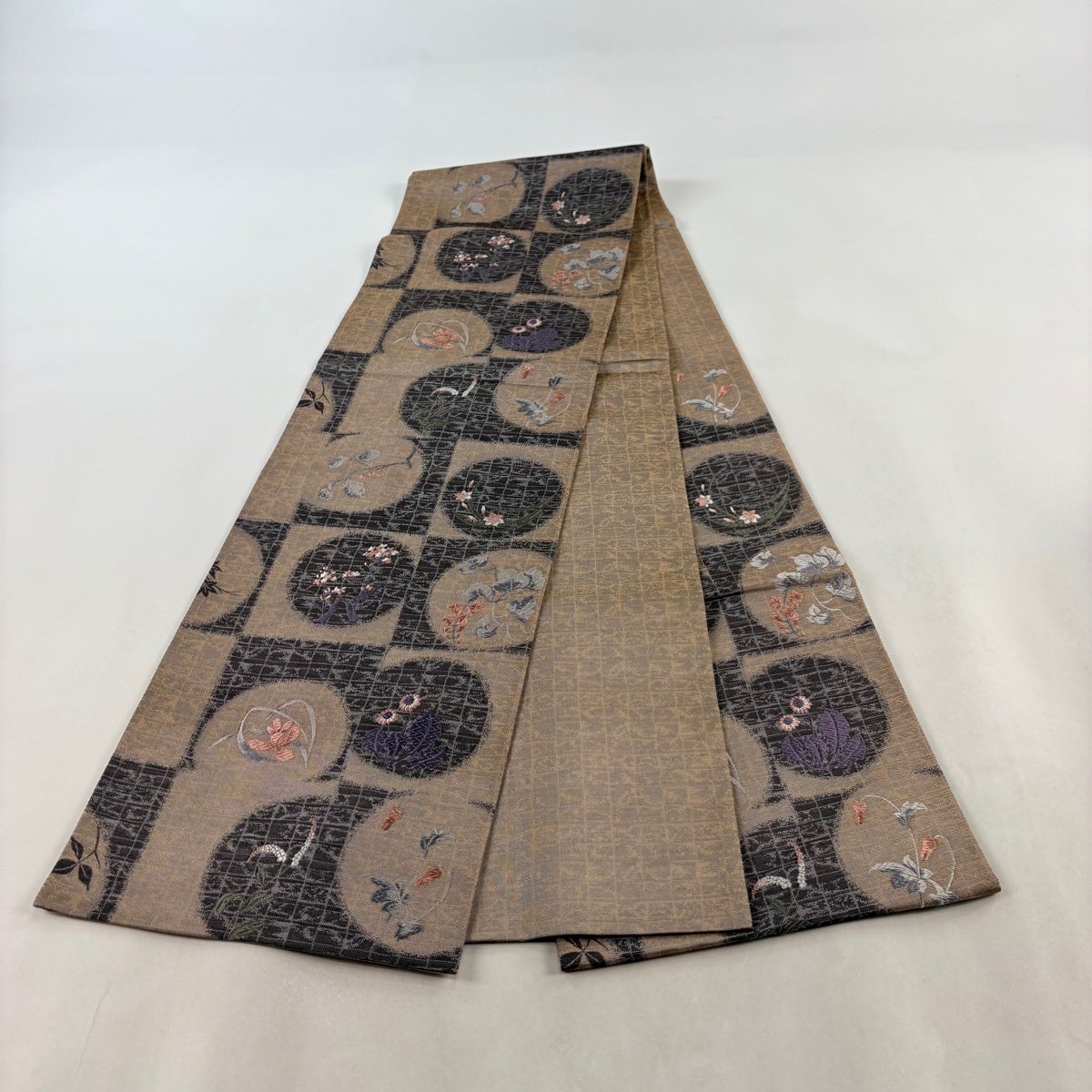 【美品】 開き名古屋帯 秀品 草花 幾何学模様 焦茶色 正絹