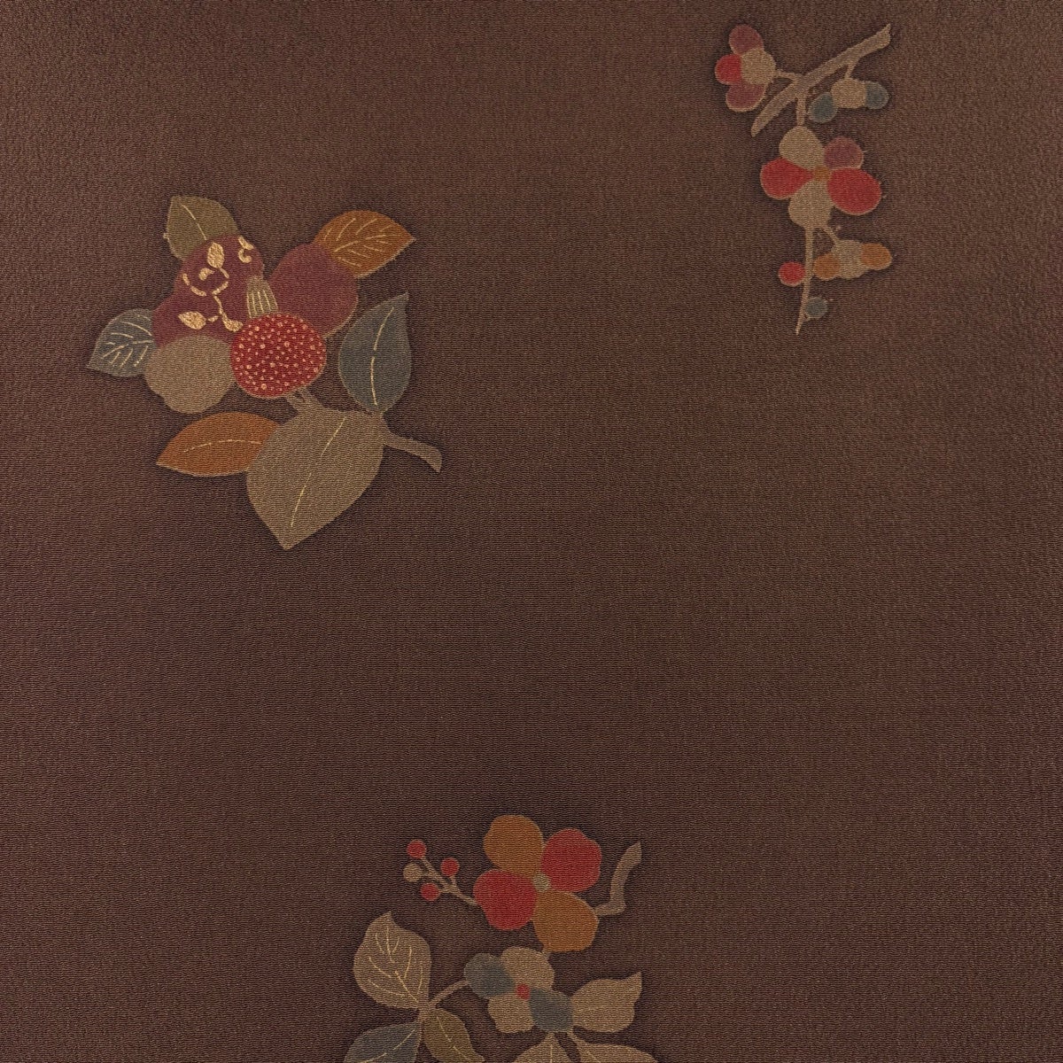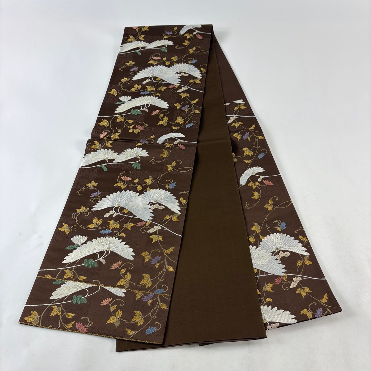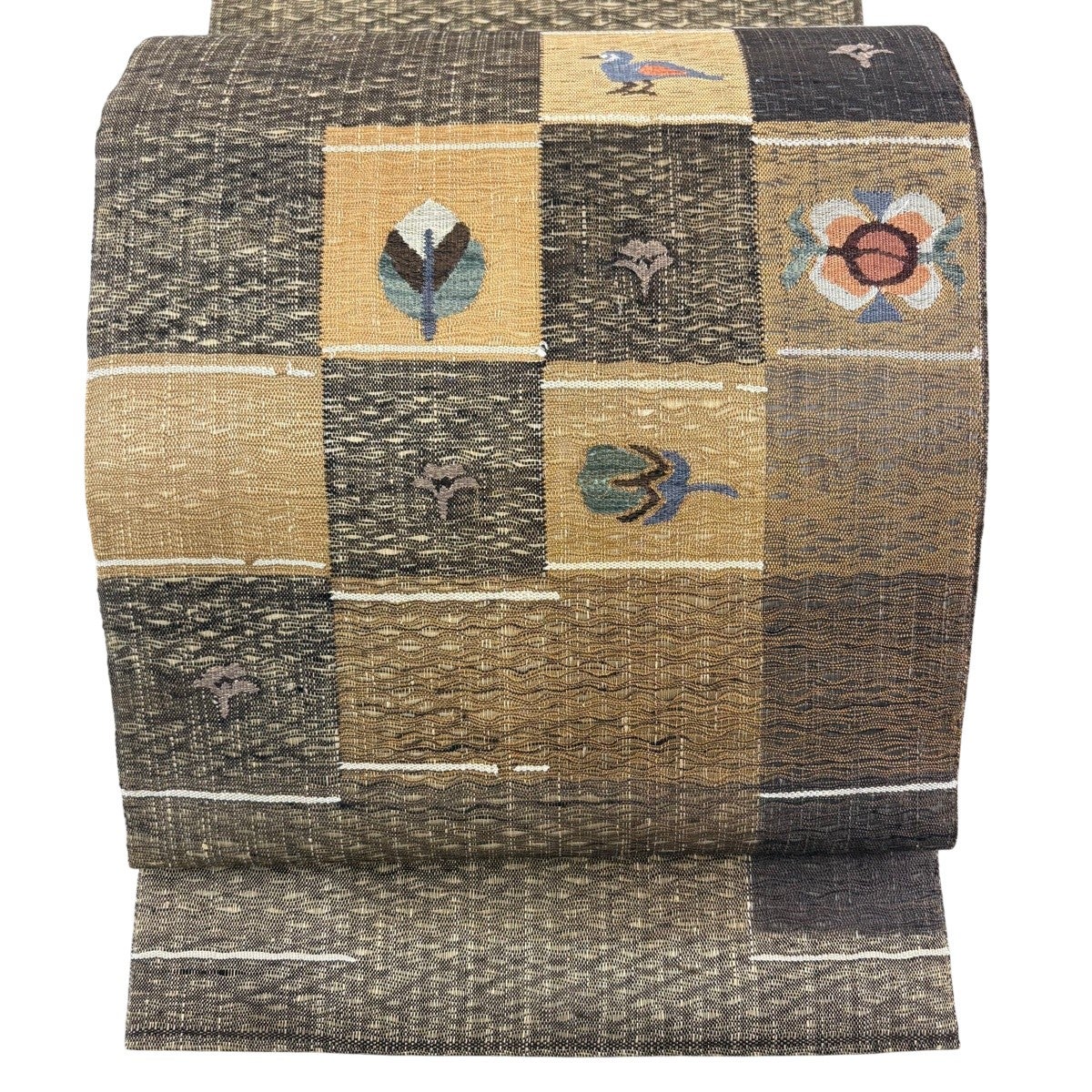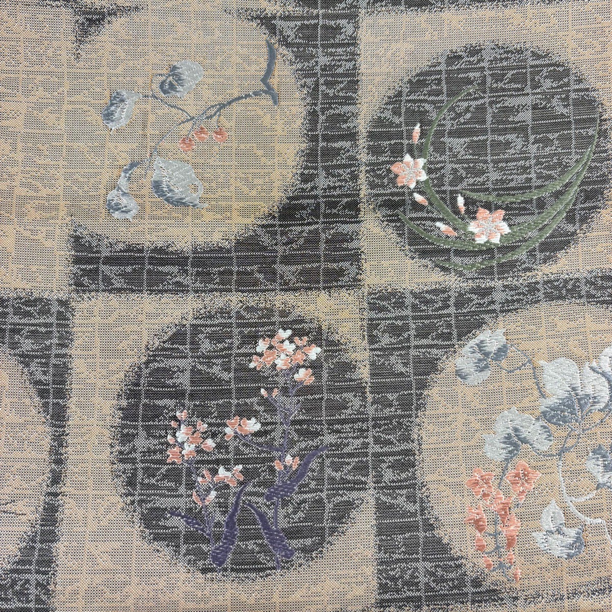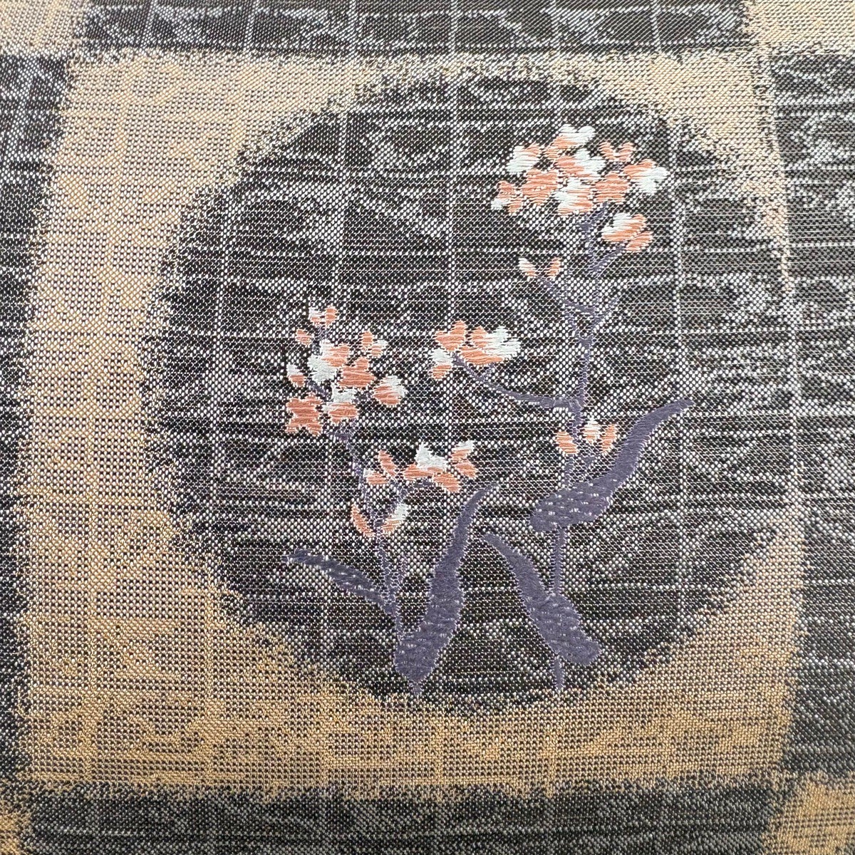 【美品】 開き名古屋帯 秀品 草花 幾何学模様 焦茶色 正絹