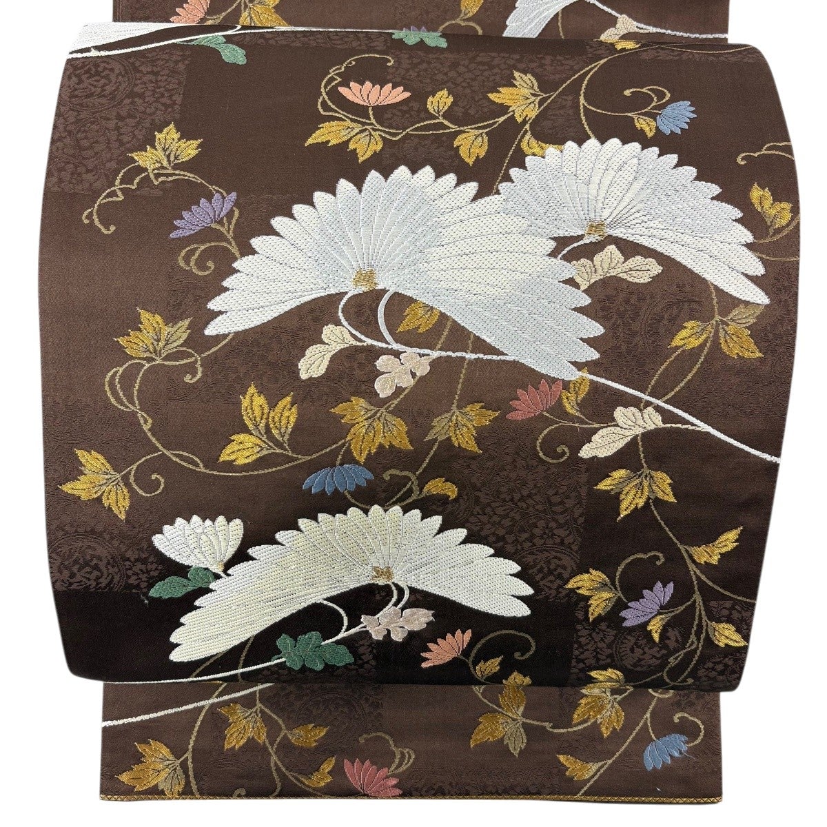 【美品】 袋帯 逸品 花唐草 銀糸 箔 焦茶色 お太鼓柄 正絹
