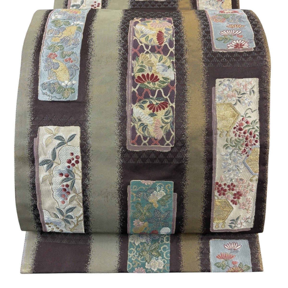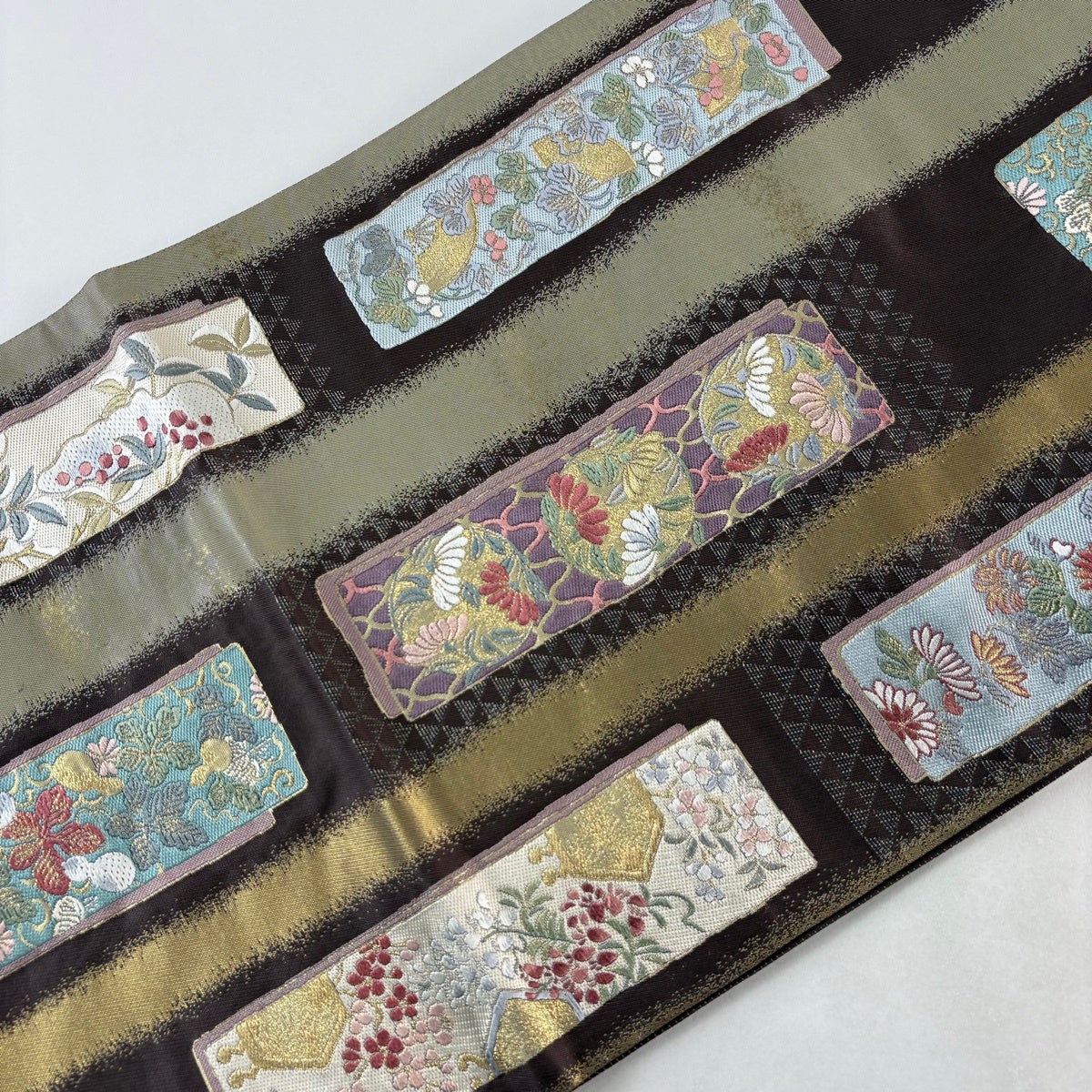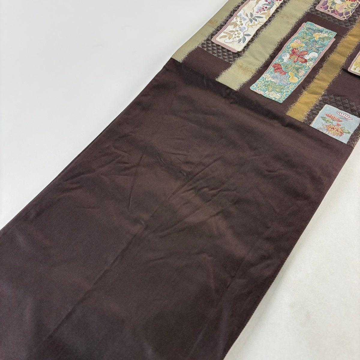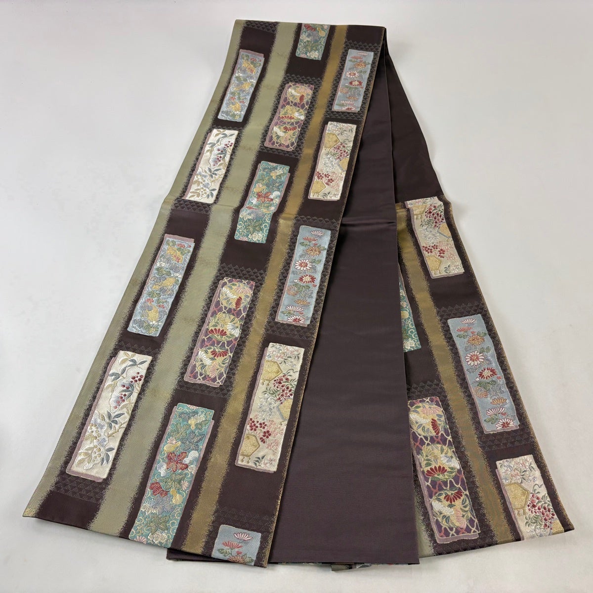 【美品】 袋帯 秀品 草花 短冊 金糸 箔 焦茶色 六通 正絹