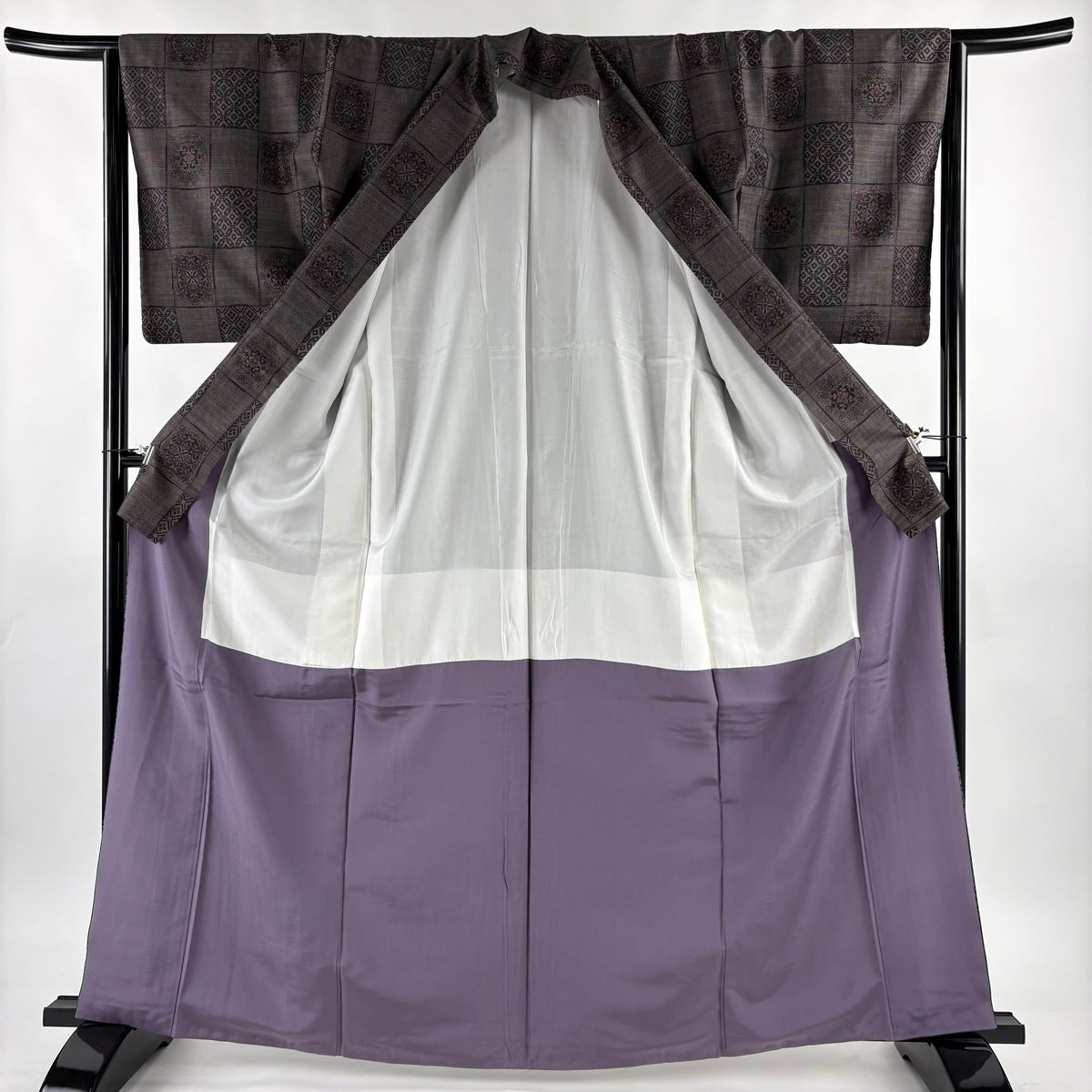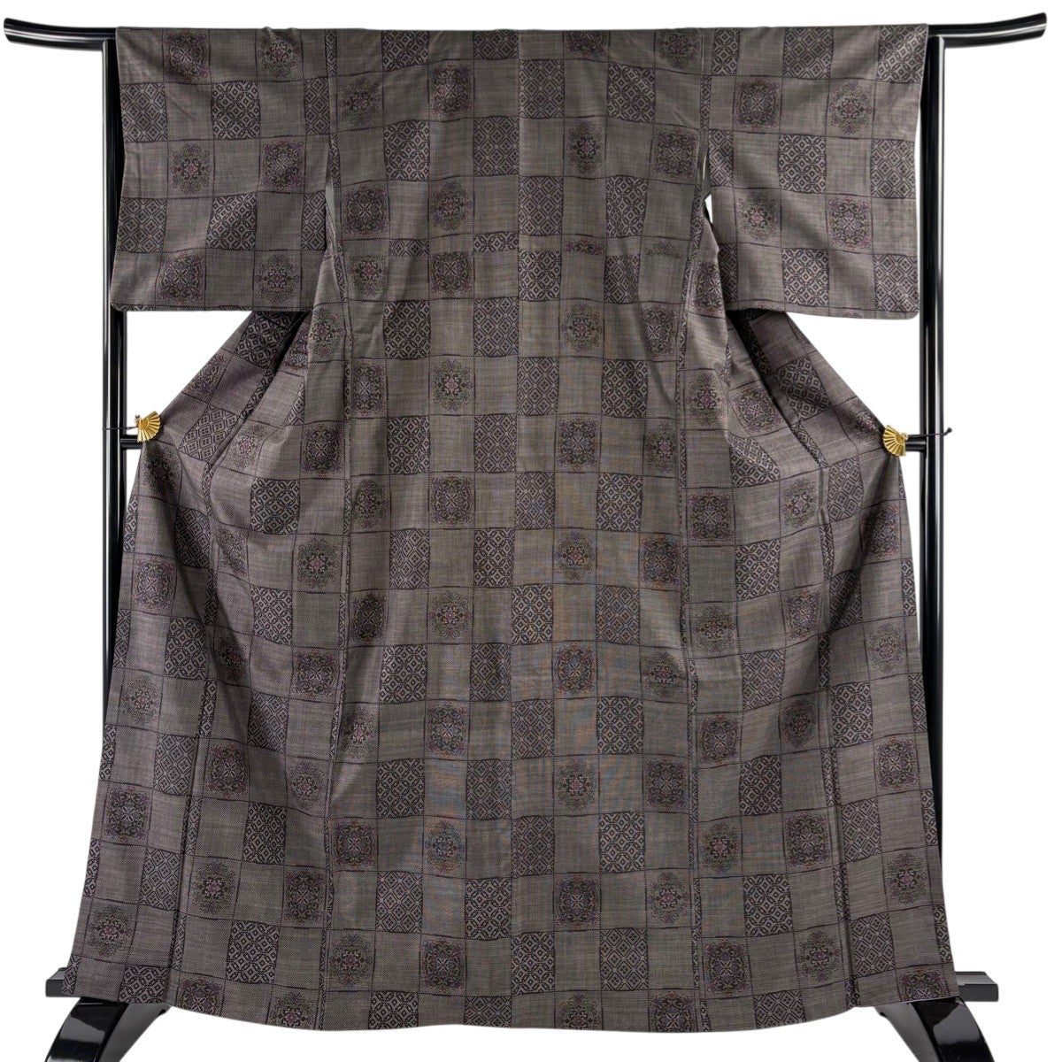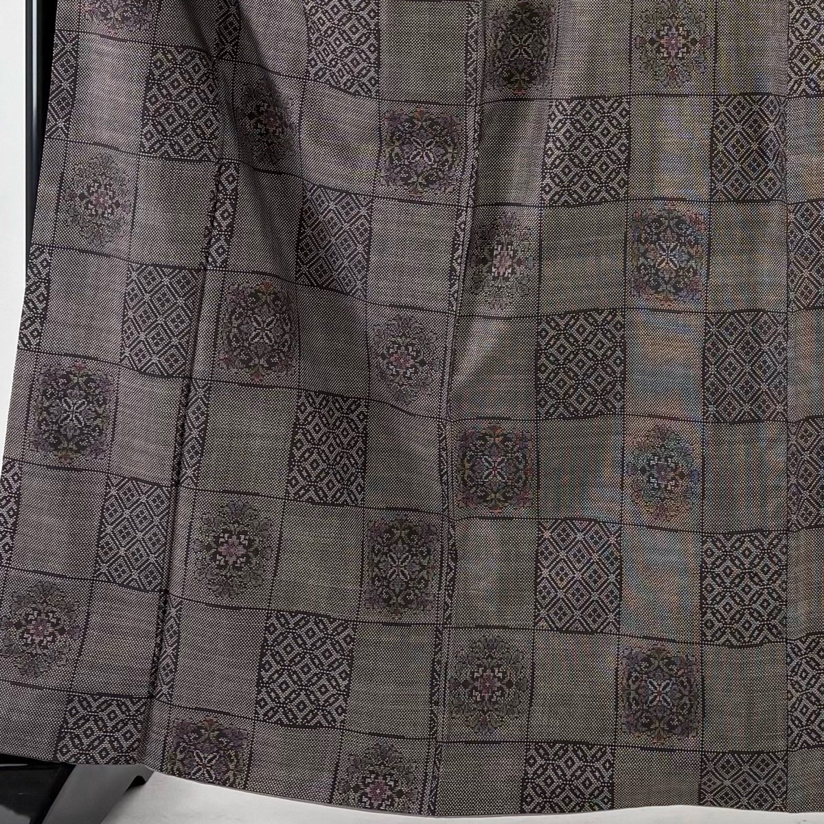 【美品】 紬 身丈164cm 裄丈64.5cm M 袷 華文 市松 焦茶色 正絹 秀品
