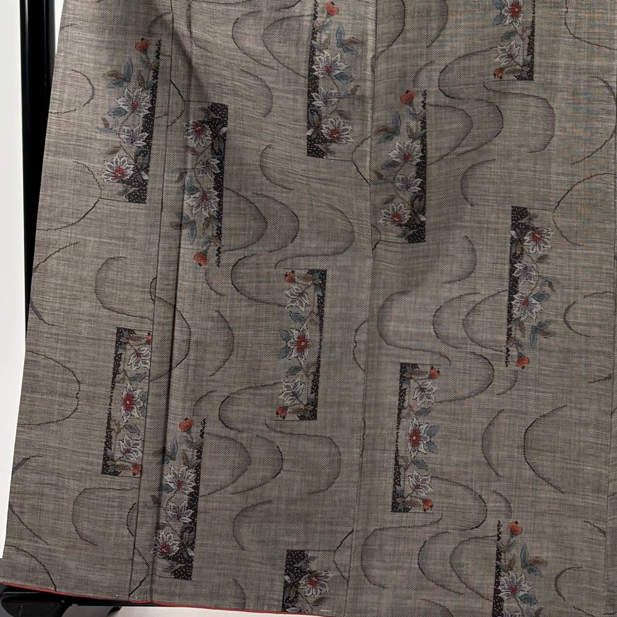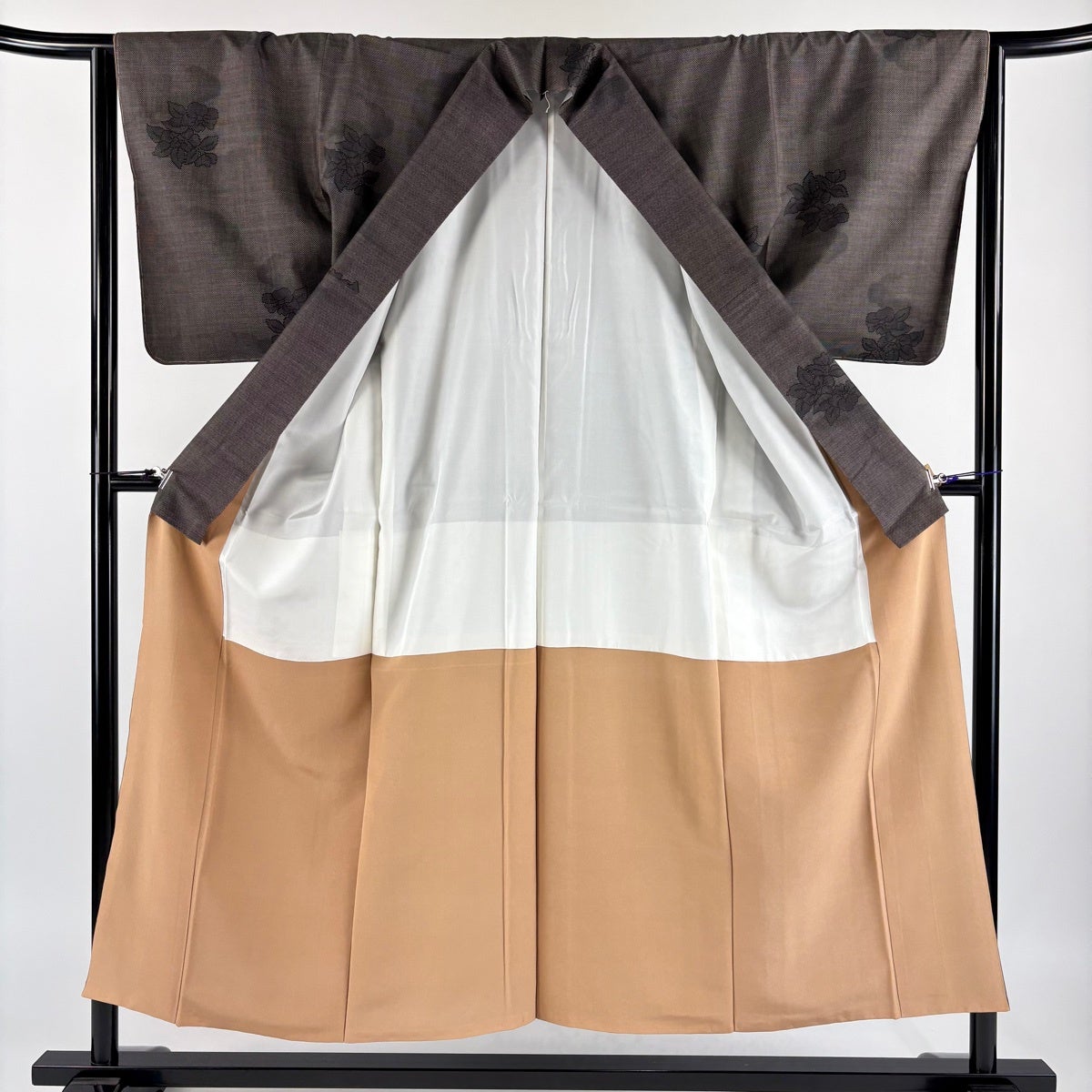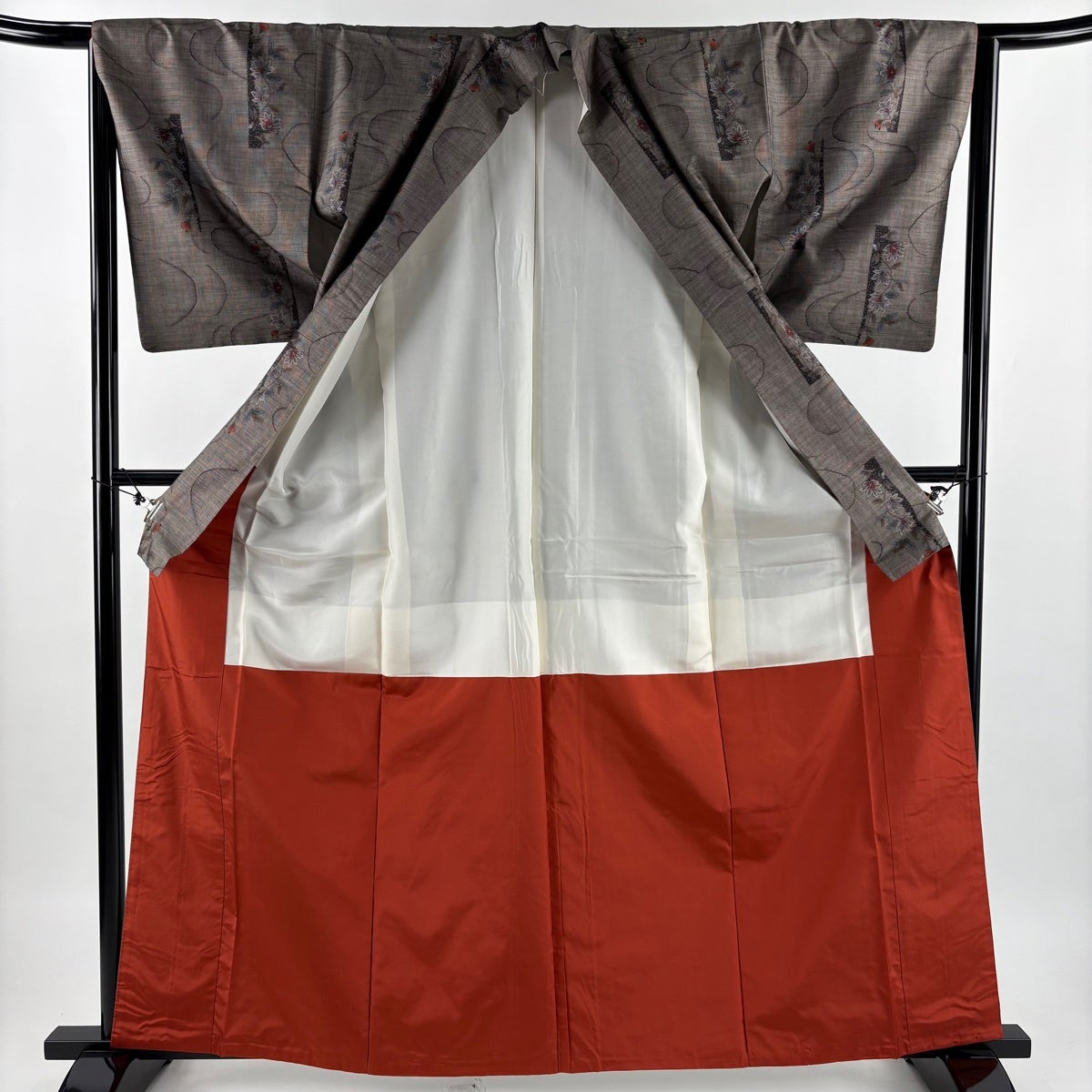 紬 身丈166.5cm 裄丈68.5cm L 袷 名古屋帯セット 草花 焦茶色 正絹 秀品