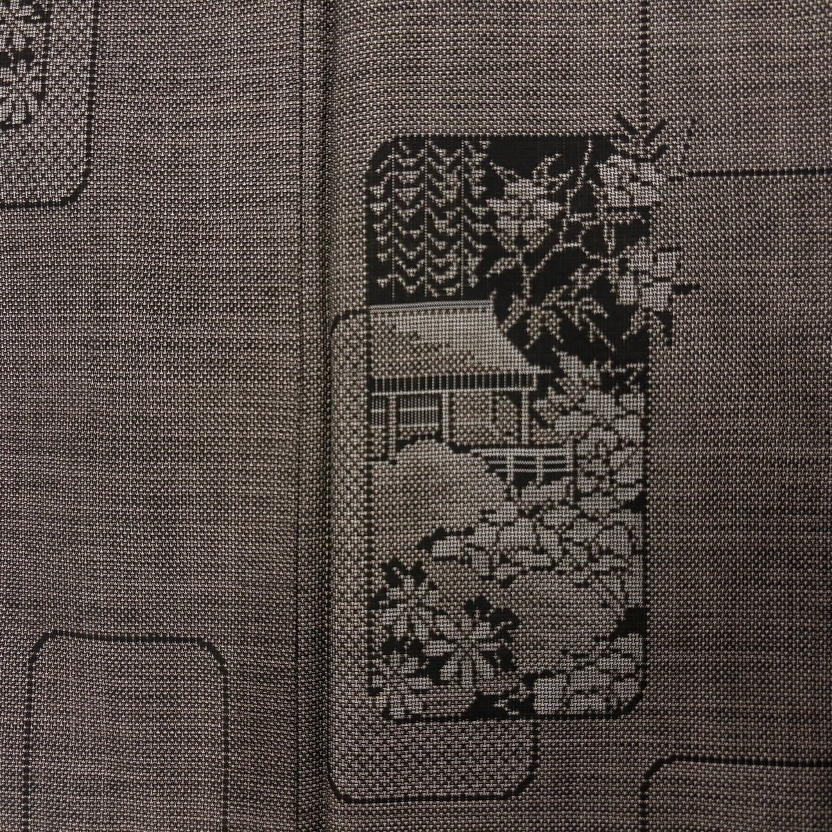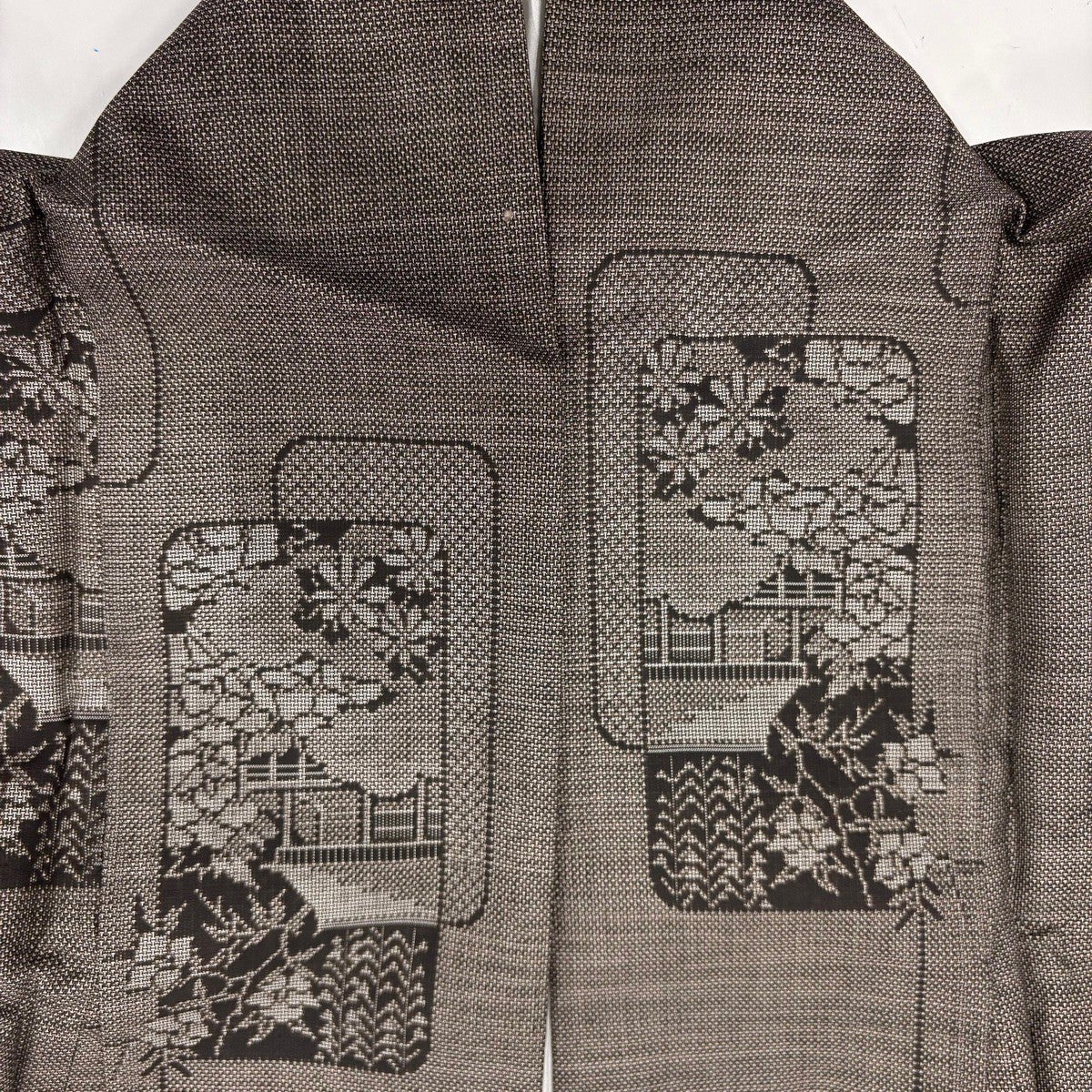 【美品】 紬 身丈159.5cm 裄丈67.5cm L 袷 草花 建物 焦茶色 正絹 秀品
