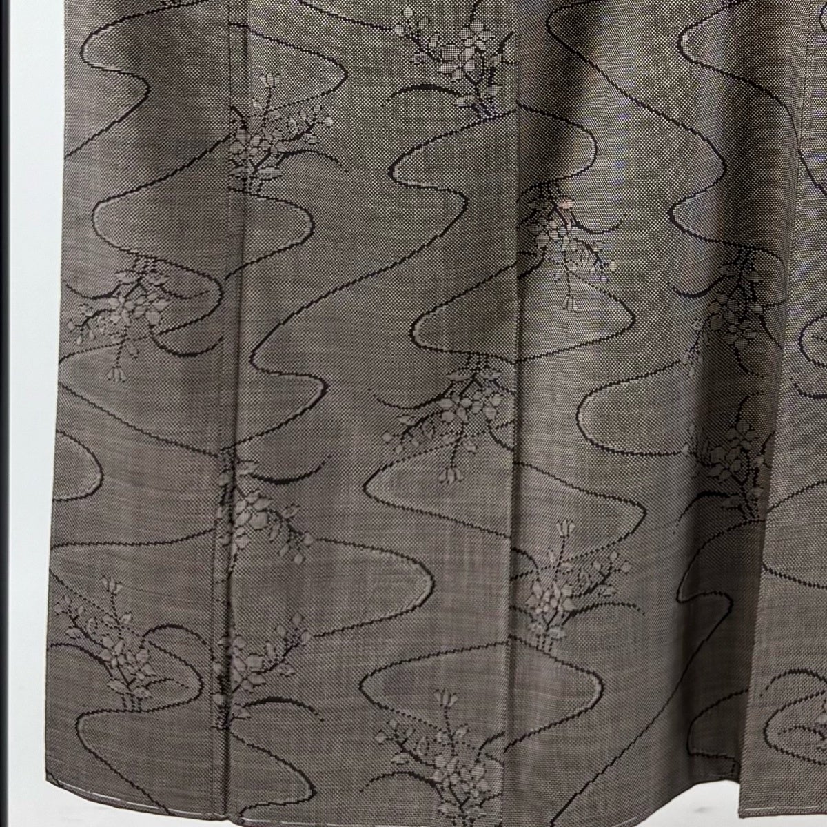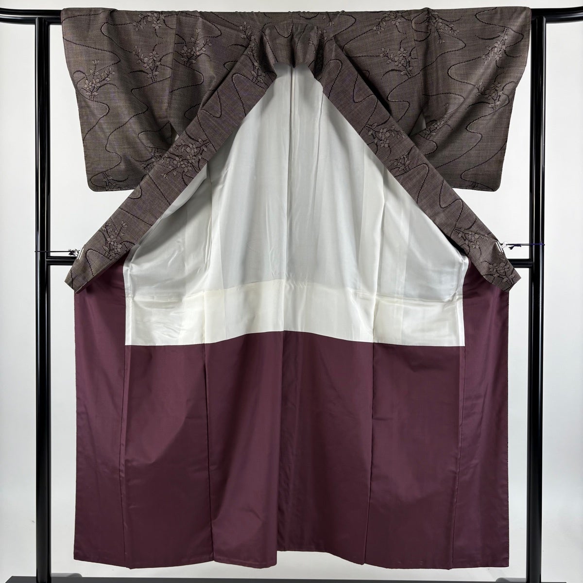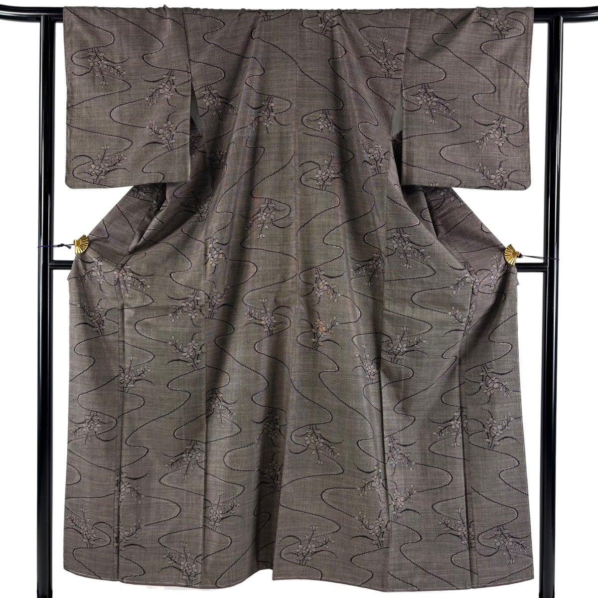 【美品】 紬 身丈163.5cm 裄丈64.5cm M 袷 草花 流水 焦茶色 正絹 秀品
