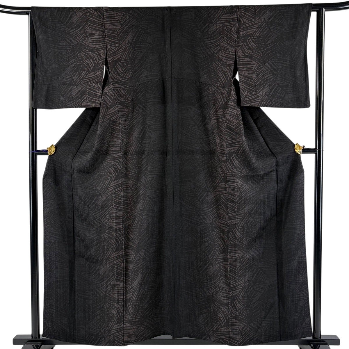 【美品】 小紋 身丈171cm 裄丈67cm M 袷 よろけ縞 幾何学模様 焦茶色 正絹 秀品
