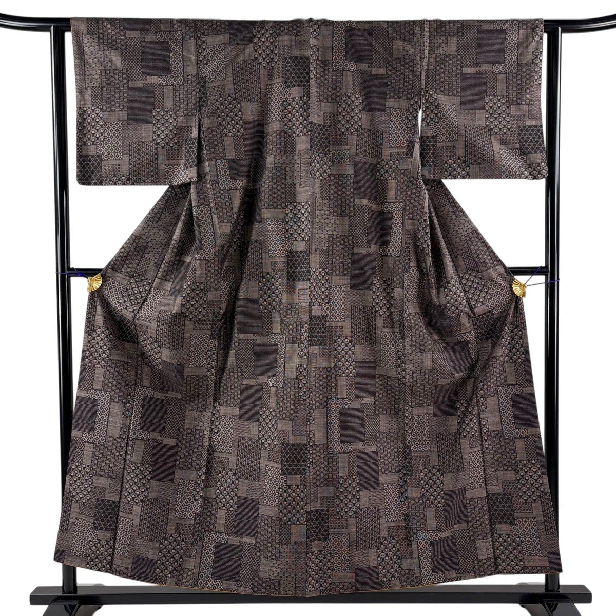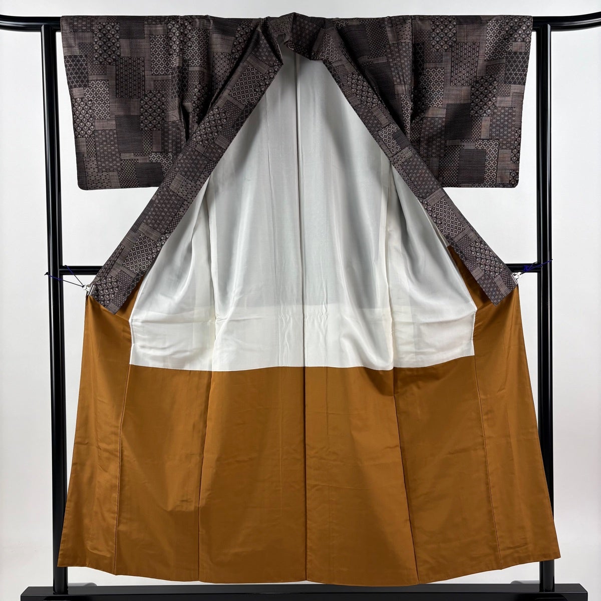 【美品】 小紋 身丈157.5cm 裄丈62.5cm S 袷 落款あり 幾何学 焦茶色 正絹 秀品