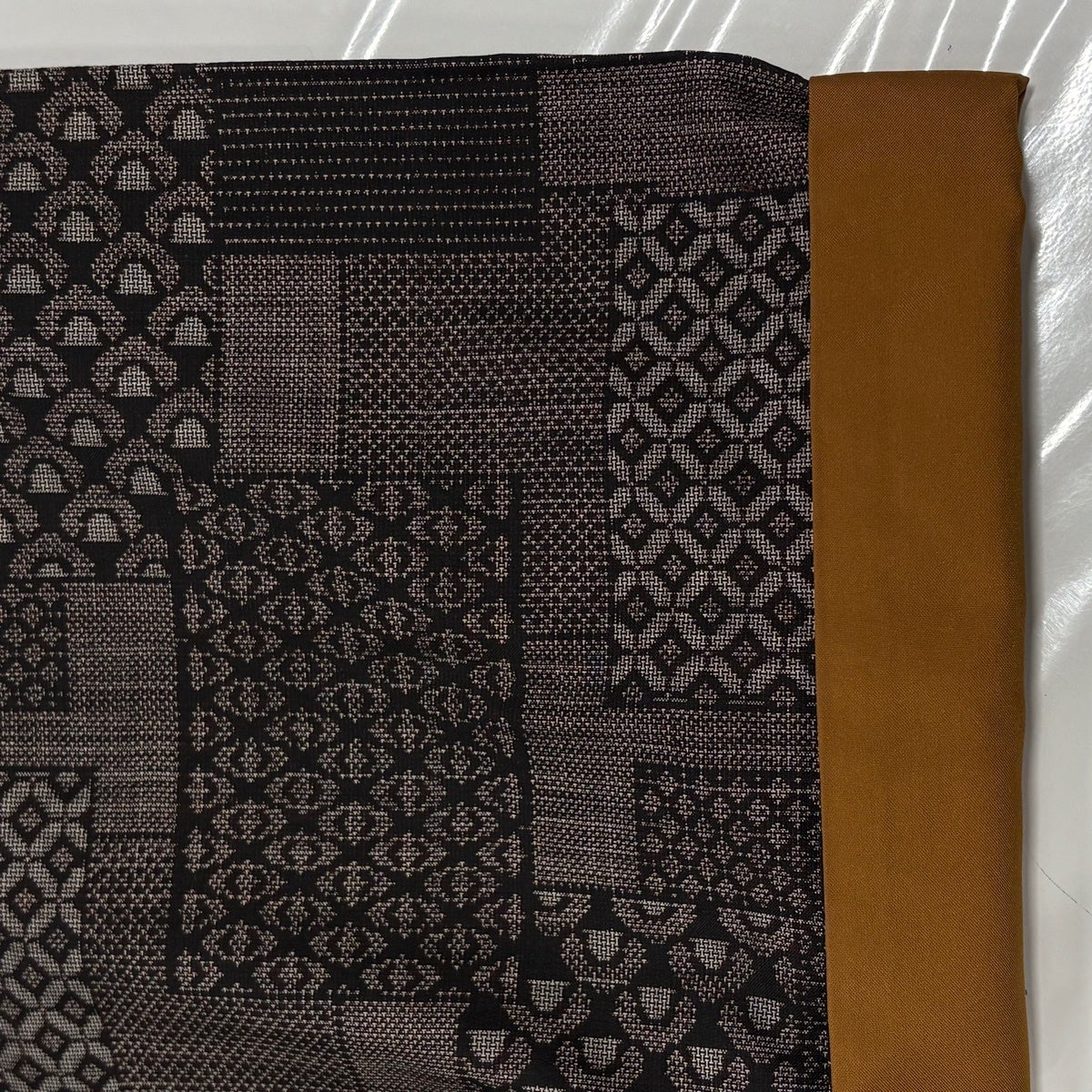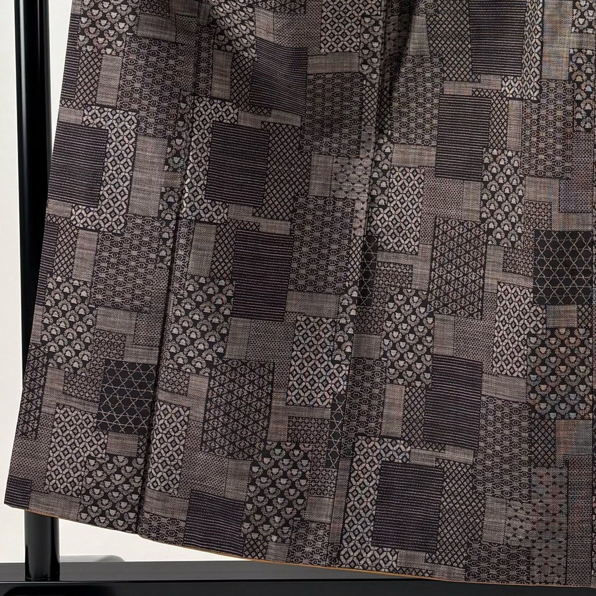 【美品】 紬 身丈160cm 裄丈65.5cm M 袷 袋帯セット 幾何学 焦茶色 正絹 秀品