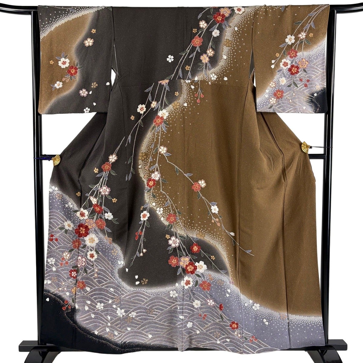 訪問着 身丈158.5cm 裄丈64cm M 袷 枝垂れ桜 波 絞り 金彩 焦茶色 正絹 秀品
