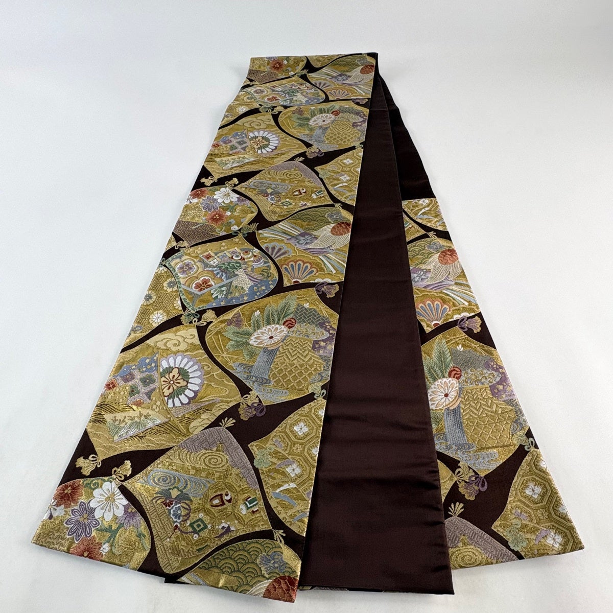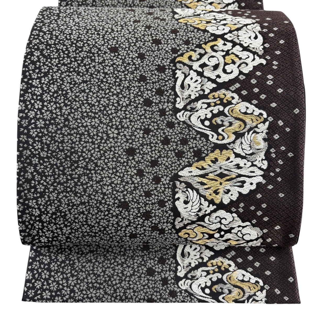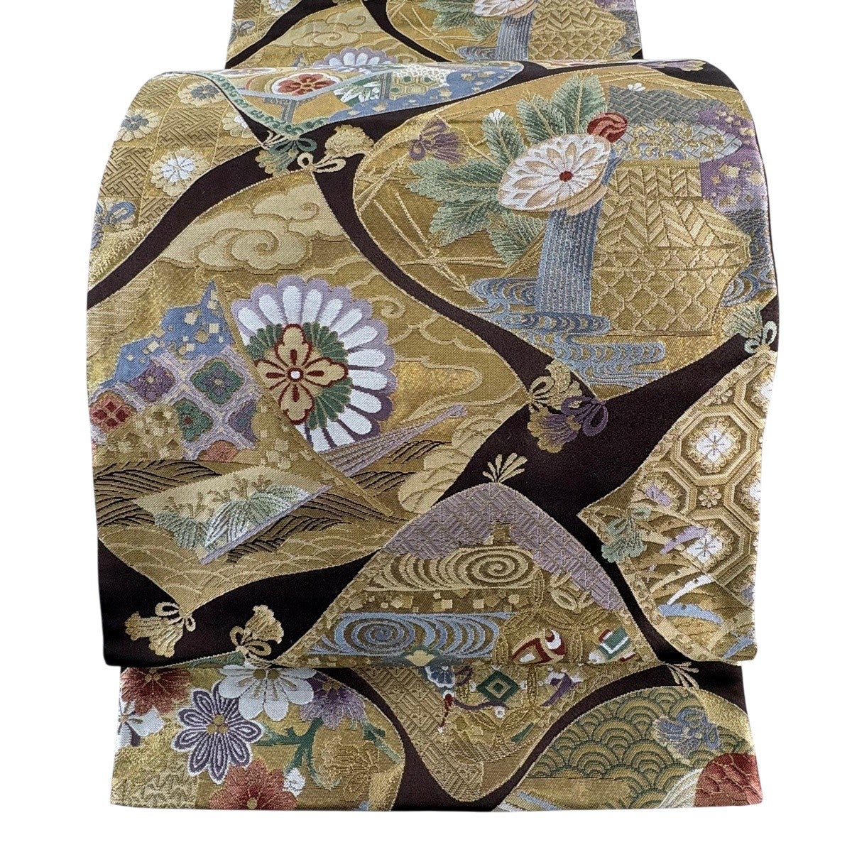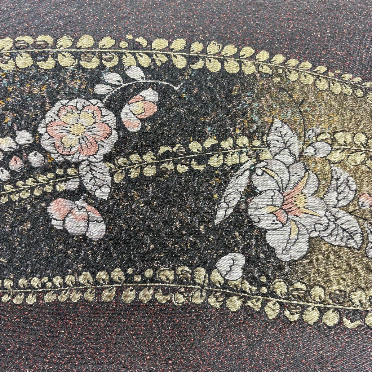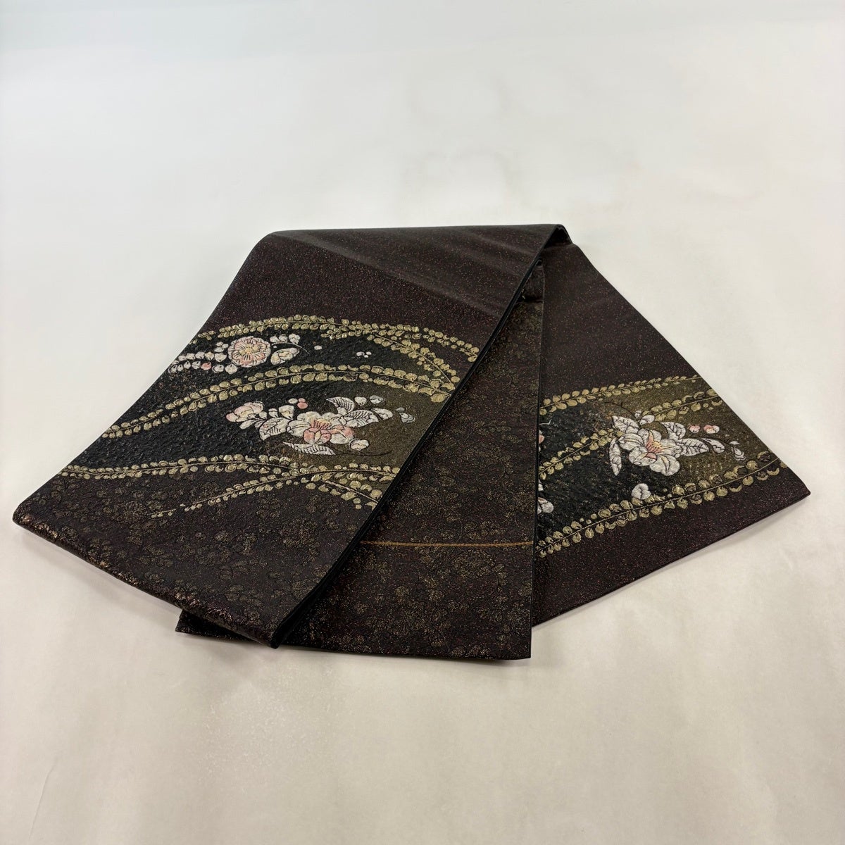 50%OFF 袋帯 秀品 草花 金糸 金彩 焦茶色 お太鼓柄 正絹 K50