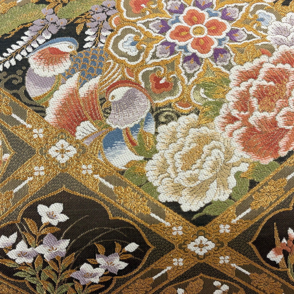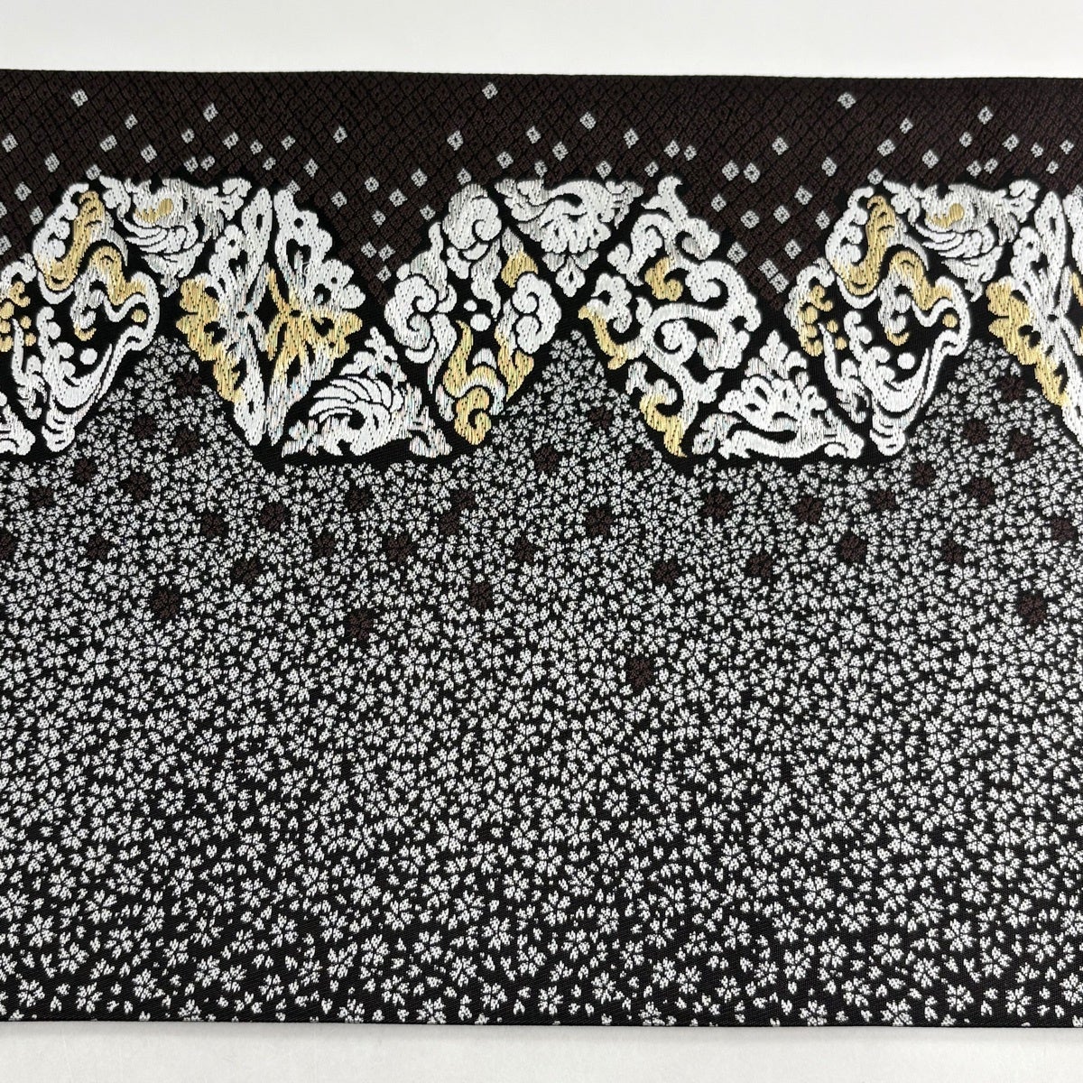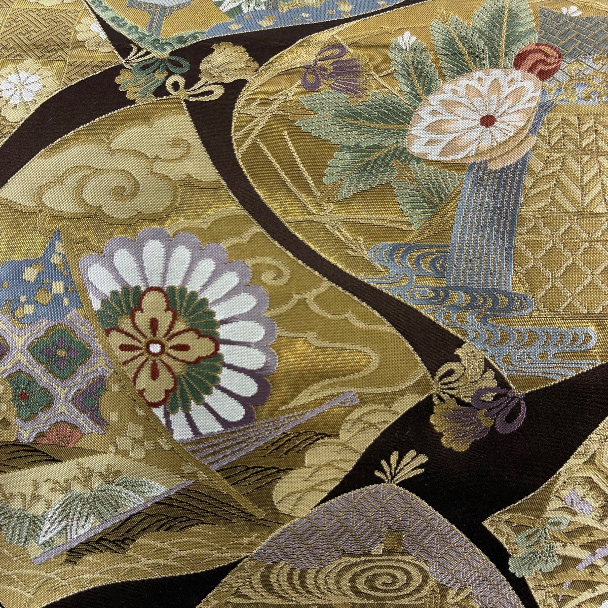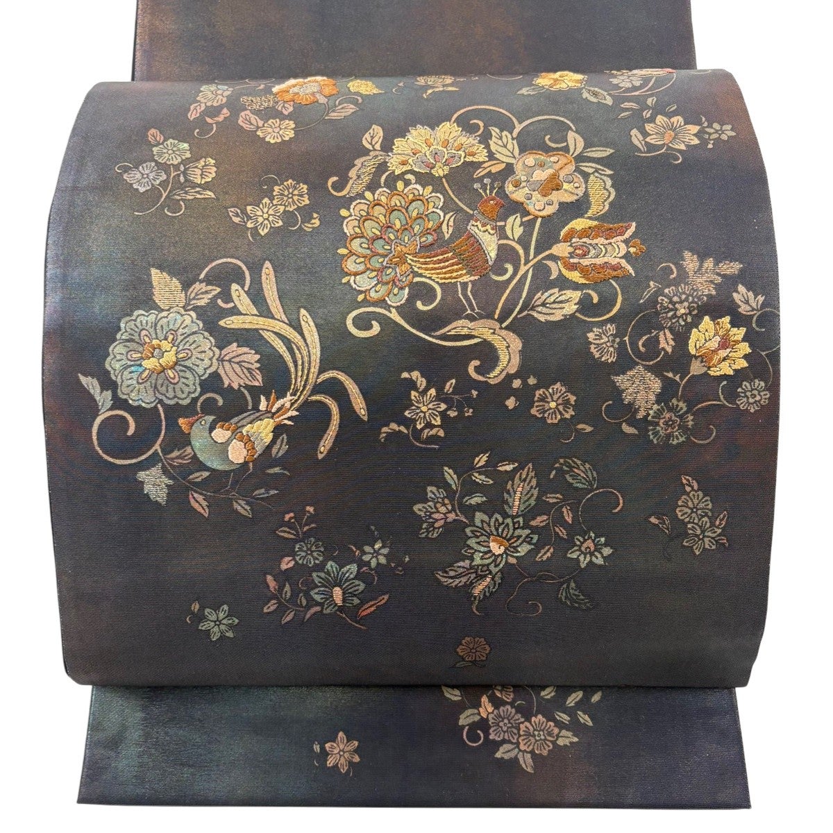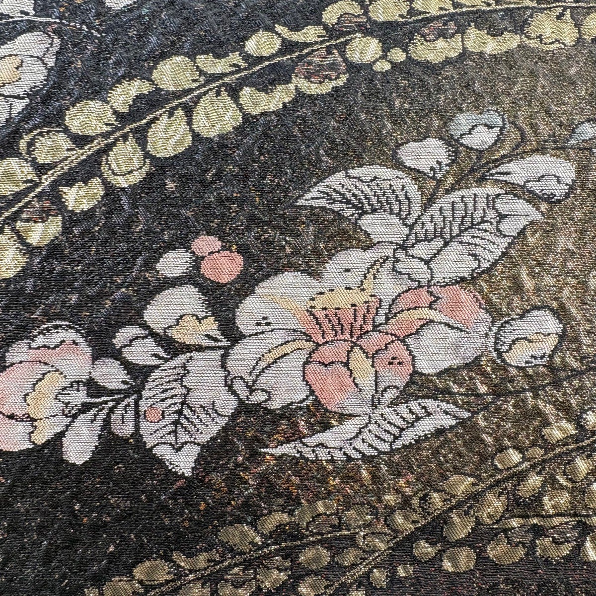 50%OFF 袋帯 秀品 草花 金糸 金彩 焦茶色 お太鼓柄 正絹 K50