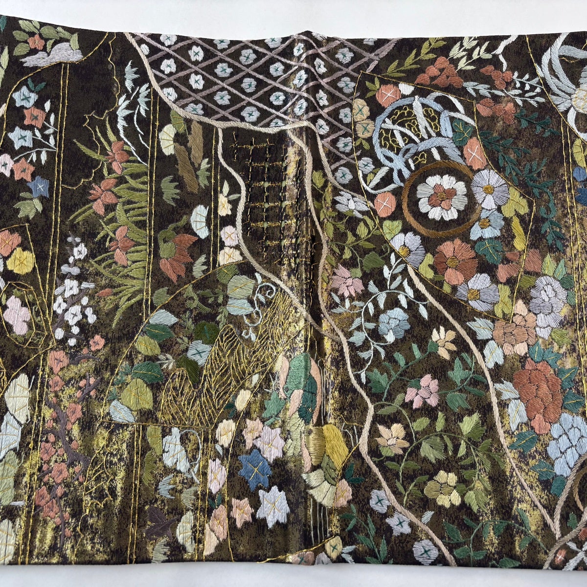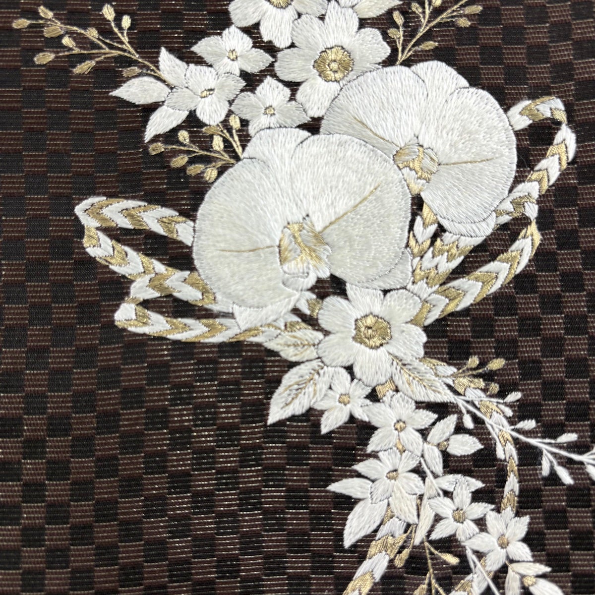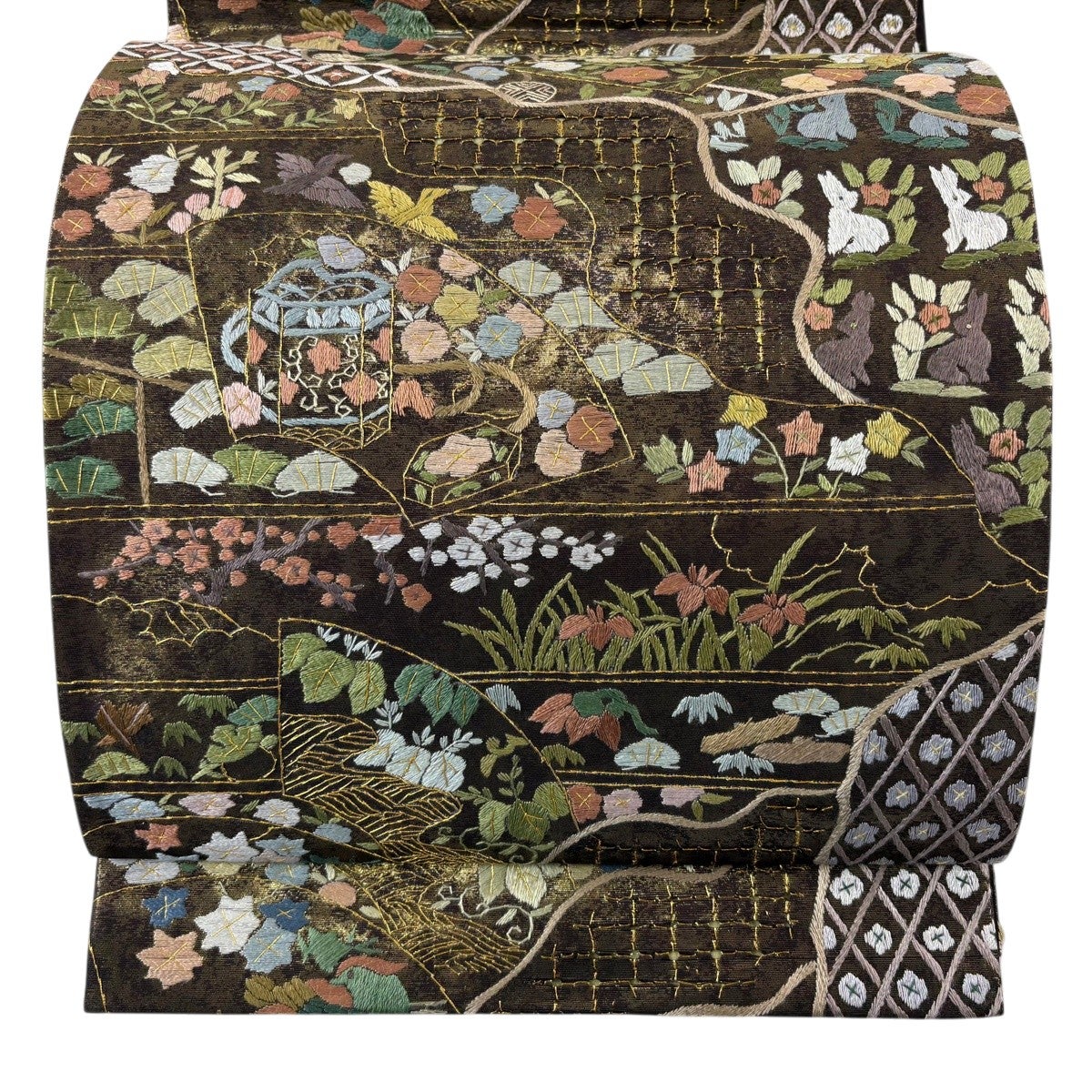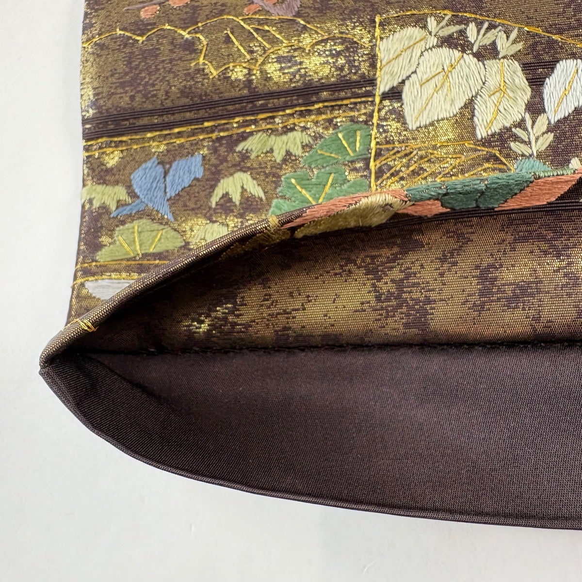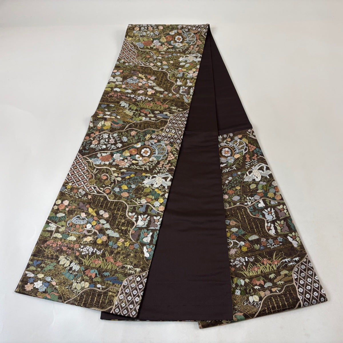 【美品】 袋帯 名品 草花 組紐 刺繍 金銀糸 焦茶色 お太鼓柄 正絹