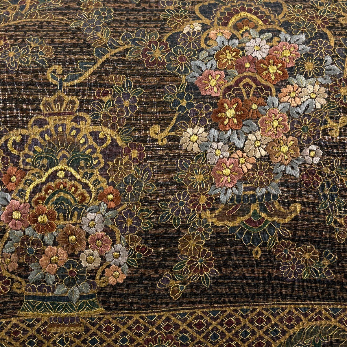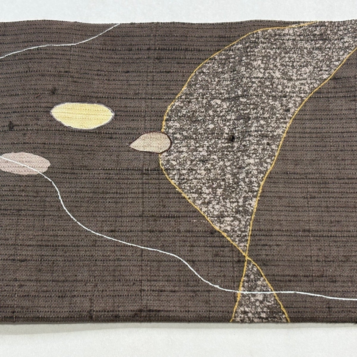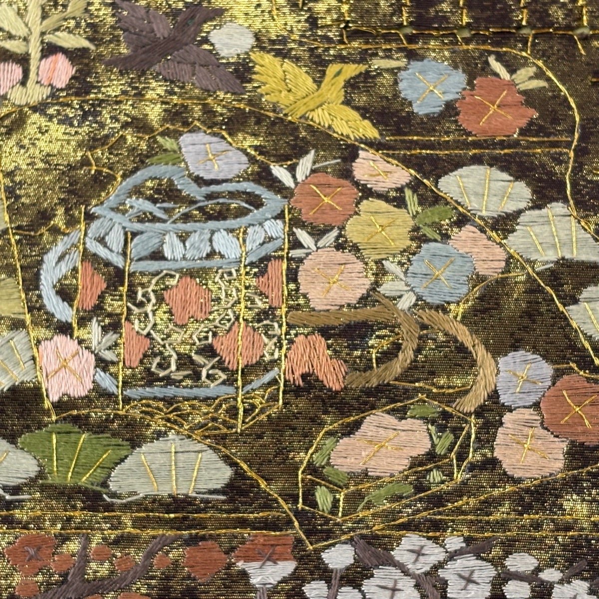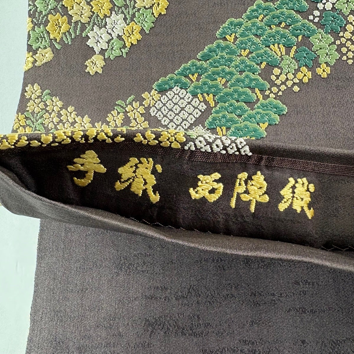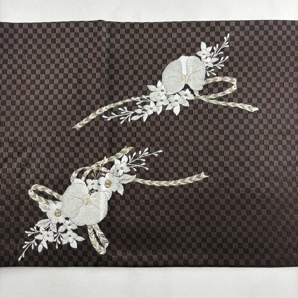【美品】 袋帯 名品 草花 組紐 刺繍 金銀糸 焦茶色 お太鼓柄 正絹