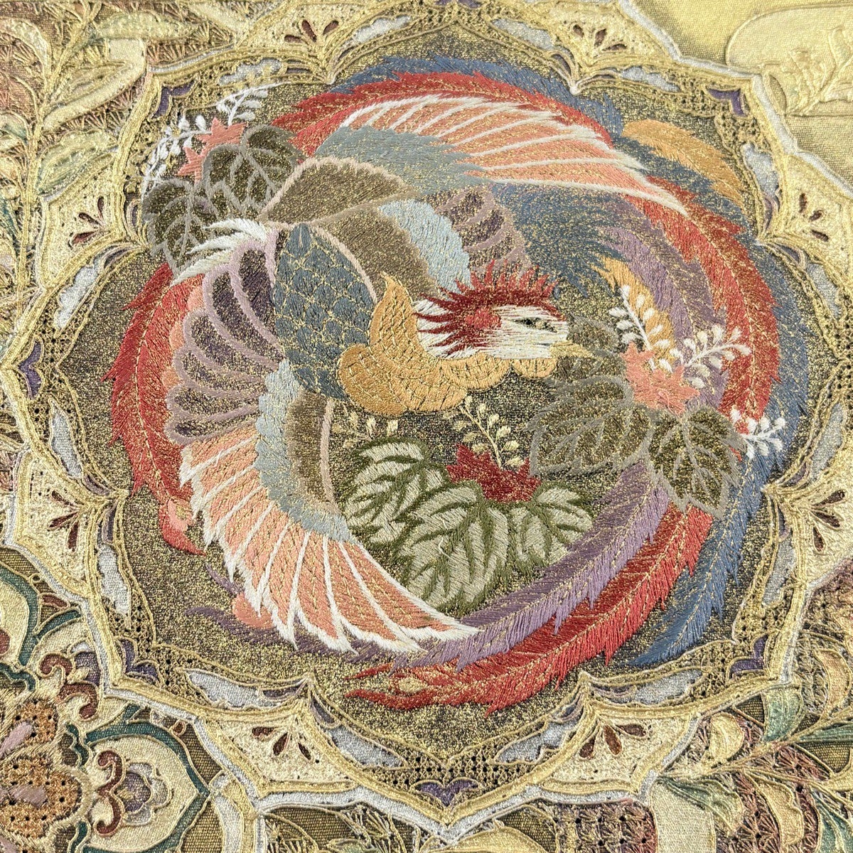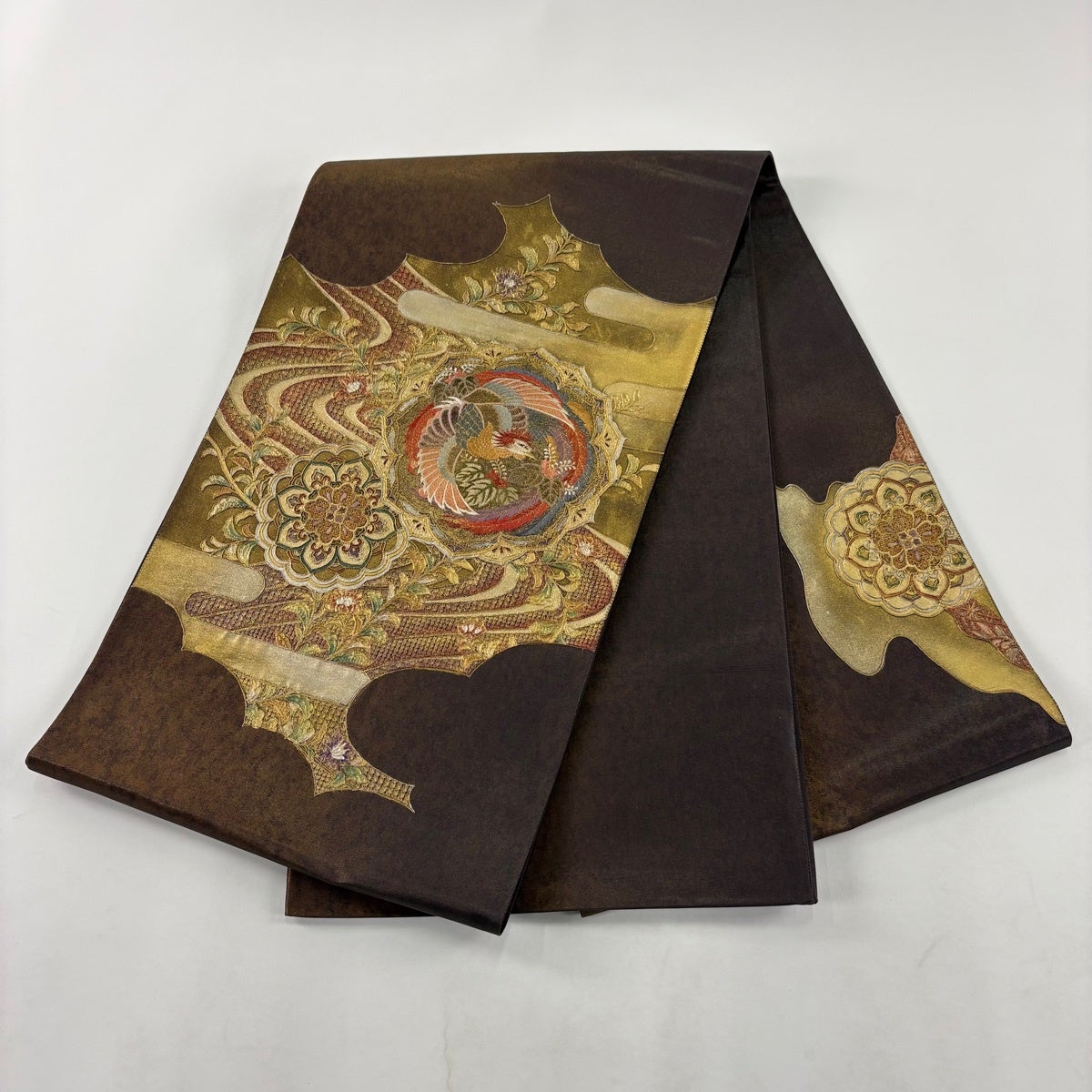 袋帯 秀品 鳳凰 華文 刺繍 金銀彩 焦茶色 お太鼓柄 正絹