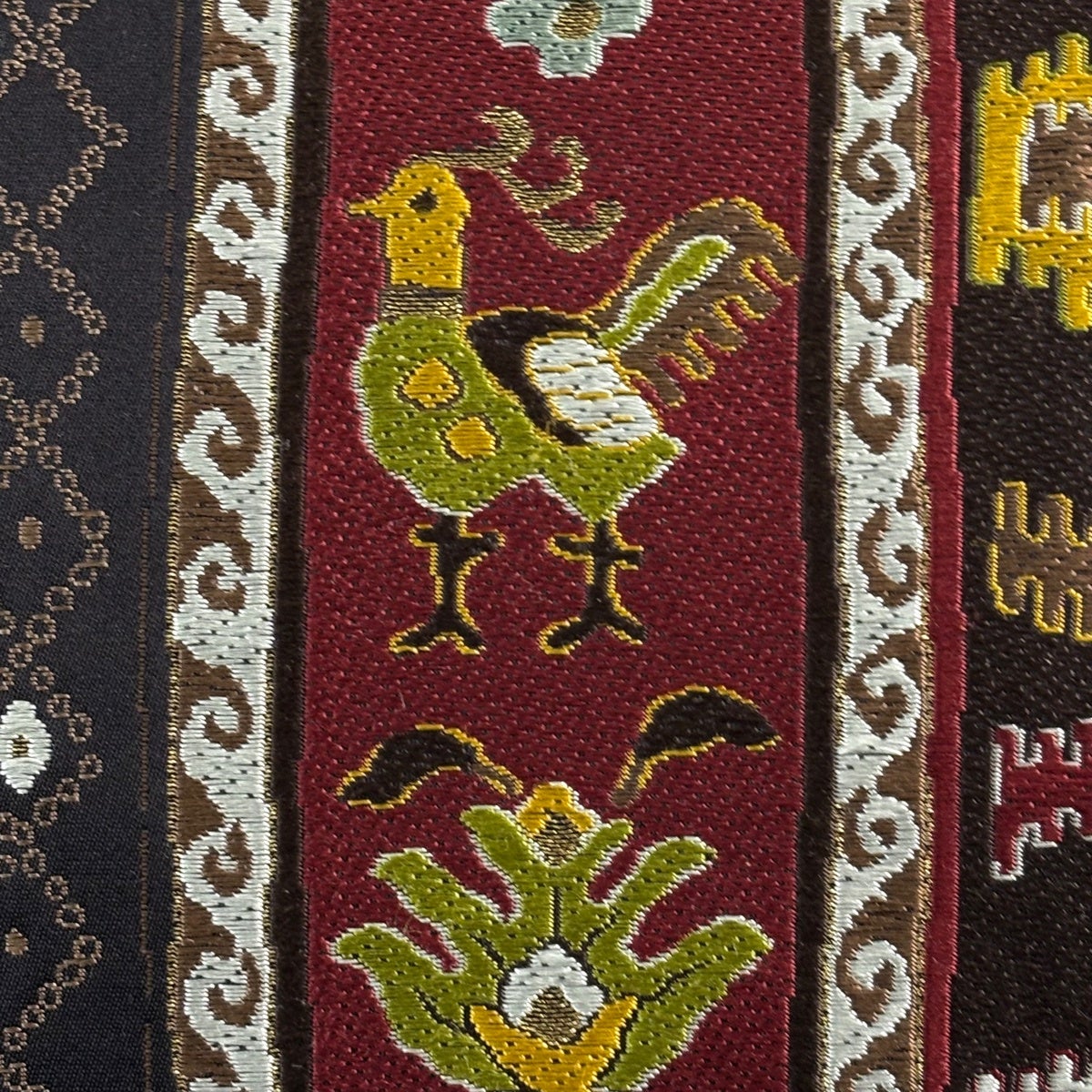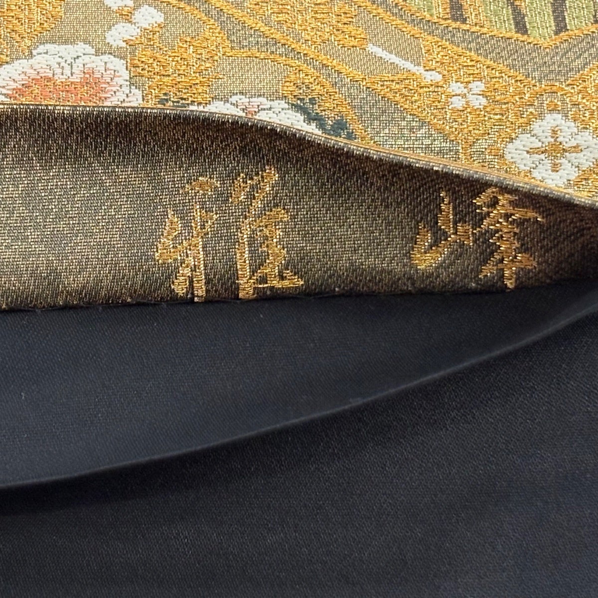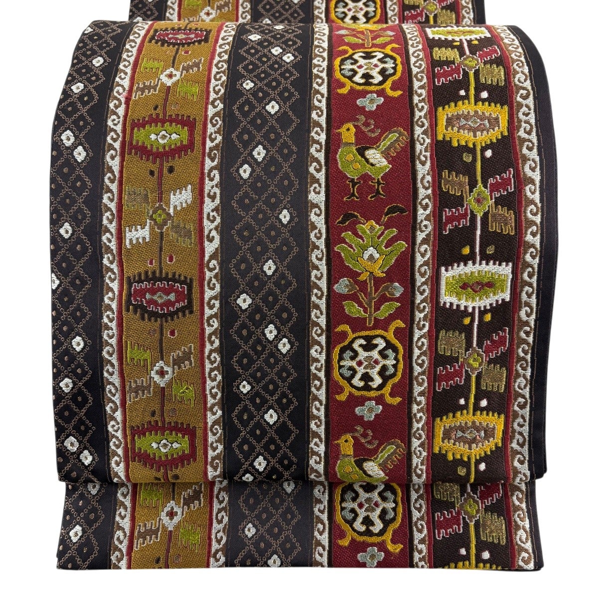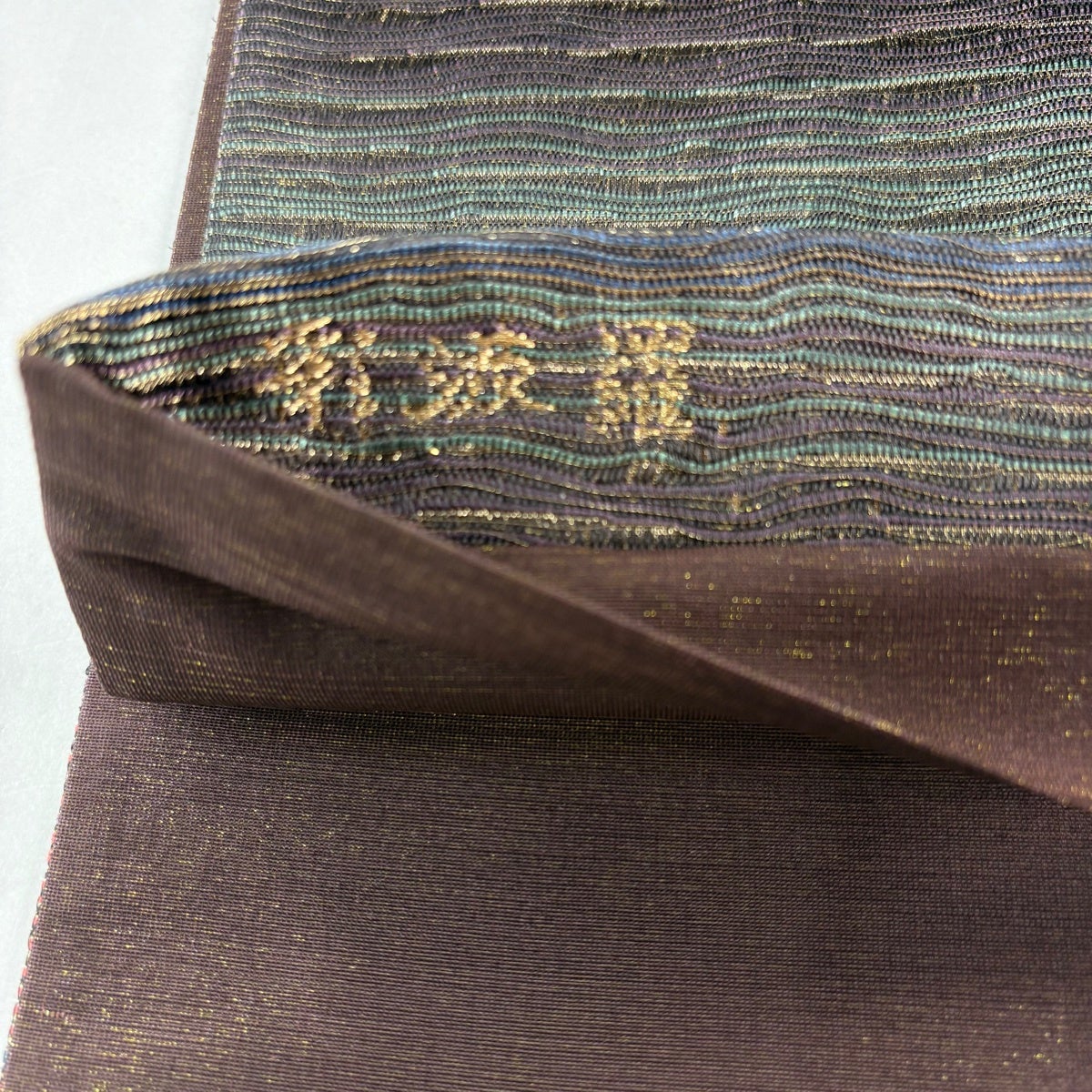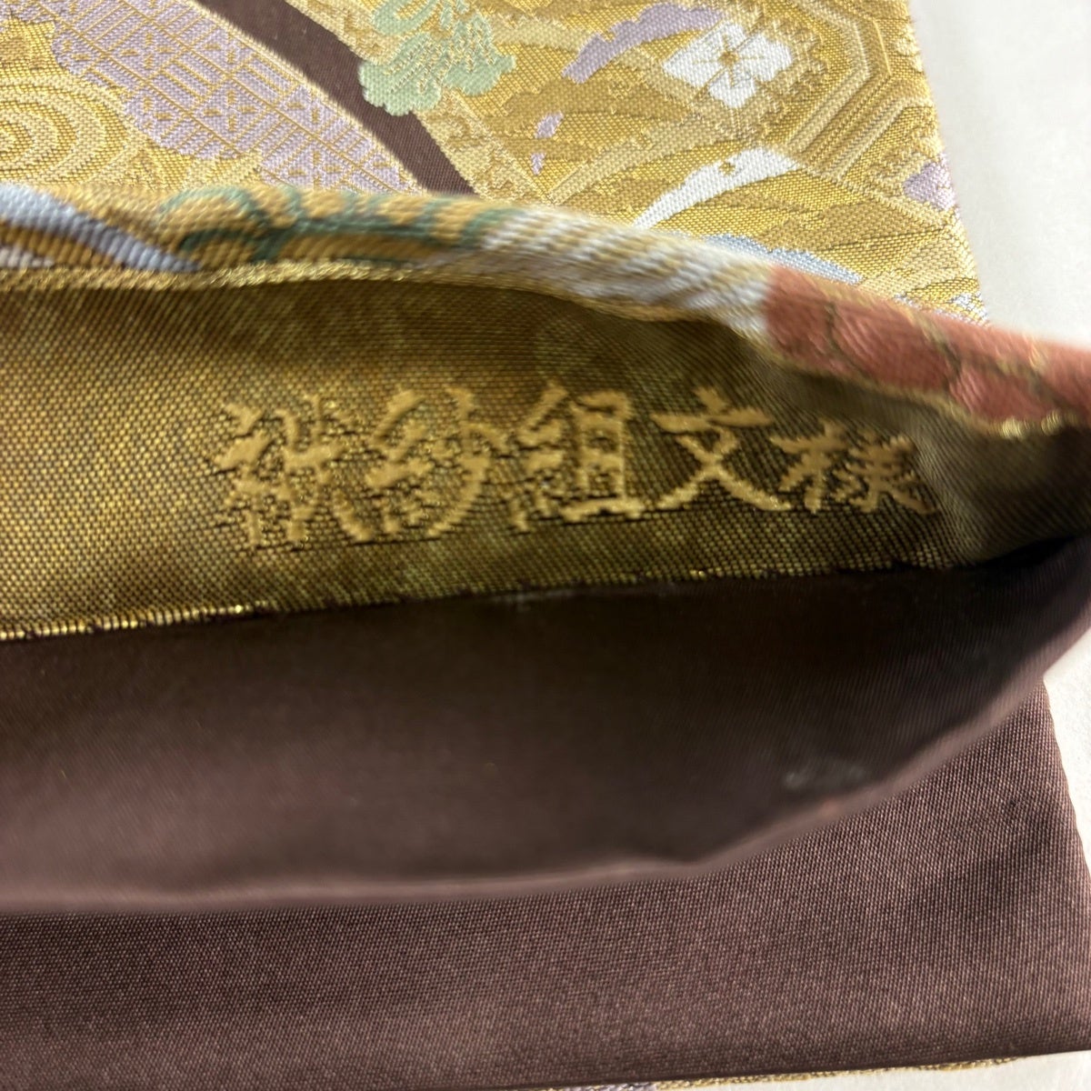 袋帯 名品 落款あり 織全丸蔵文様 花鳥 縞 金糸 焦茶色 六通 正絹