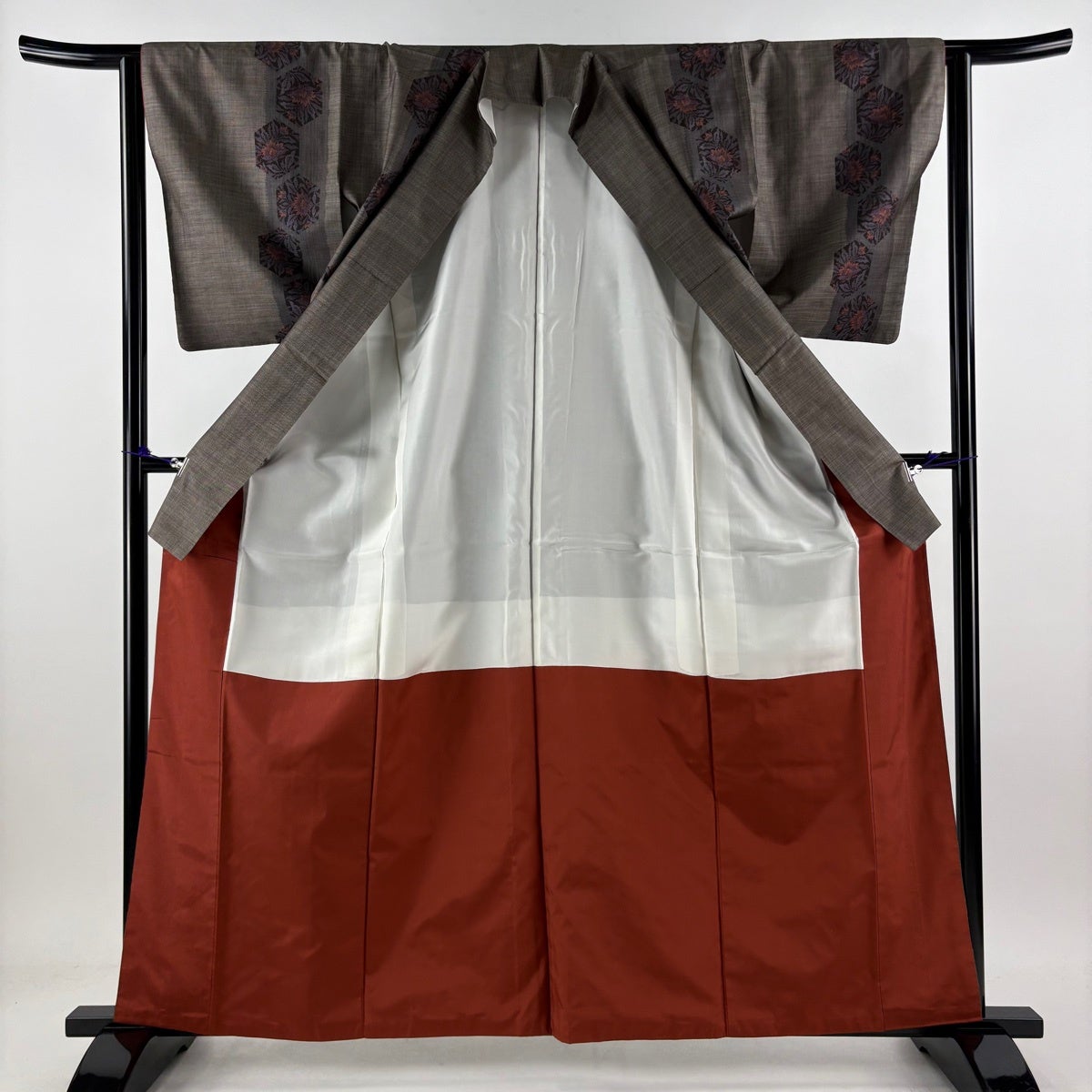 紬 身丈161cm 裄丈63cm S 袷 亀甲 草花 焦茶色 正絹 秀品