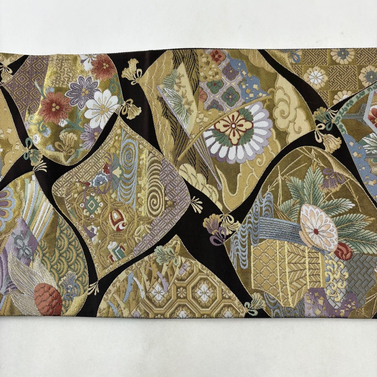 30%OFF 袋帯 秀品 雪輪 菊 金糸 箔 焦茶色 六通 正絹 K30