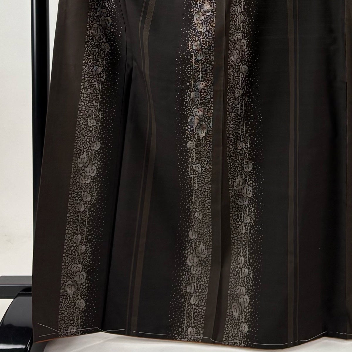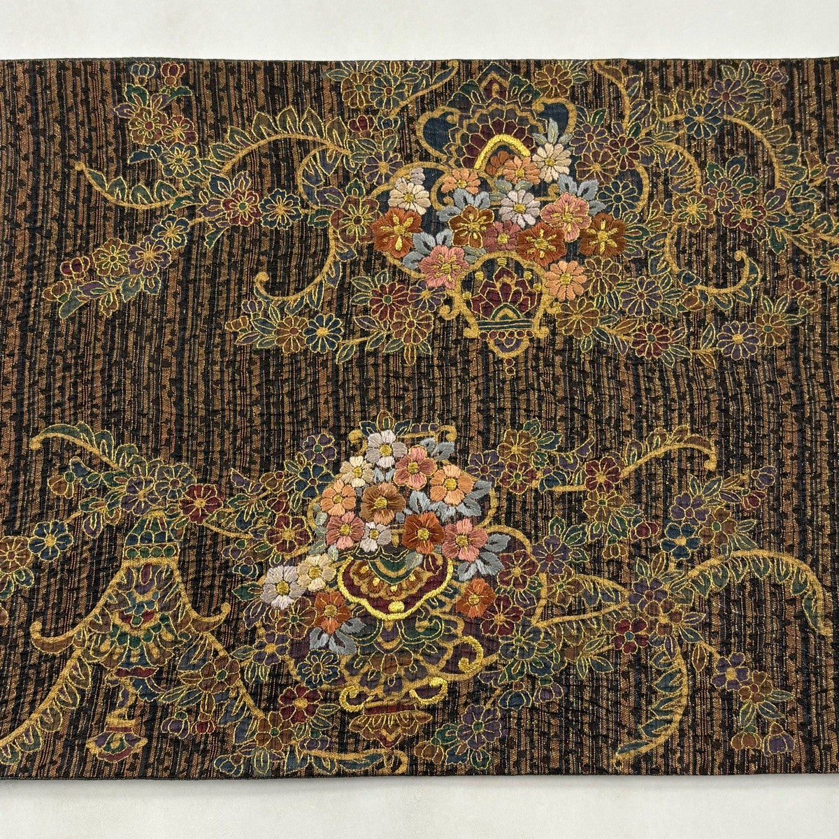 50%OFF 袋帯 秀品 草花 縞 箔 焦茶色 お太鼓柄 正絹 K50