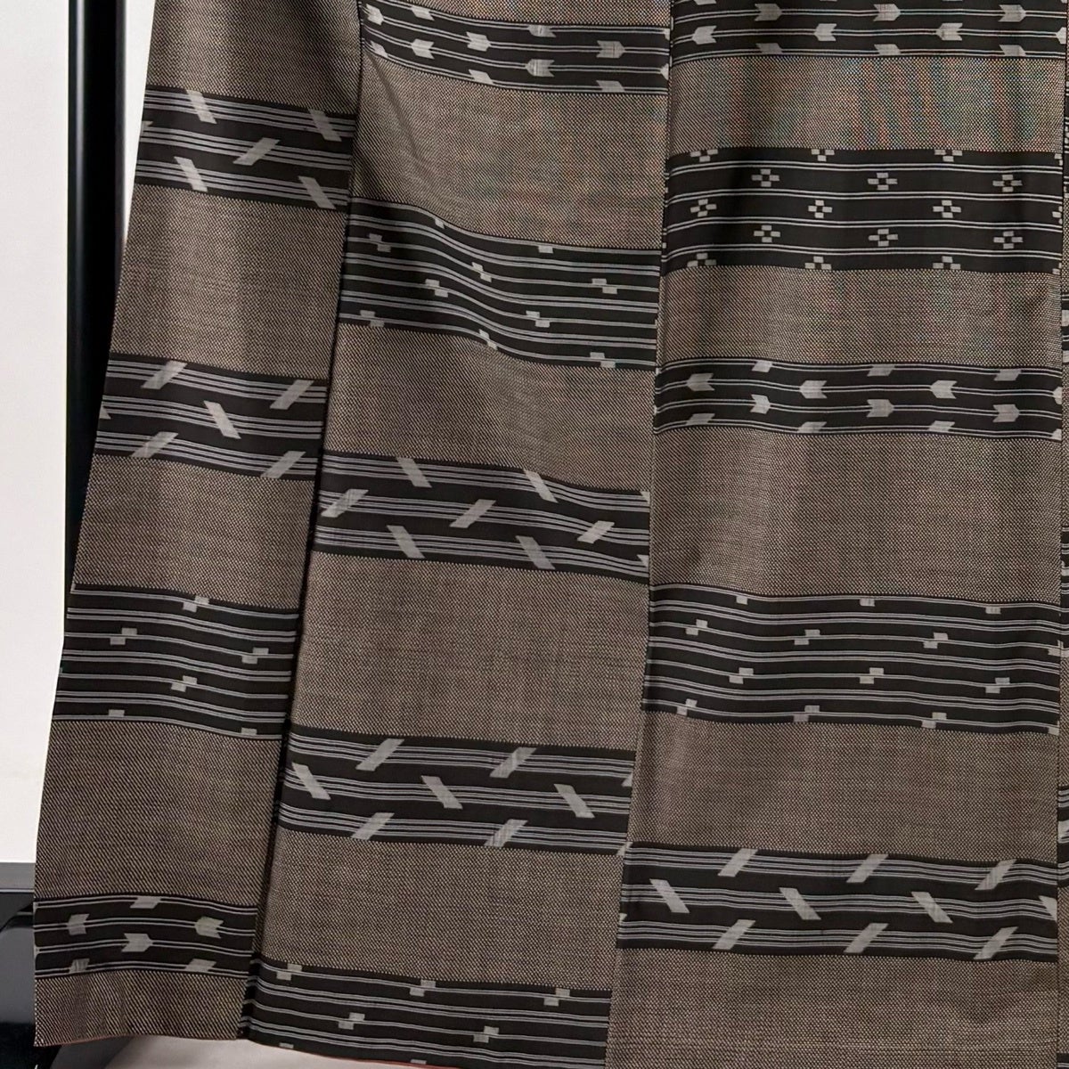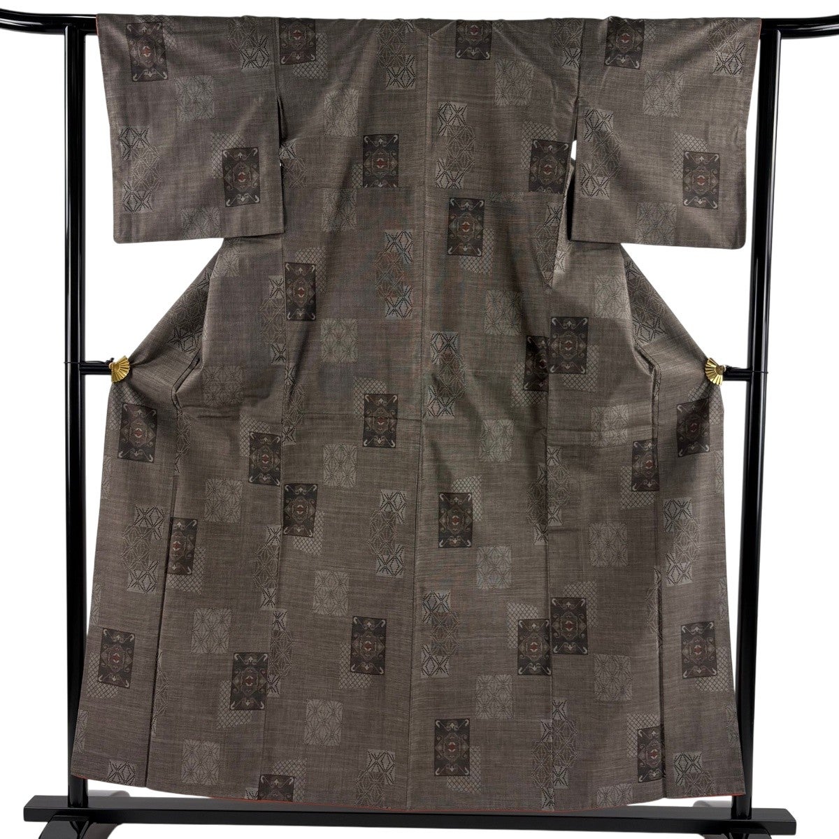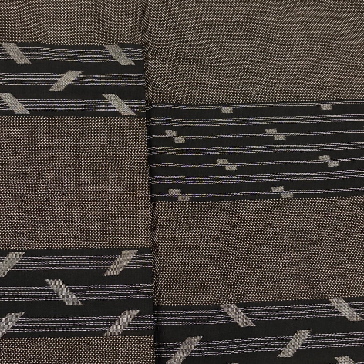 紬 身丈168.5cm 裄丈64cm M 袷 段縞 幾何学 焦茶色 正絹 秀品