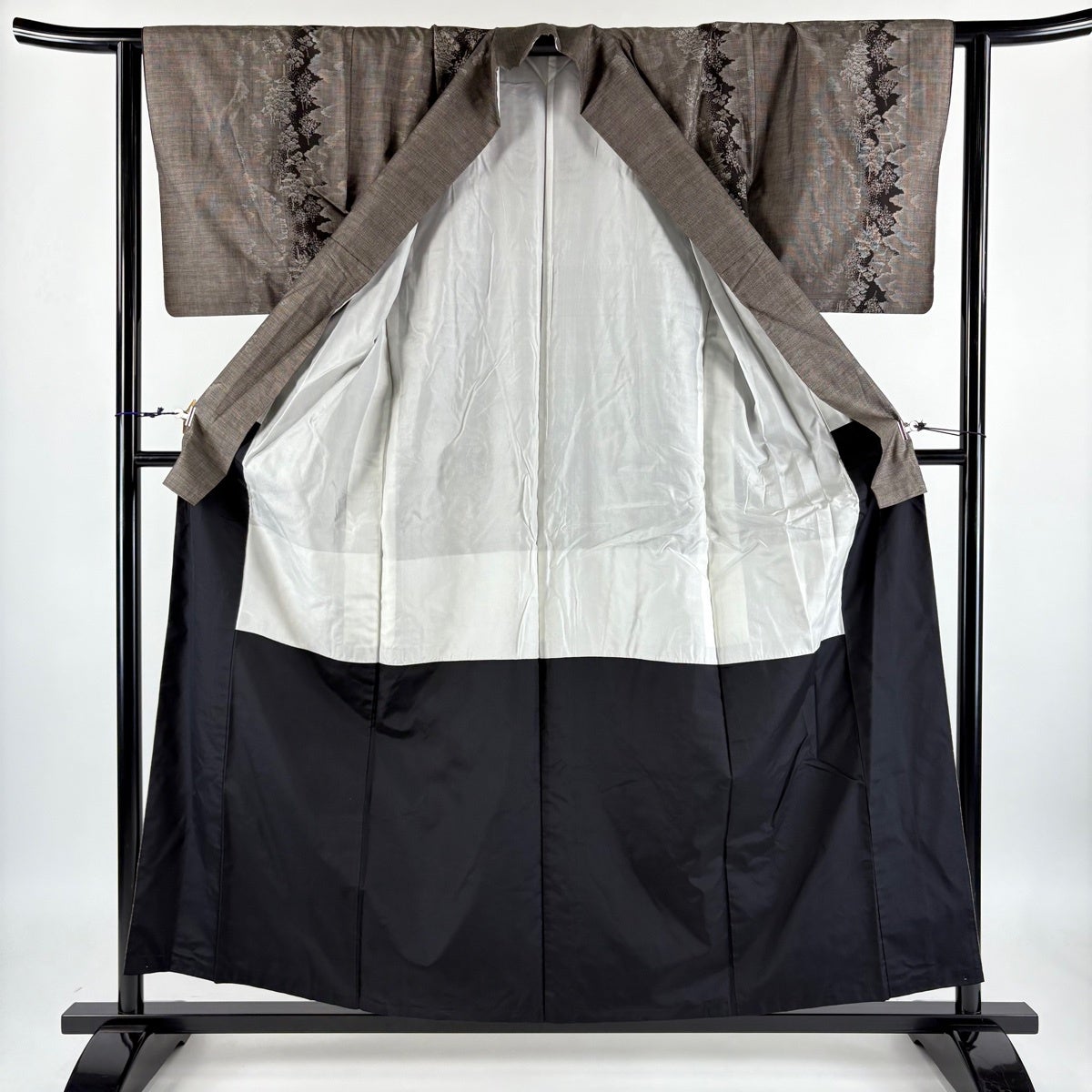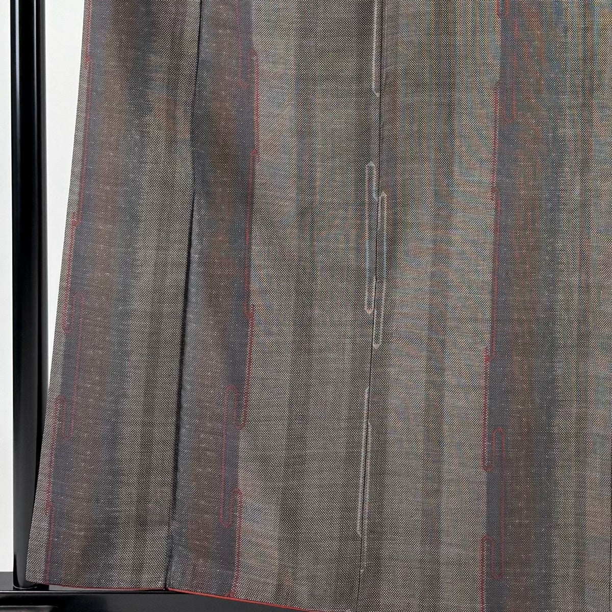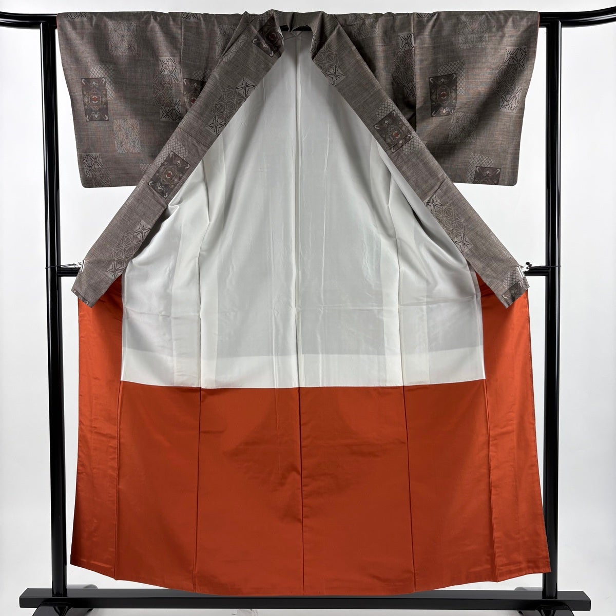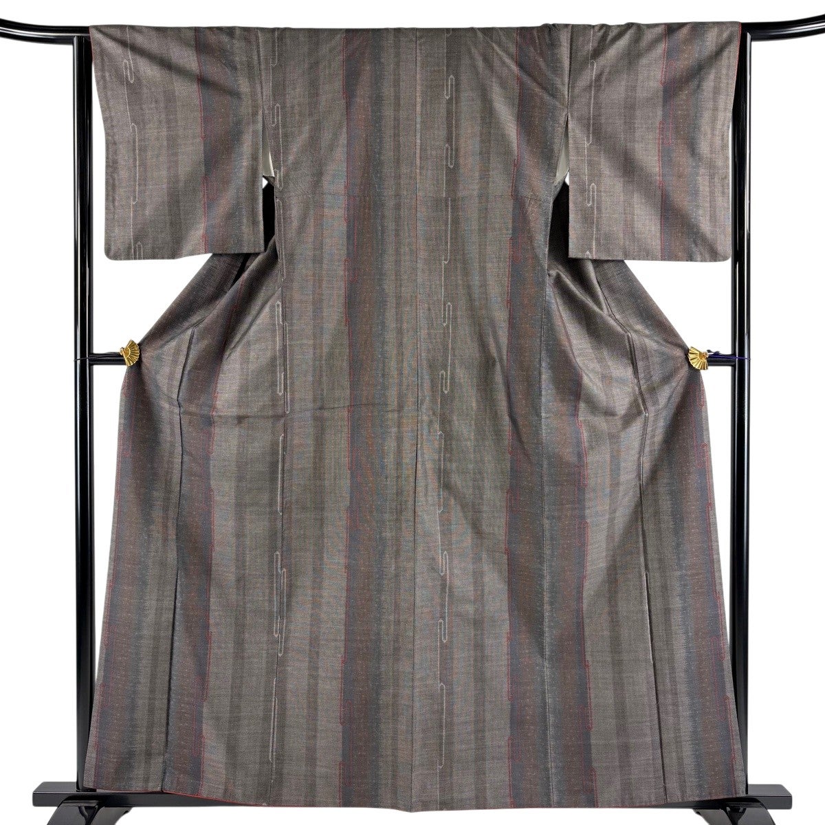 紬 身丈168.5cm 裄丈64cm M 袷 段縞 幾何学 焦茶色 正絹 秀品
