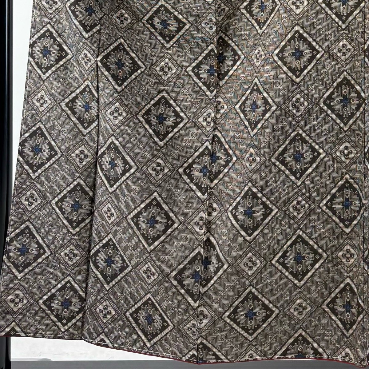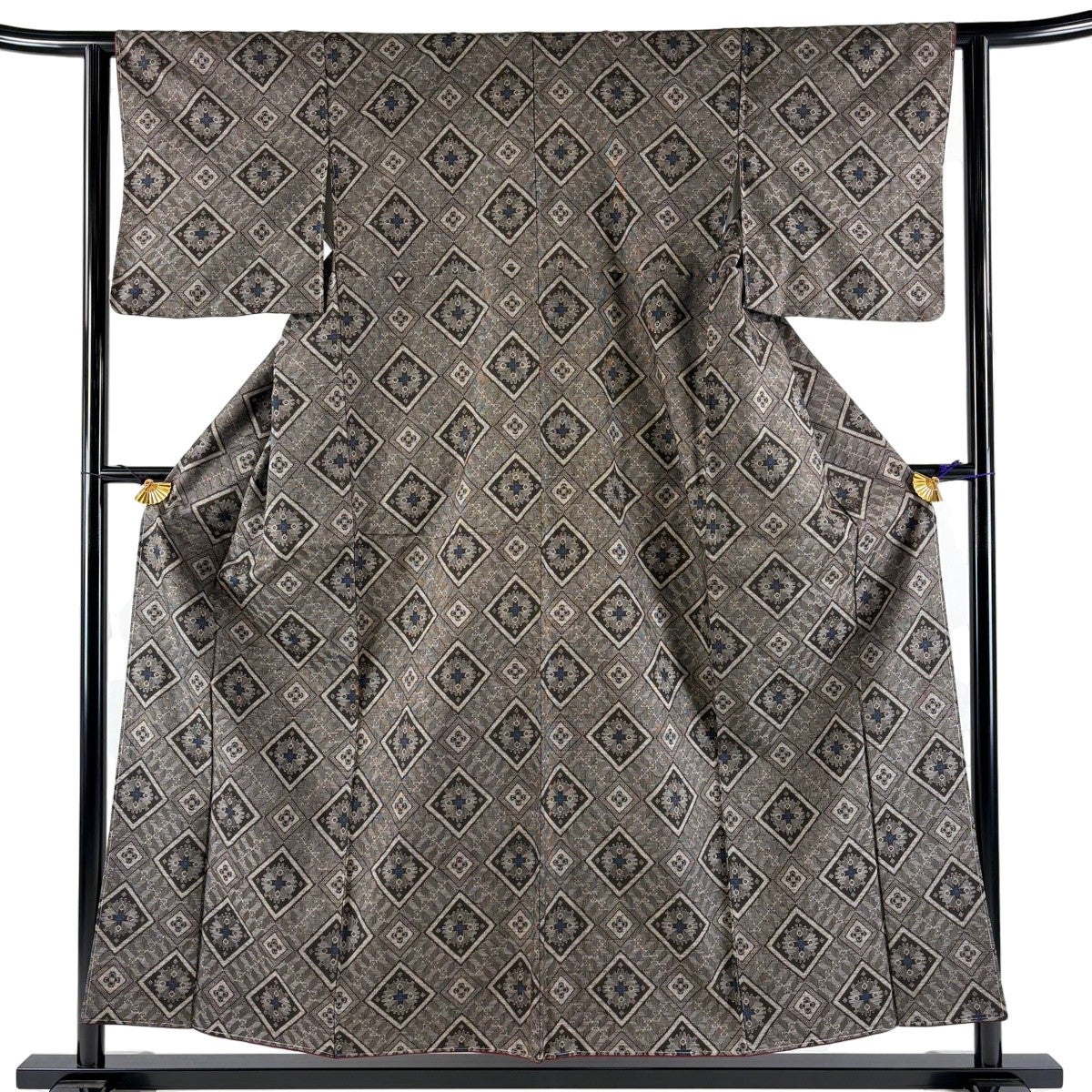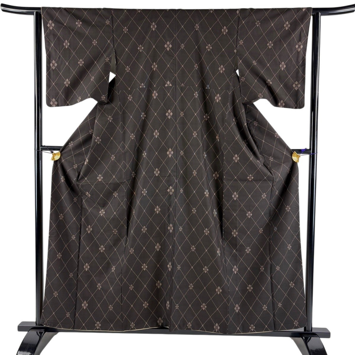 紬 身丈157.5cm 裄丈62.5cm S 袷 斜め格子 菱 焦茶色 正絹 秀品