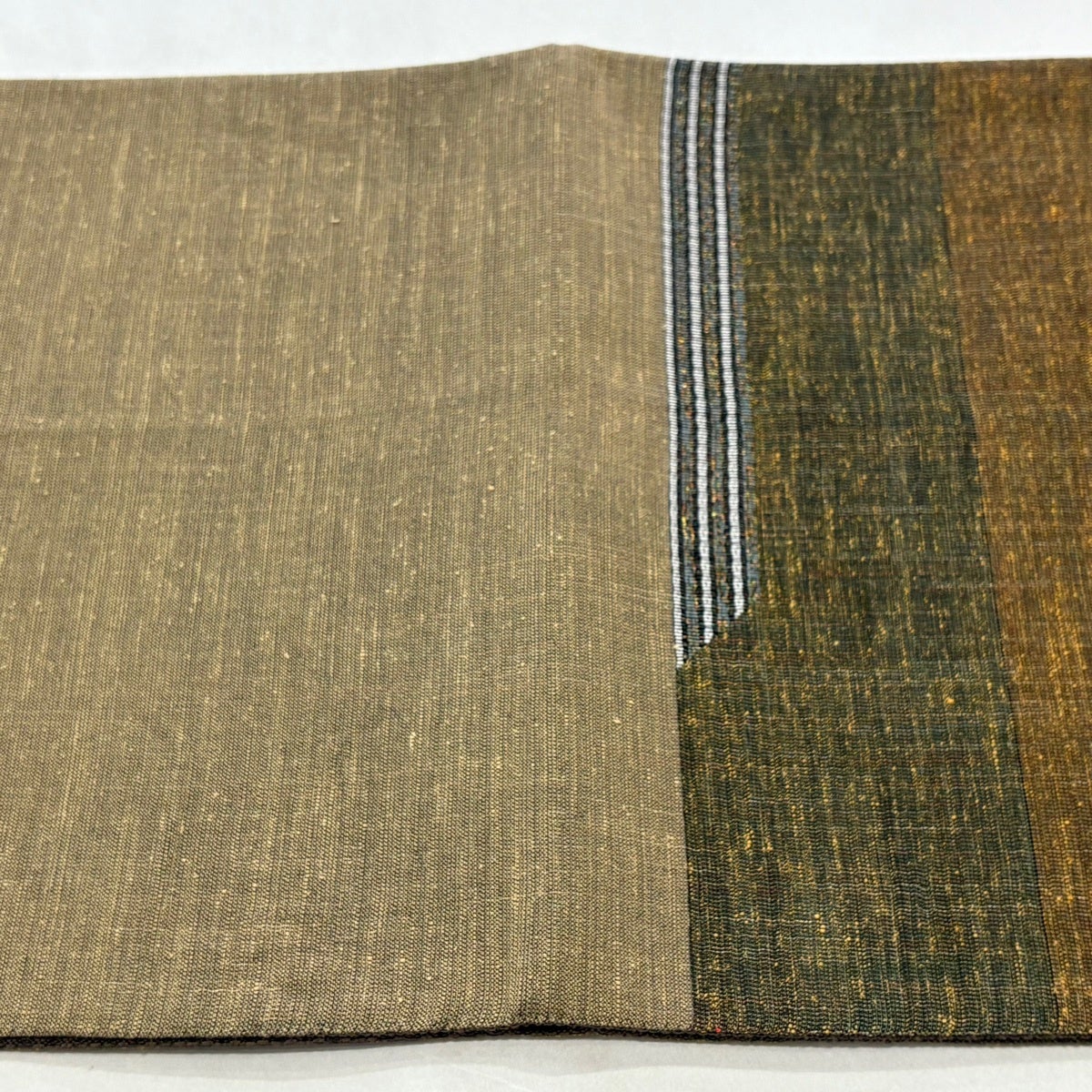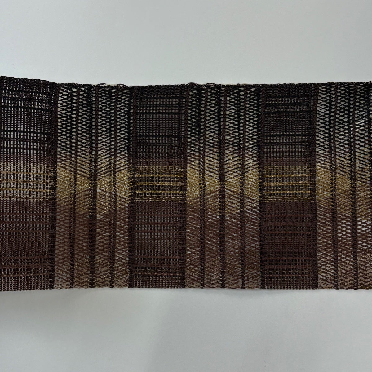 【美品】 名古屋帯 秀品 夏帯 八寸名古屋帯 段縞 幾何学模様 金糸 焦茶色 正絹