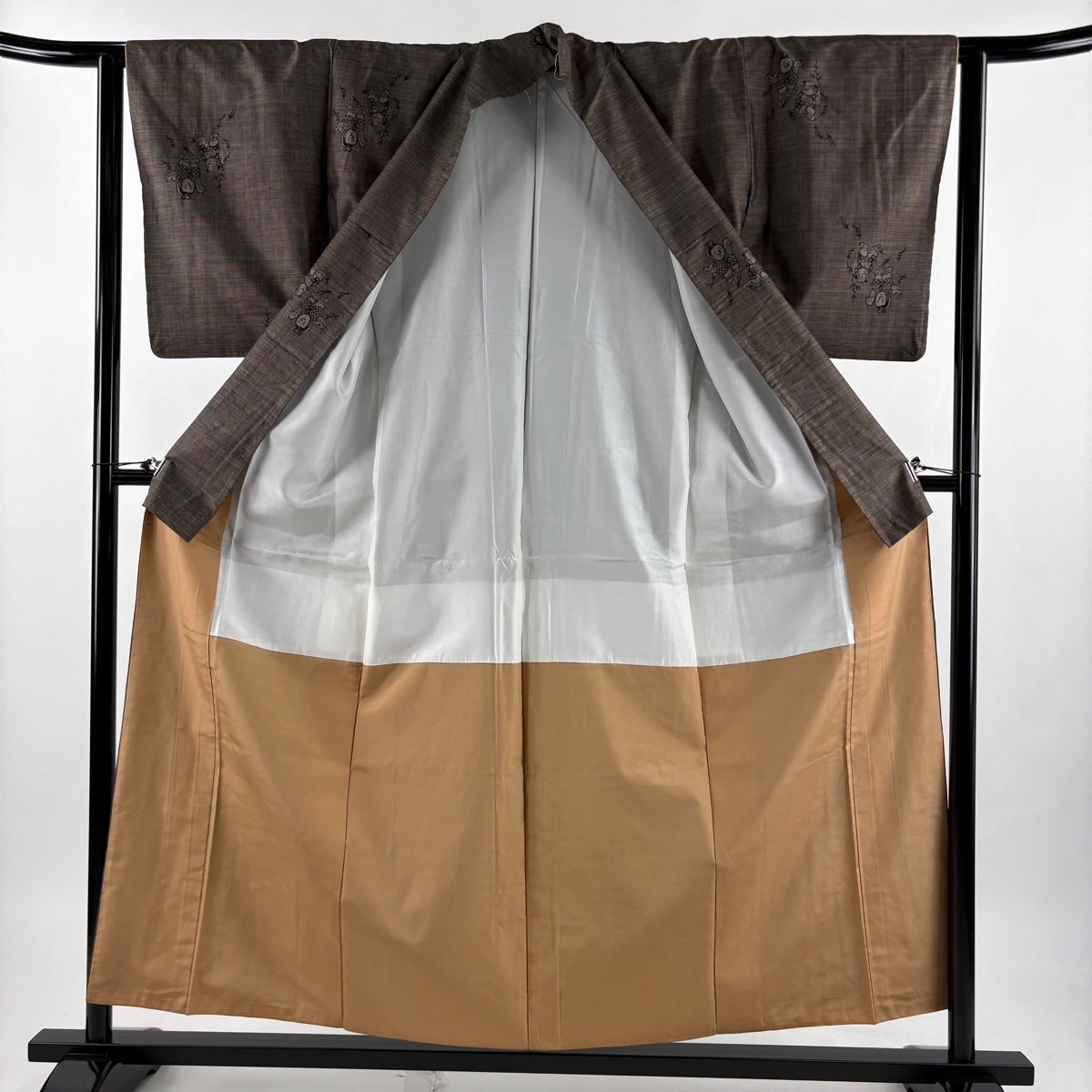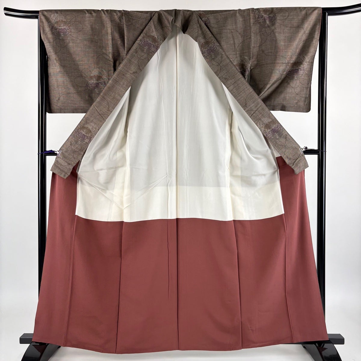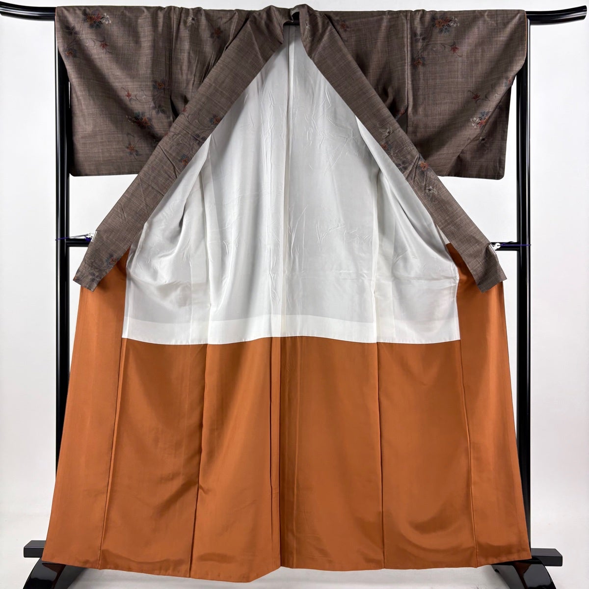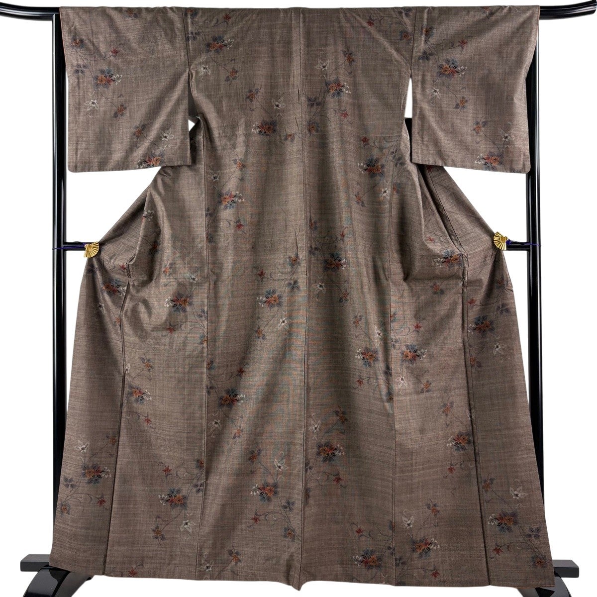 【美品】 紬 身丈155cm 裄丈65cm M 袷 草花 縞 焦茶色 正絹 秀品
