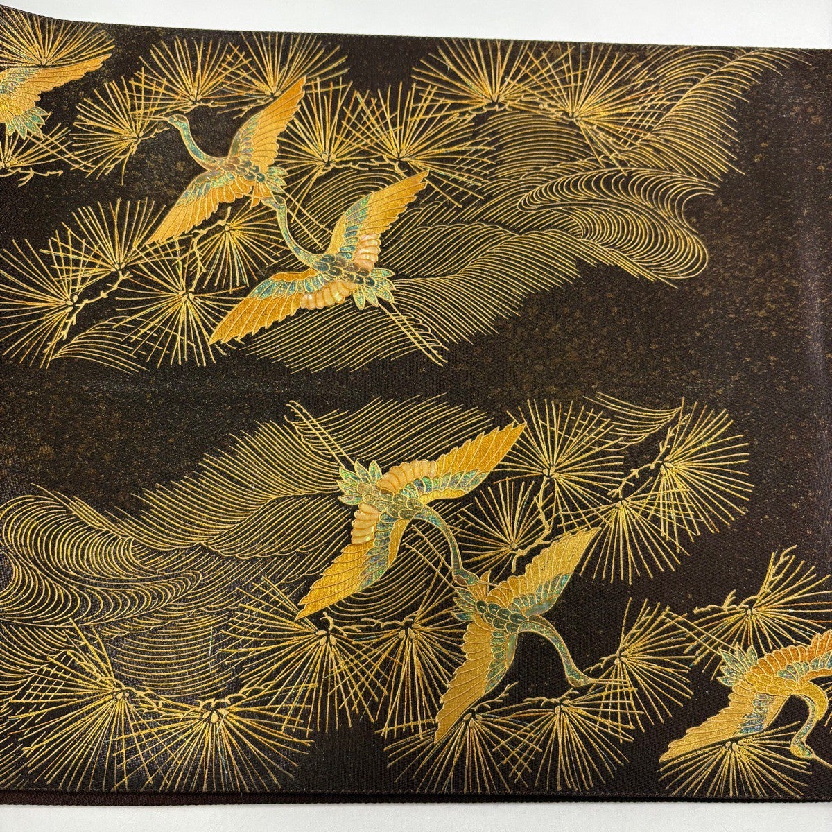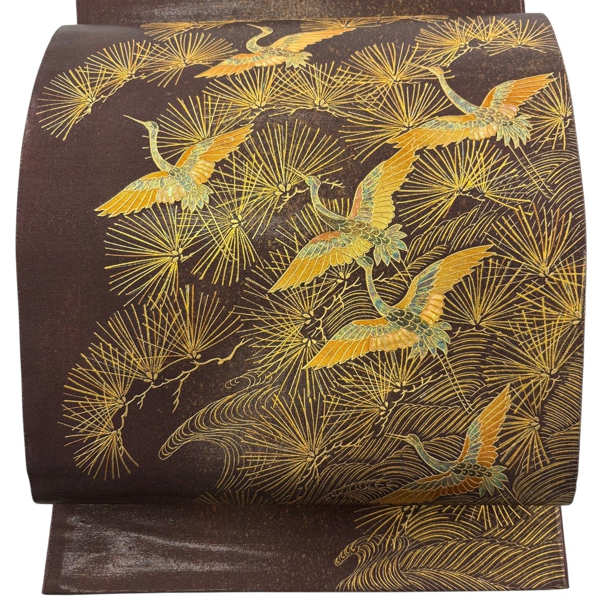 【美品】 袋帯 名品 落款あり 若松 鶴 螺鈿 金彩 焦茶色 お太鼓柄 正絹