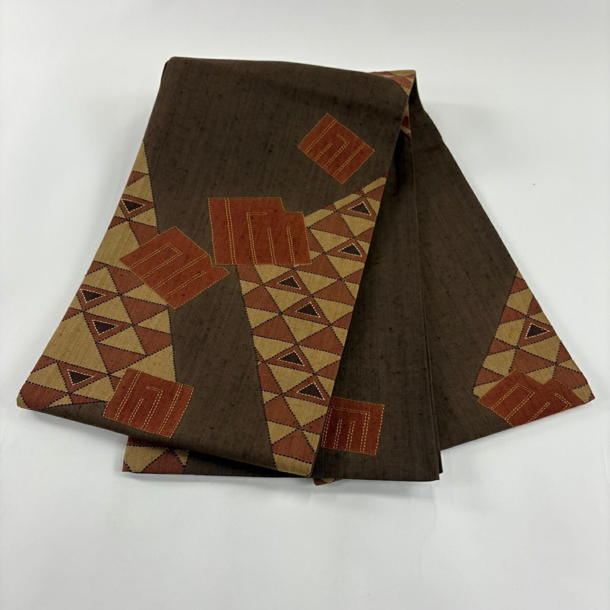 【美品】 名古屋帯 優品 八寸名古屋帯 松葉仕立て 幾何学模様 紬地 焦茶色 正絹