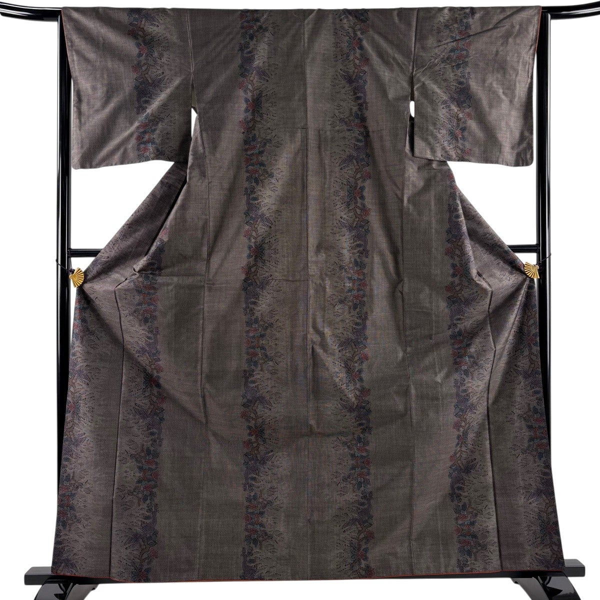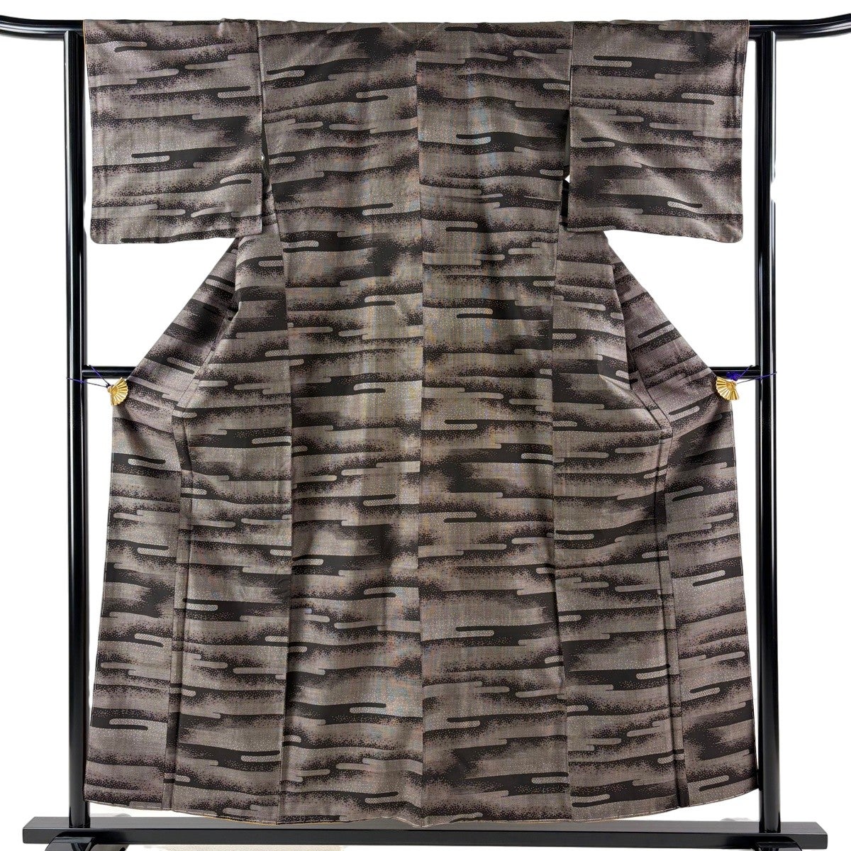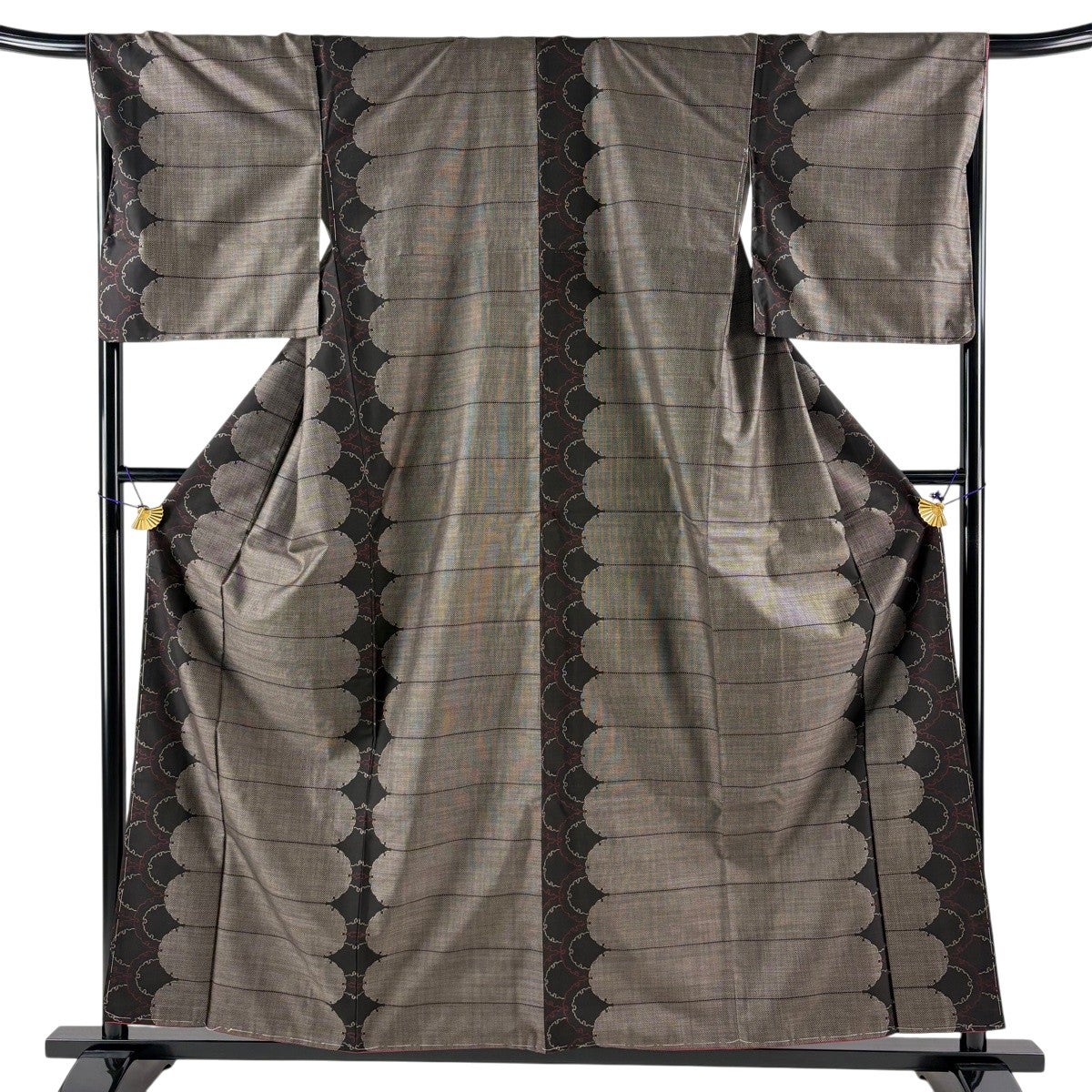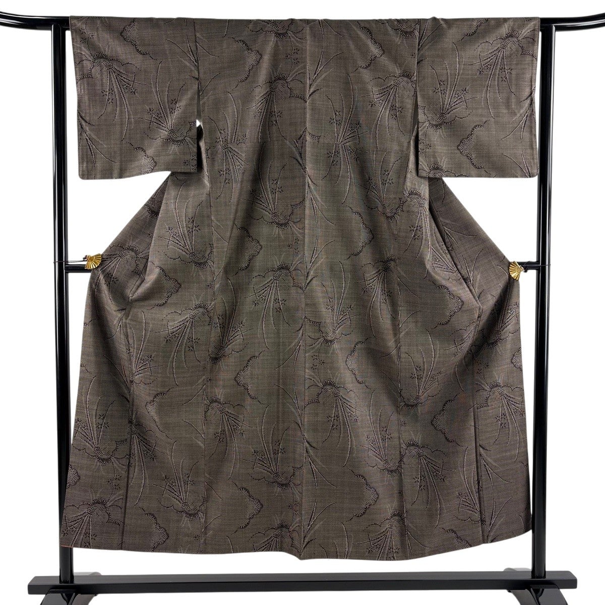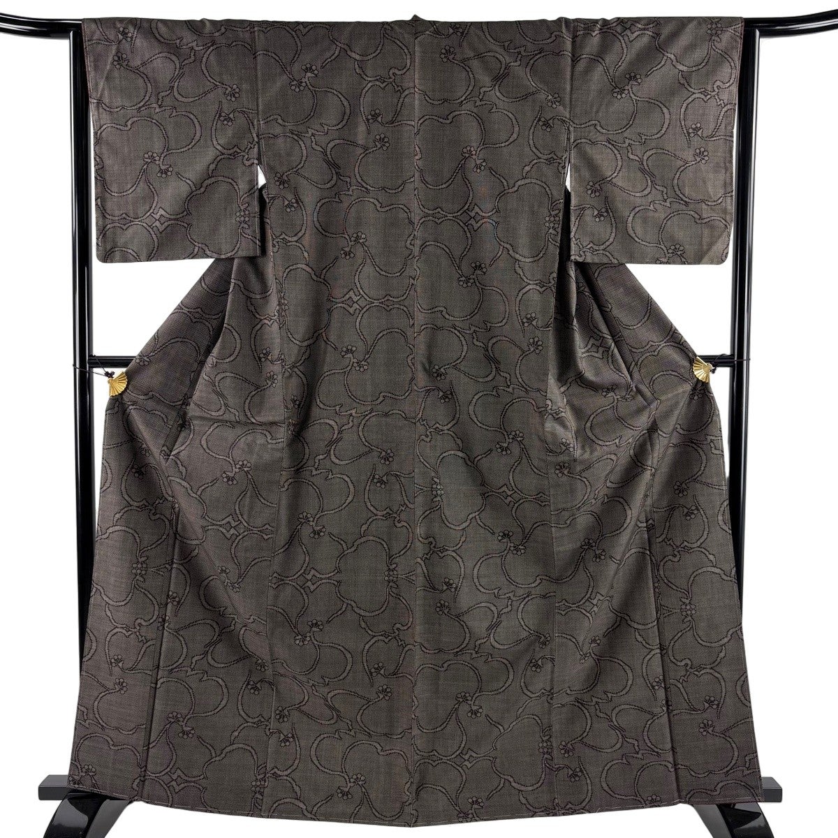 【美品】 お召 身丈164.5cm 裄丈67cm M 袷 麻の葉 焦茶色 正絹 逸品