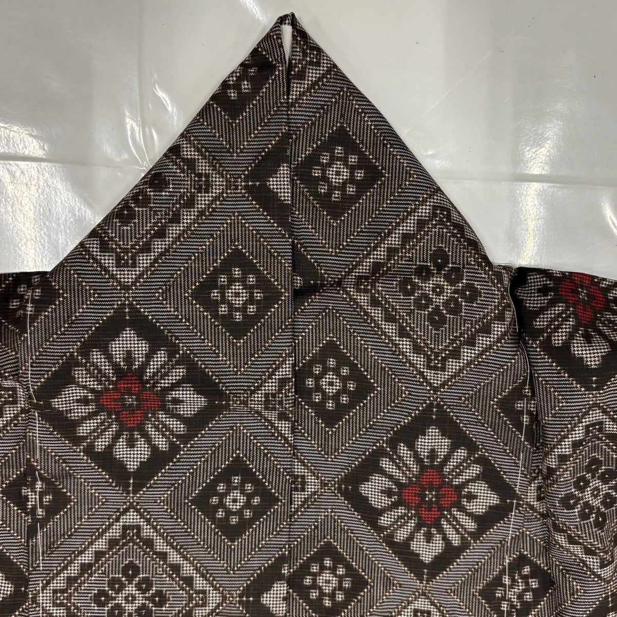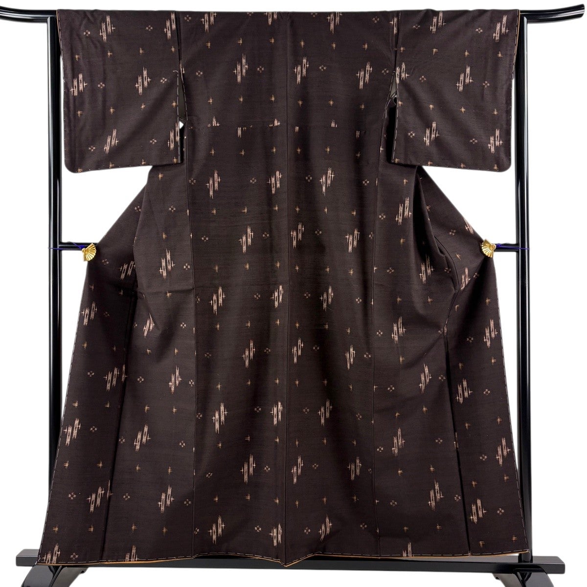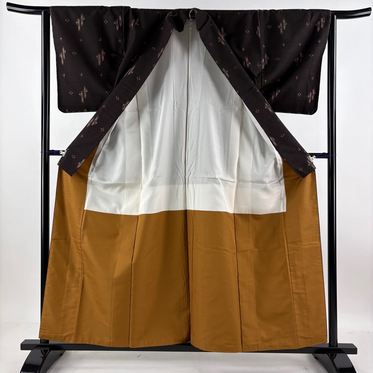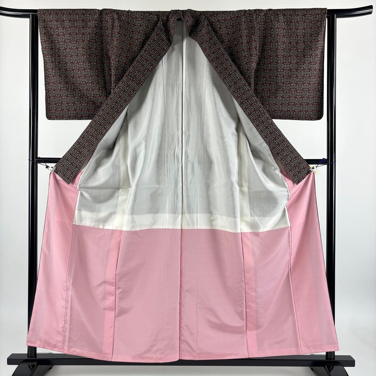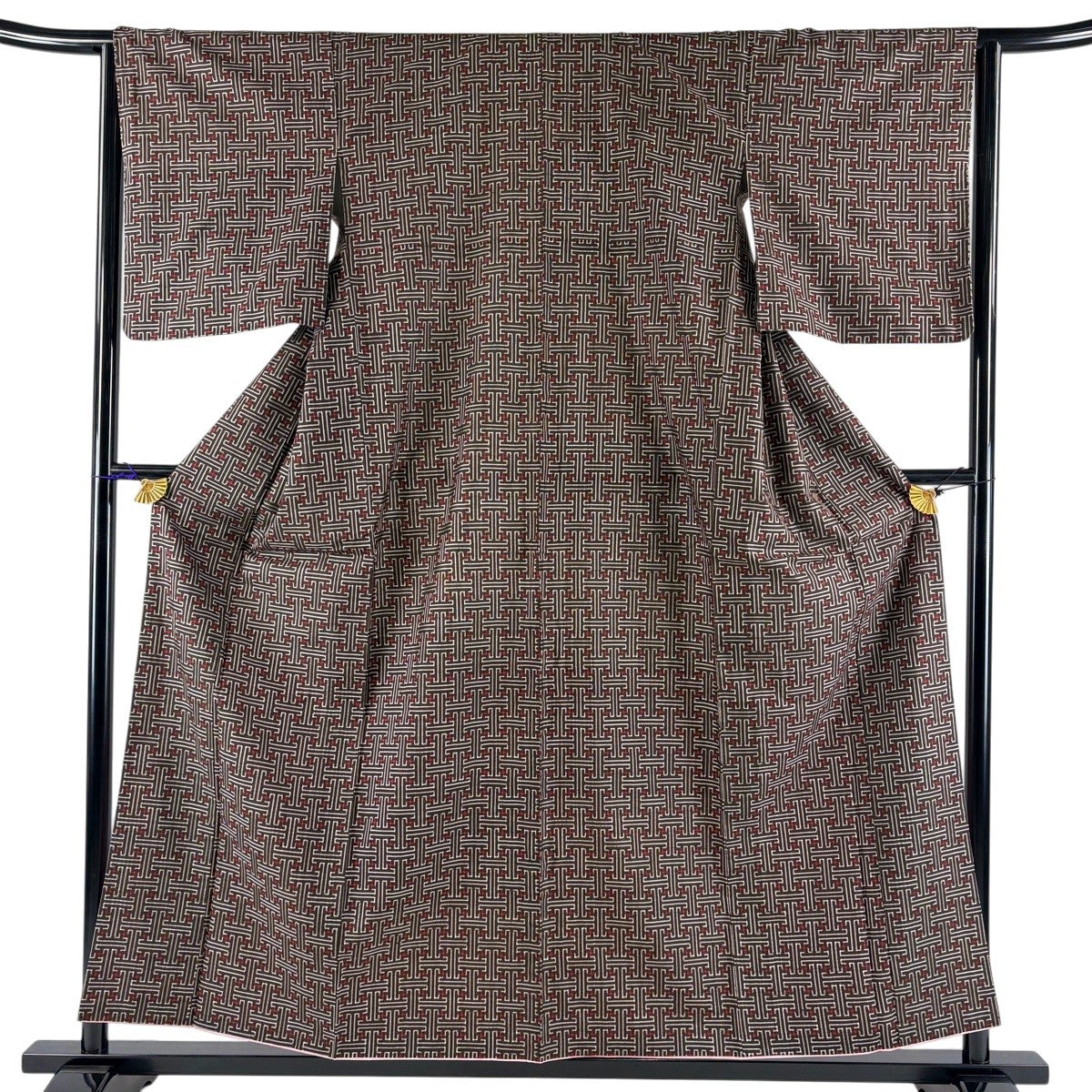 紬 身丈152cm 裄丈64cm M 袷 アンサンブル 幾何学 焦茶色 正絹 逸品