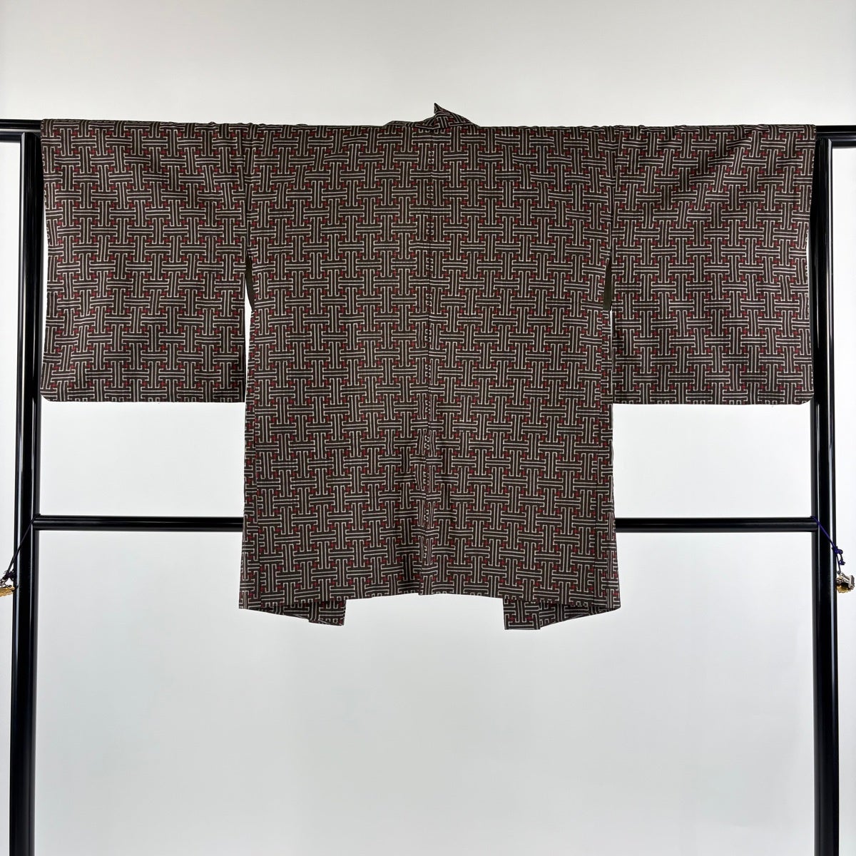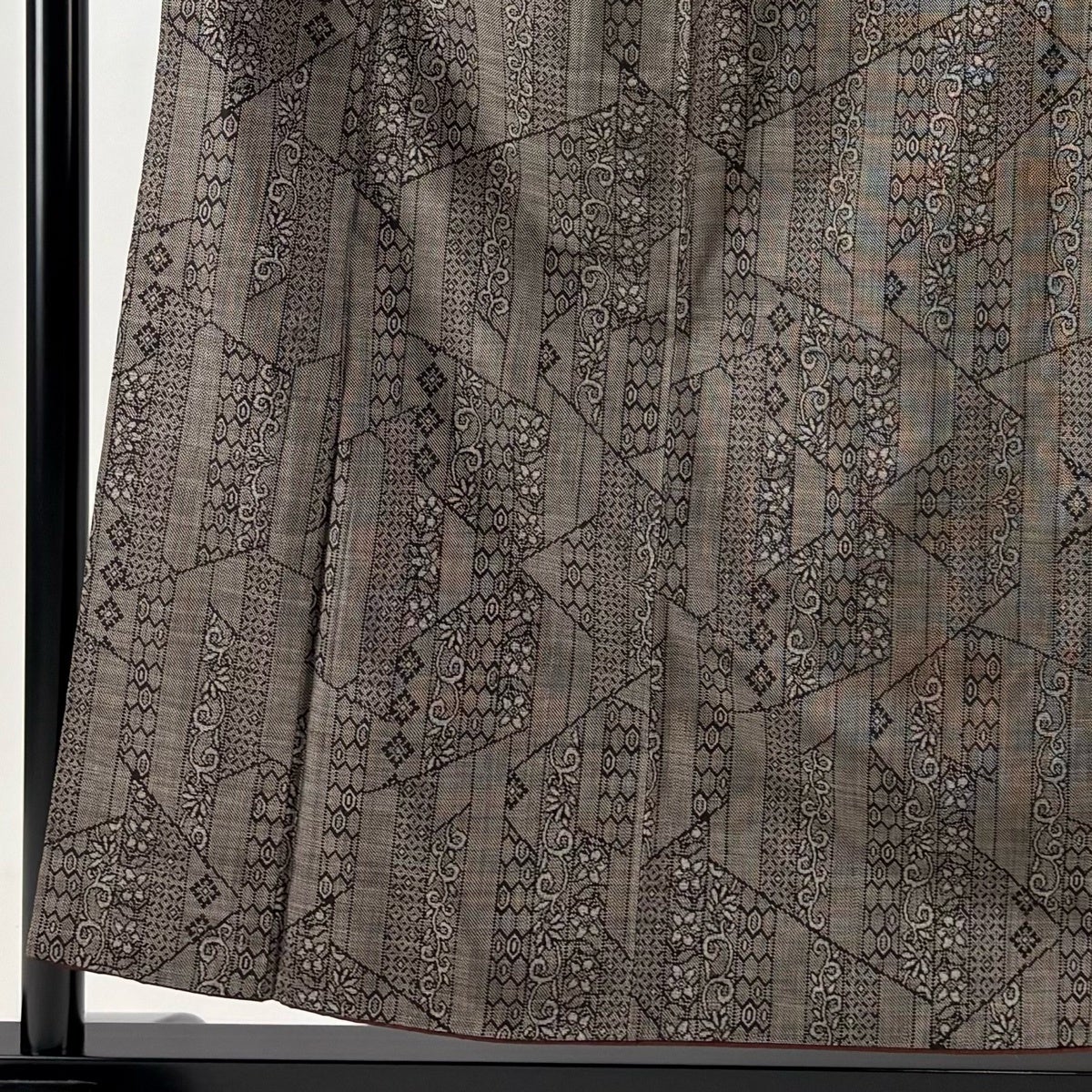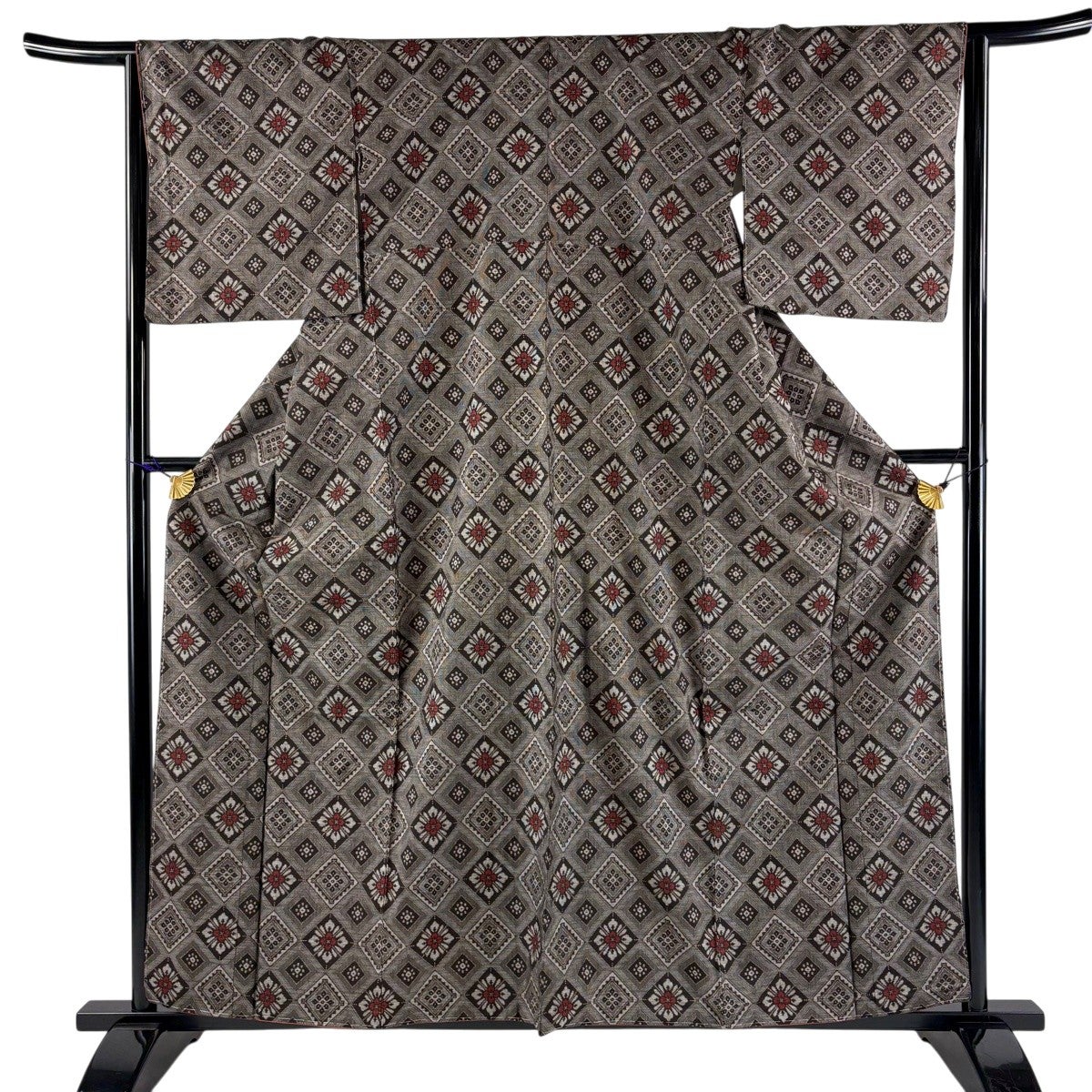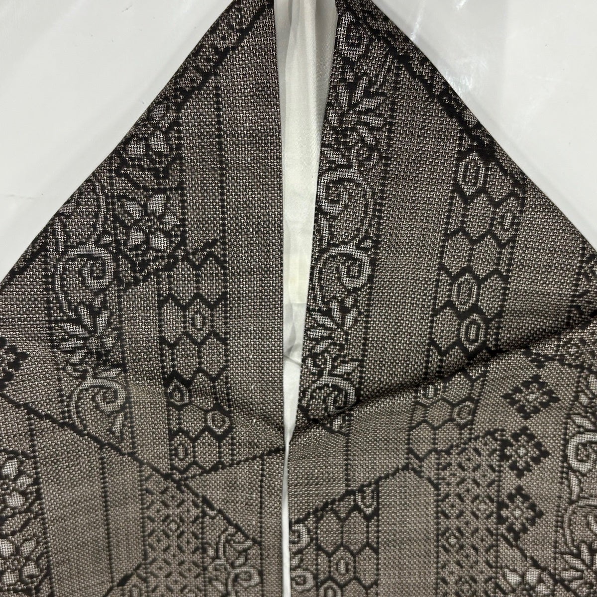紬 身丈152cm 裄丈64cm M 袷 アンサンブル 幾何学 焦茶色 正絹 逸品