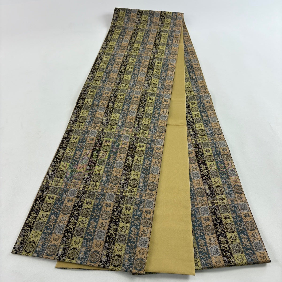 30%OFF 袋帯 秀品 証紙あり 人物 馬 金糸 焦茶色 お太鼓柄 正絹 K30