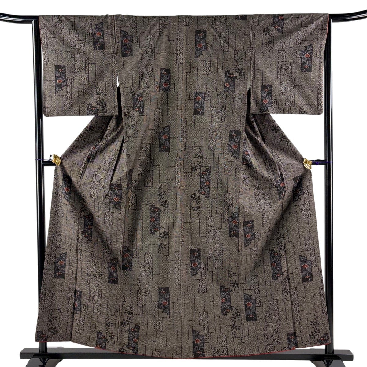 【美品】 紬 身丈158.5cm 裄丈64cm M 袷 花 井桁 焦茶色 正絹 名品