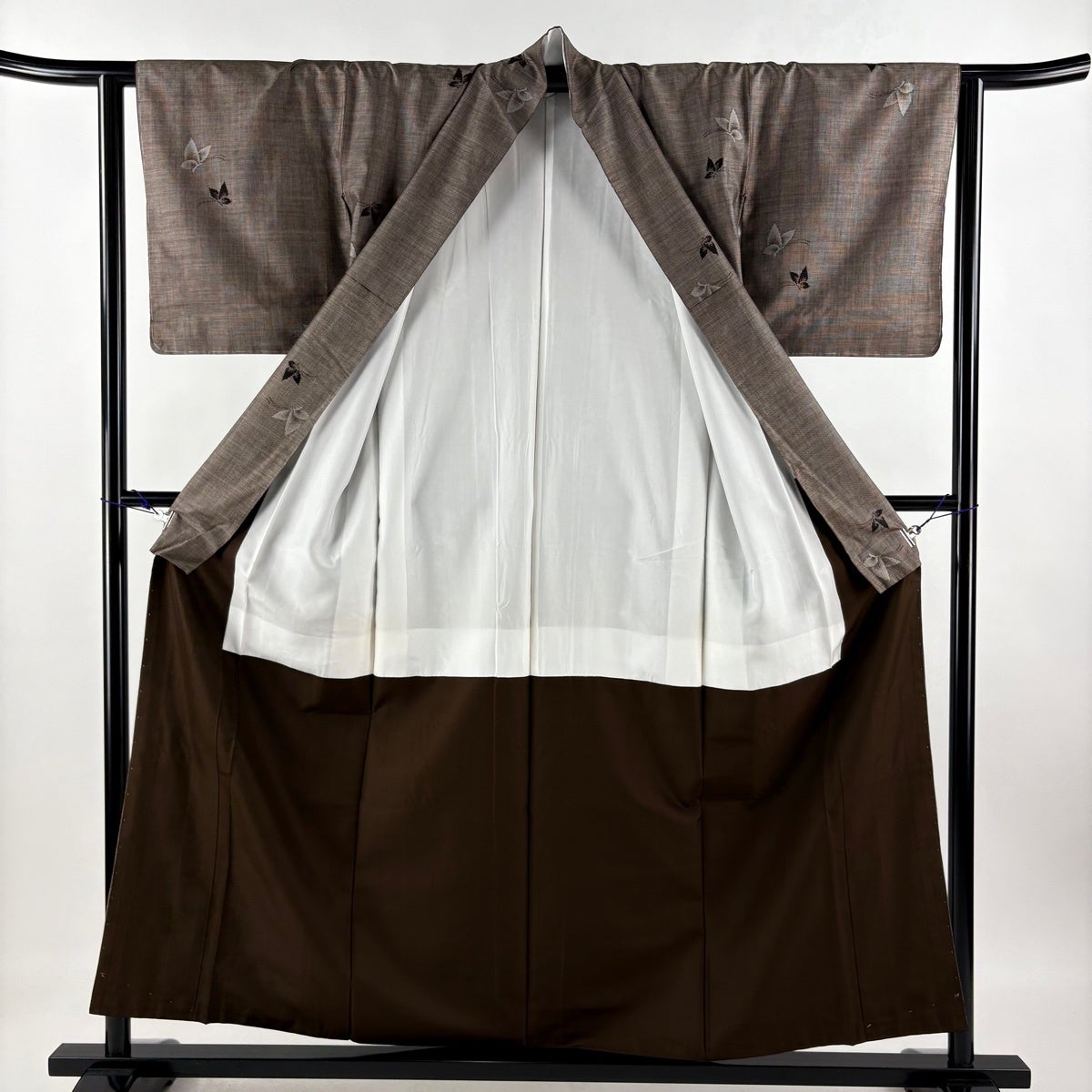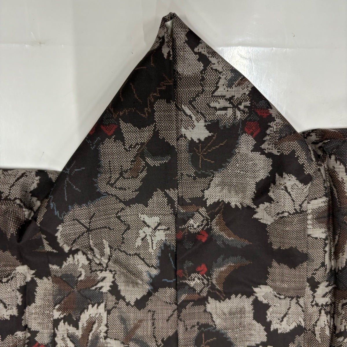 【美品】 紬 身丈161.5cm 裄丈65cm M 袷 葉柄 焦茶色 正絹 秀品
