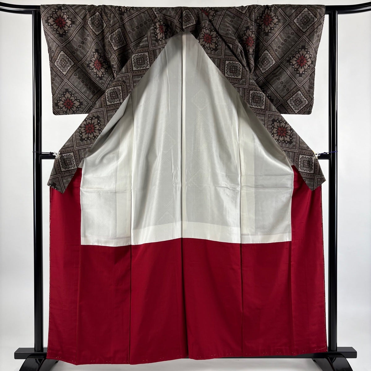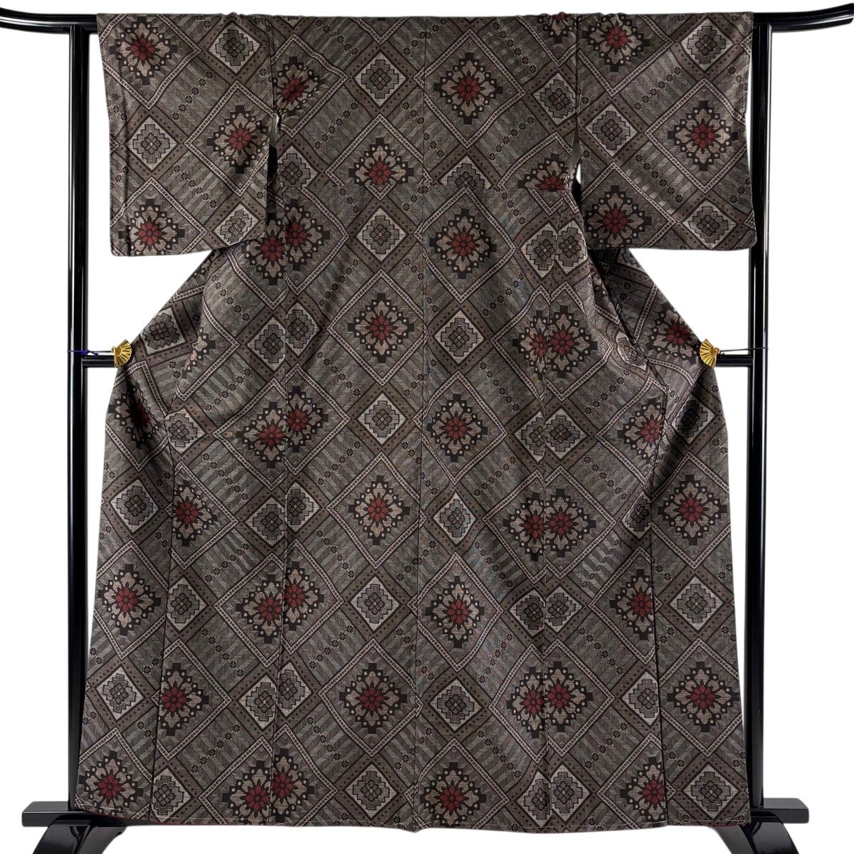 【美品】 紬 身丈161cm 裄丈63cm S 袷 菱 花 焦茶色 正絹 秀品