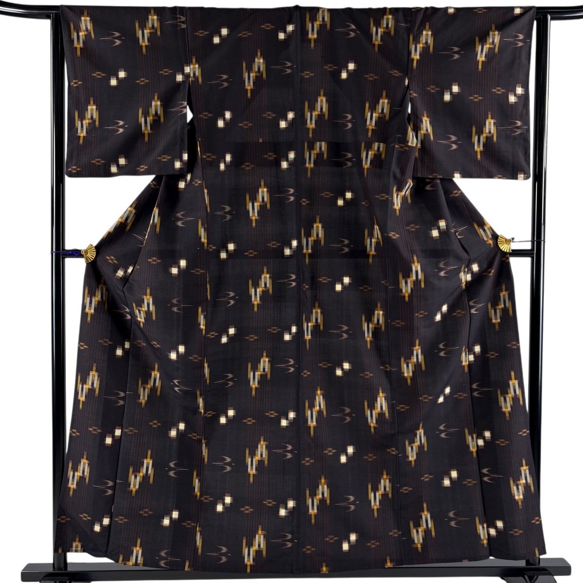 紬 身丈158.5cm 裄丈63cm S 袷 色紙 幾何学模様 焦茶色 正絹 名品