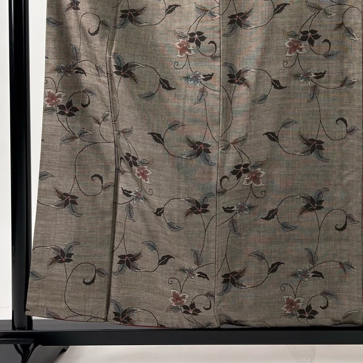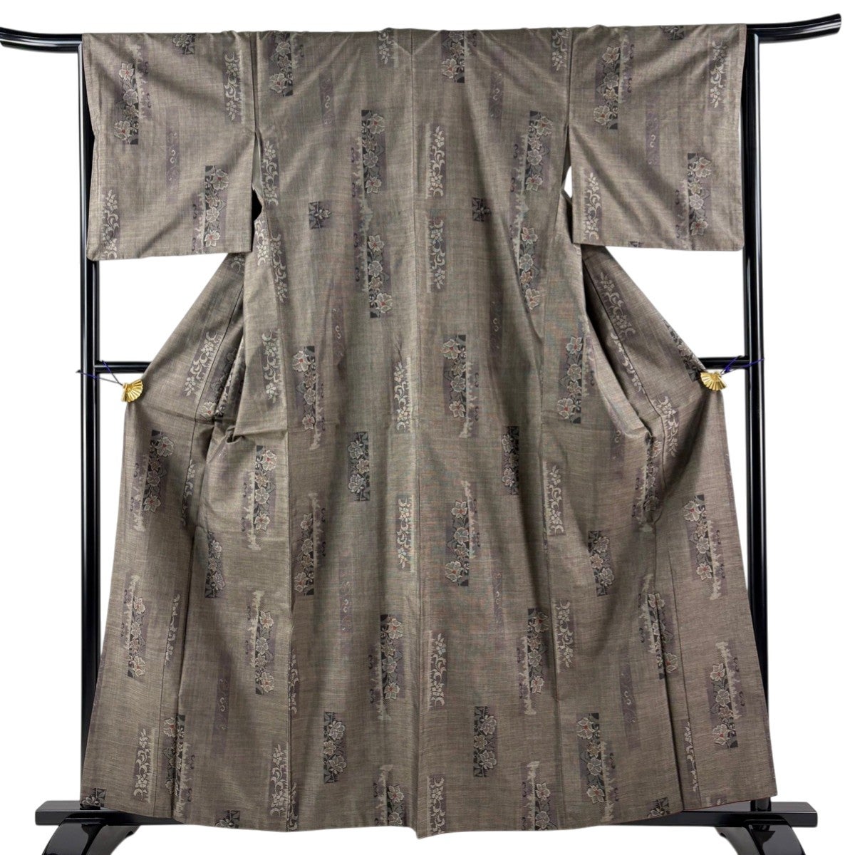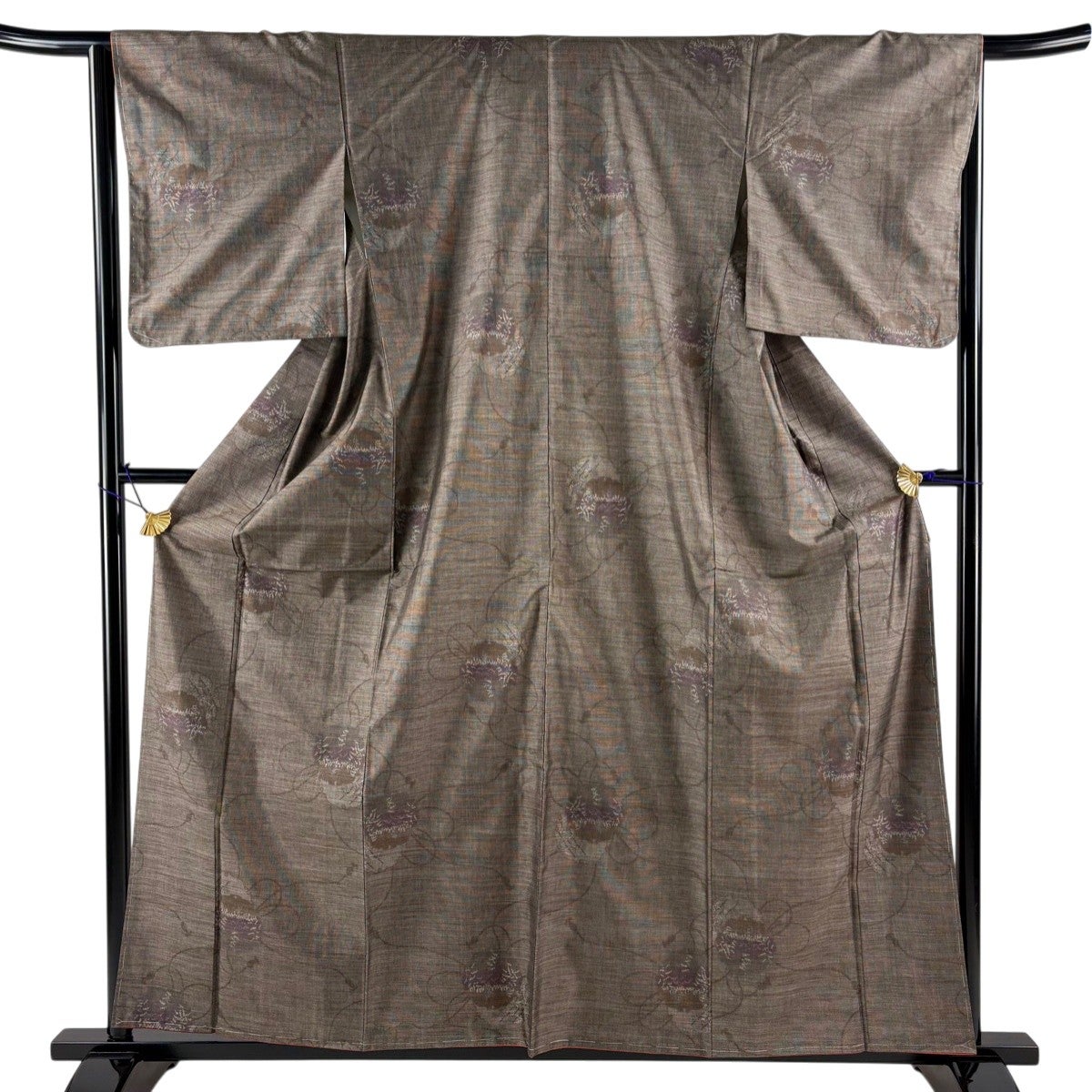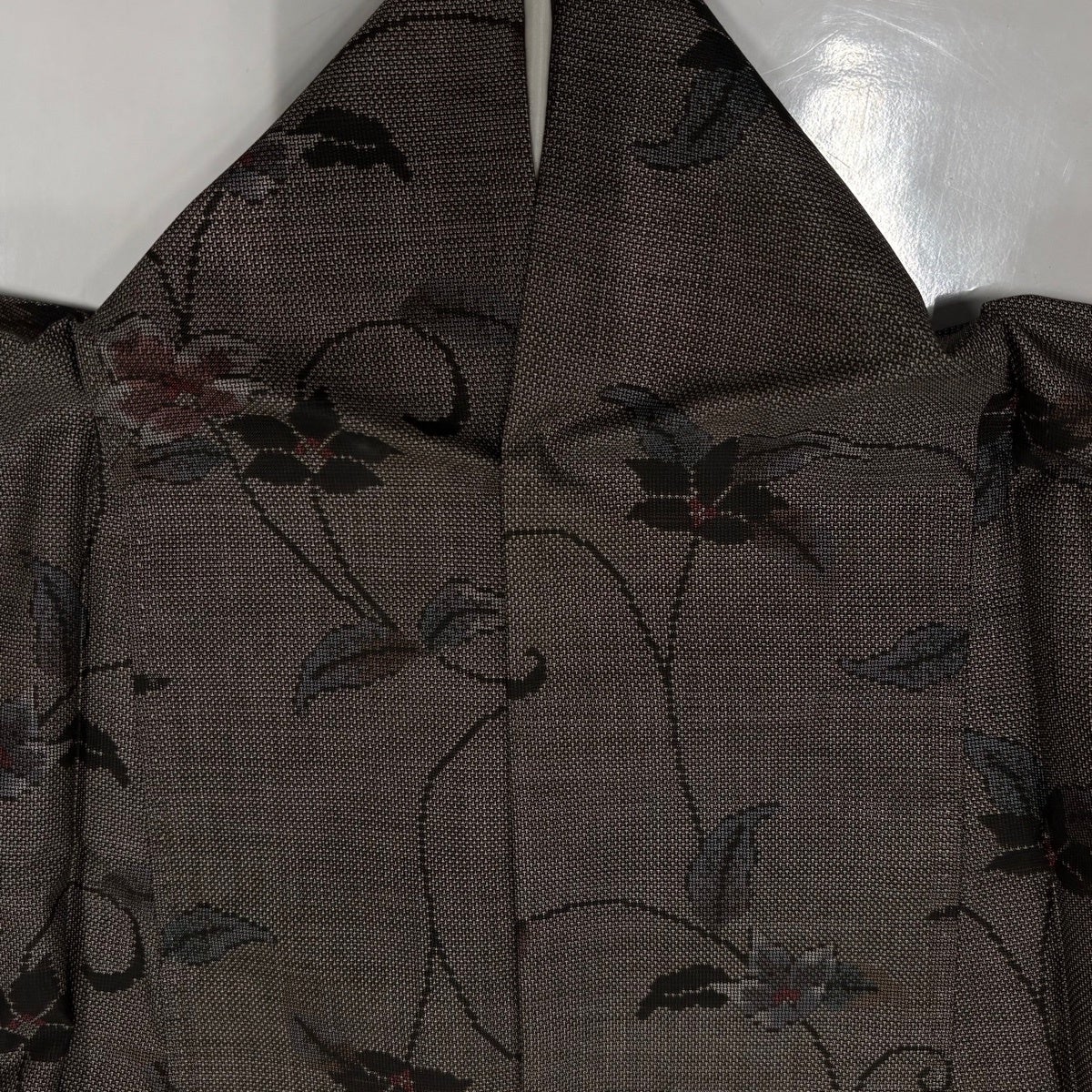 紬 身丈168.5cm 裄丈66cm M 袷 草花 幾何学模様 焦茶色 正絹 秀品